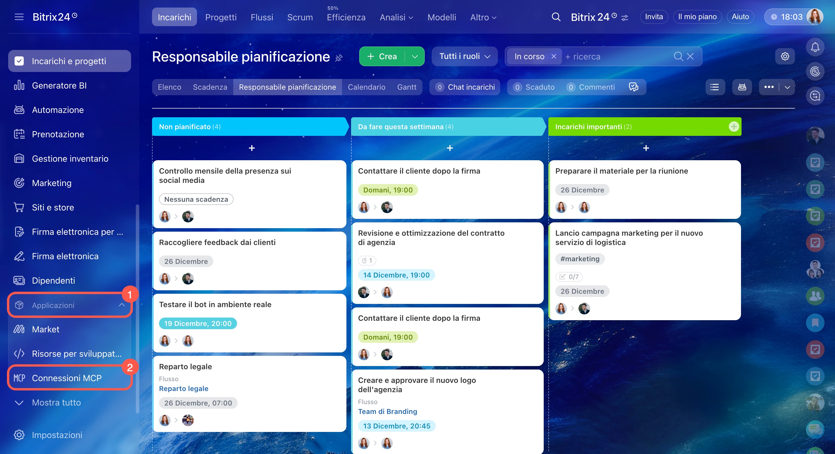 - Con il server MCP, puoi collegare Bitrix24 a sistemi IA esterni come ChatGPT, permettendoti di gestire gli incarichi direttamente dalla chat con un assistente virtuale.