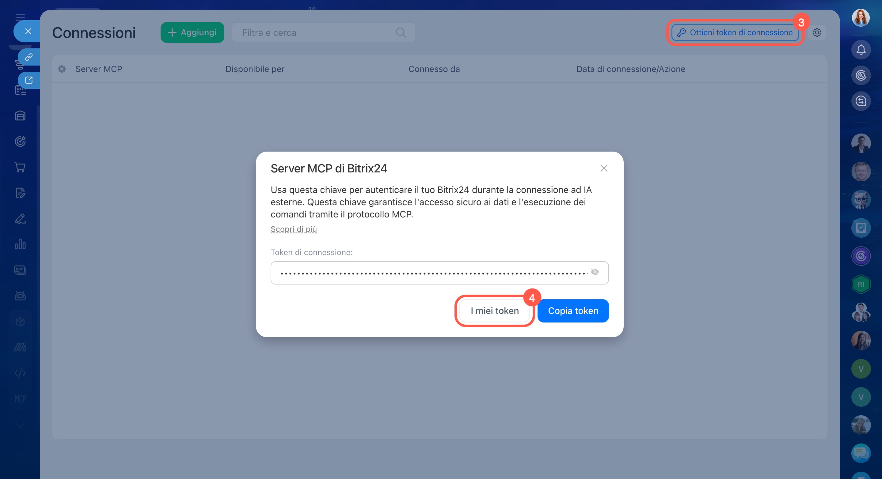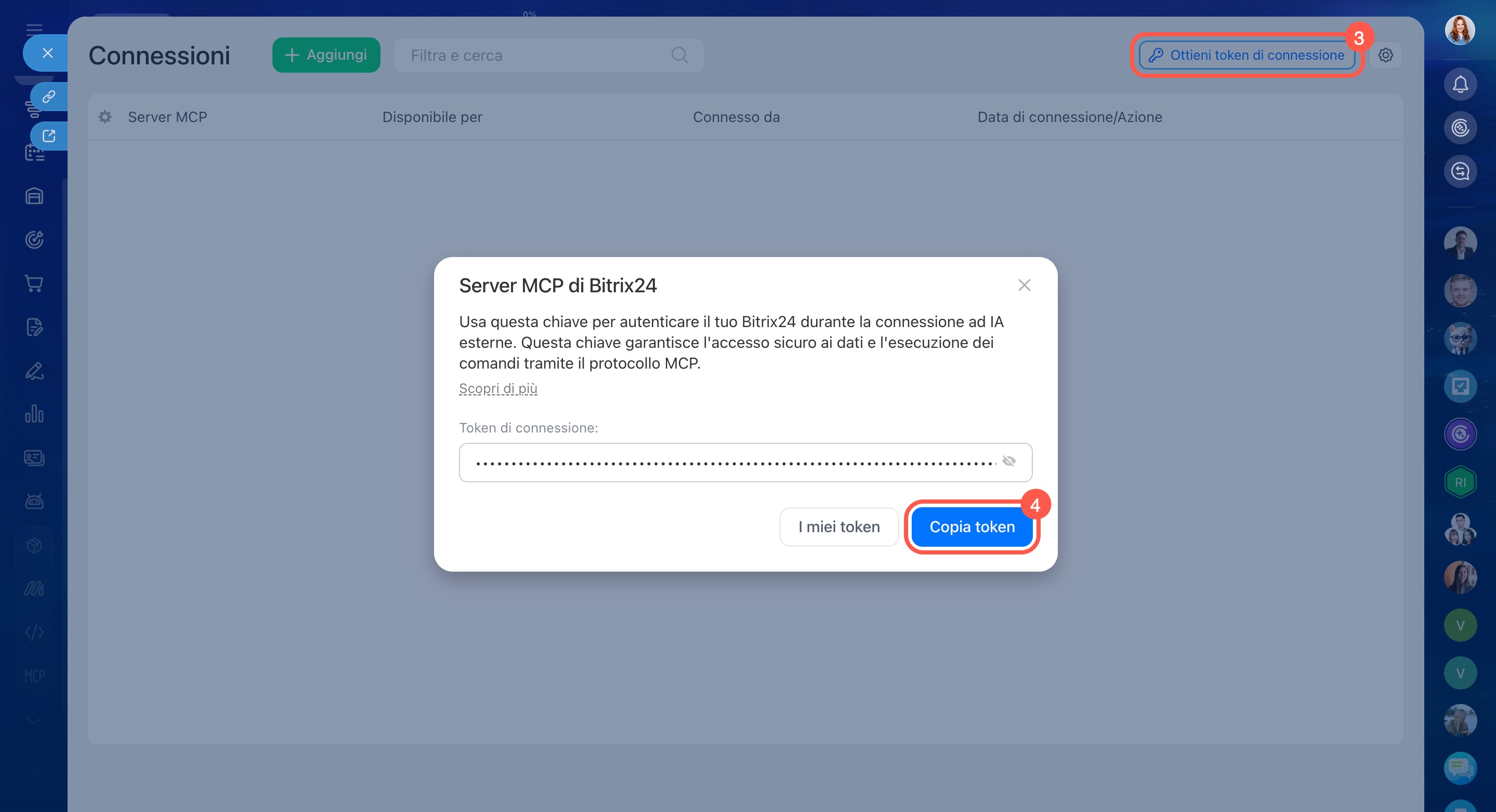 https://mcp.bitrix24.com/mcp/. - Per configurare l'integrazione tramite token, vai su Applicazioni > Connessioni MCP > Ottieni token di connessione > Copia token e usalo per completare la configurazione.
