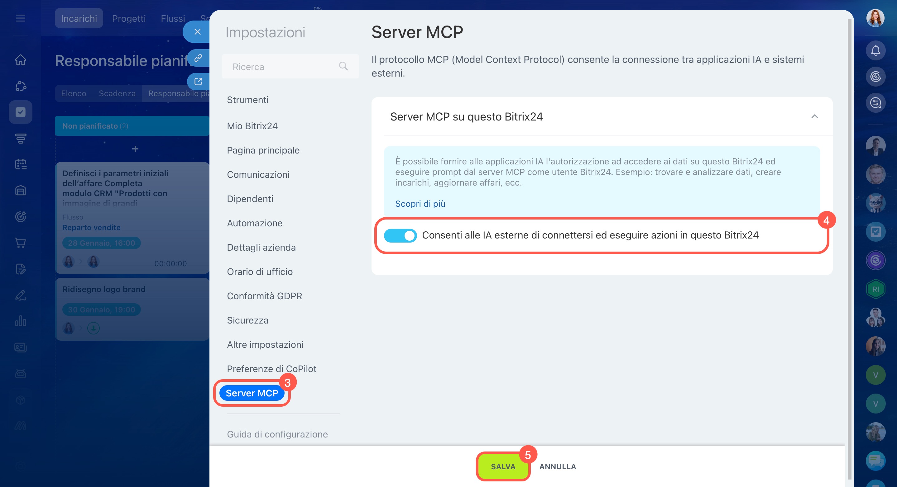 - Nella sezione Server MCP su questo Bitrix24, attiva l'opzione Consenti alle IA esterne di connettersi ed eseguire azioni in questo Bitrix24.