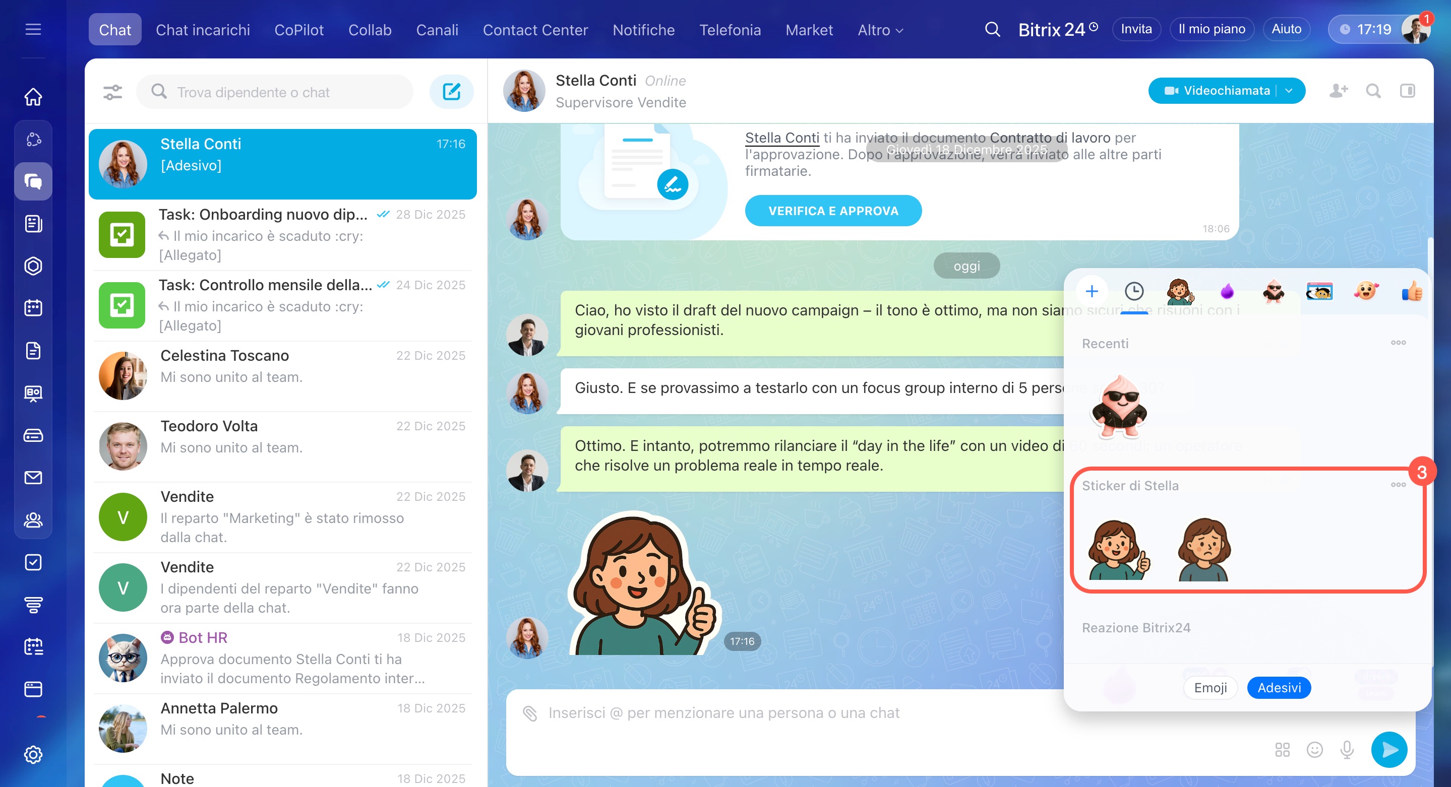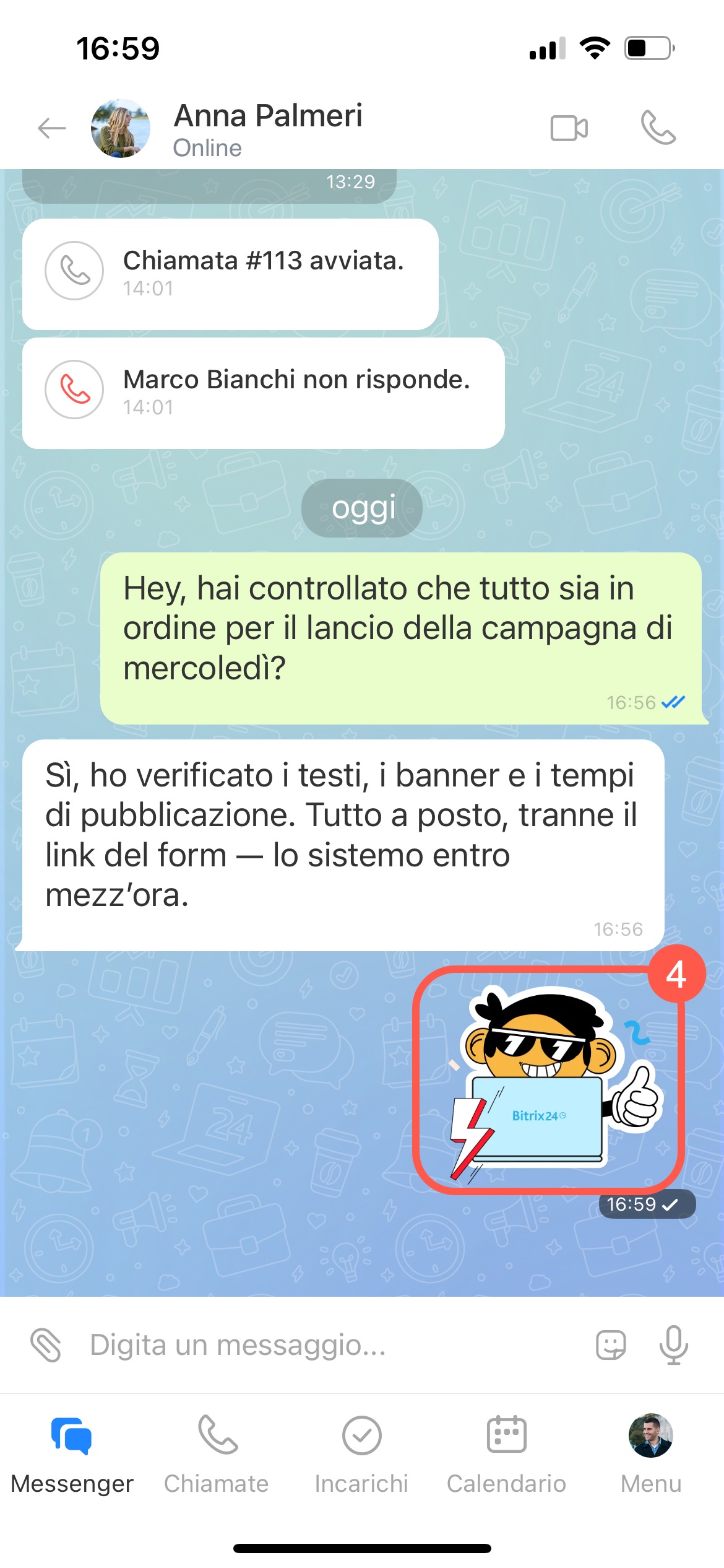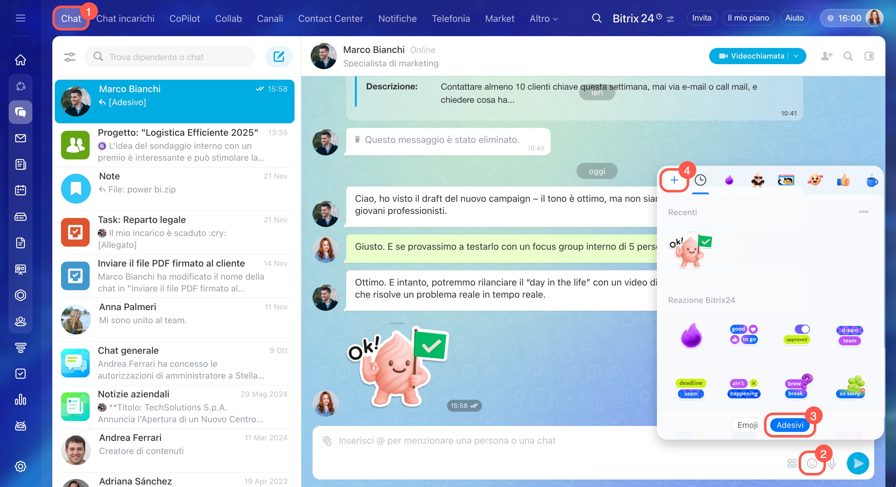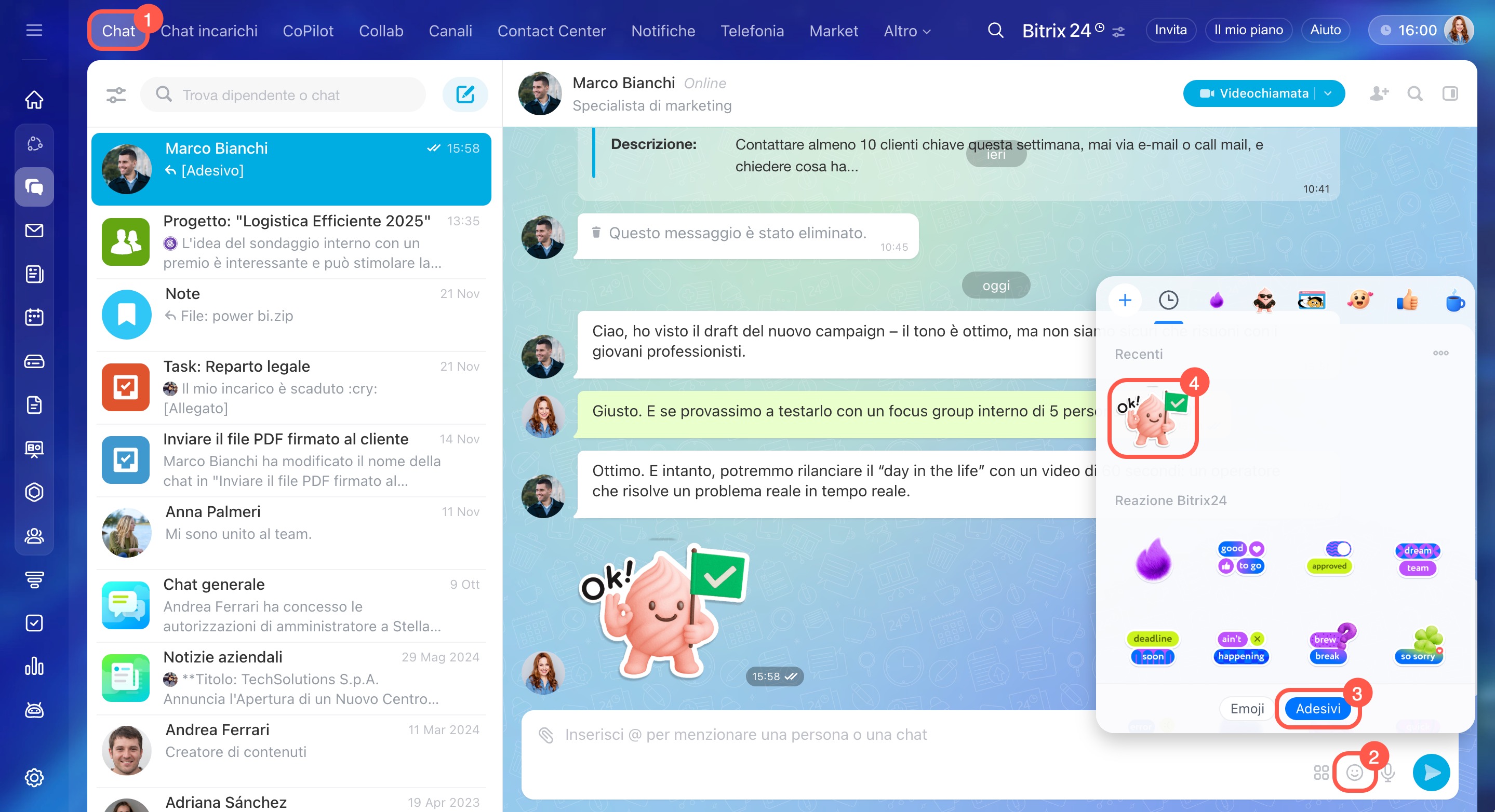 Nel Messenger di Bitrix24 puoi usare gli adesivi: un modo rapido e intuitivo per animare le conversazioni di lavoro. Gli adesivi ti permettono di rispondere senza scrivere: puoi inviarne uno al posto di un "ok" o di un "grazie", mostrare supporto a un collega o aggiungere un tocco di emozione alle chat.
