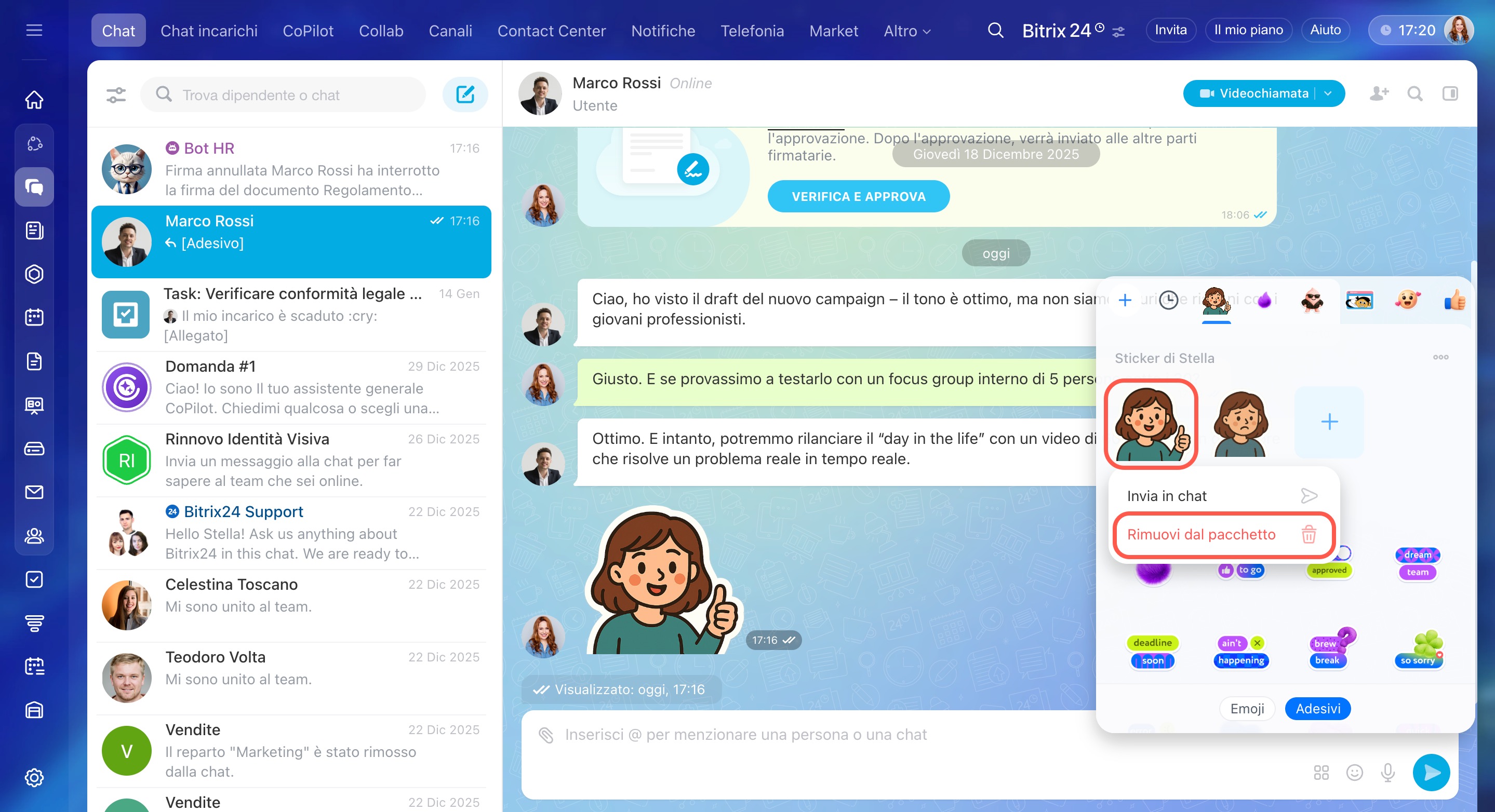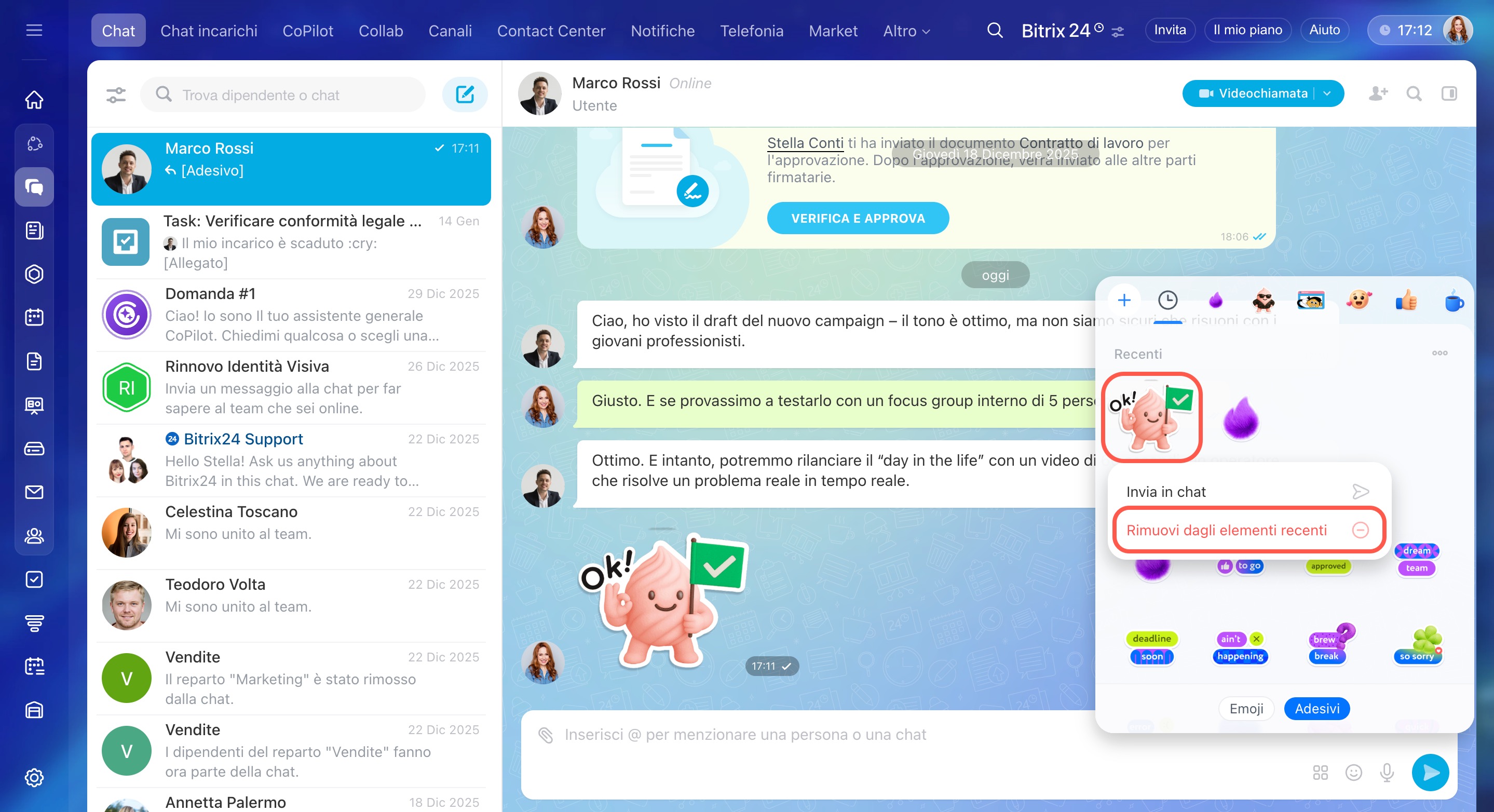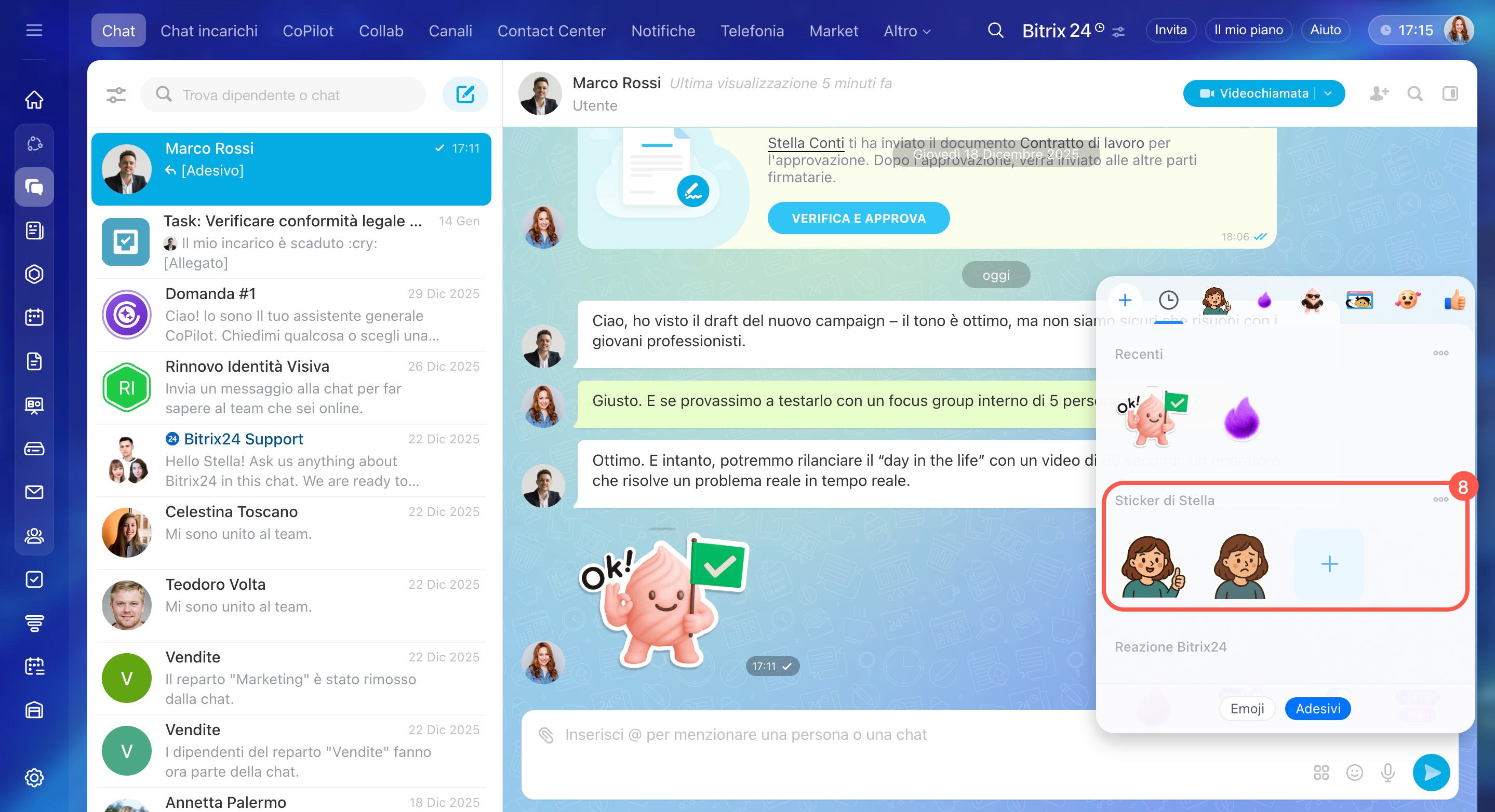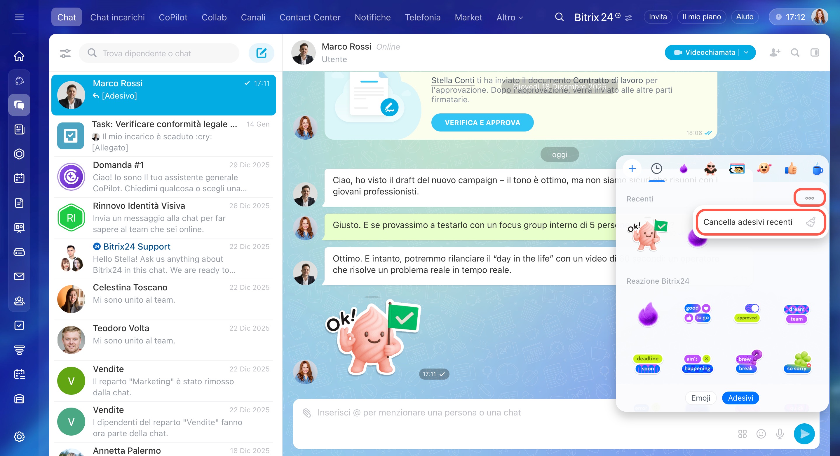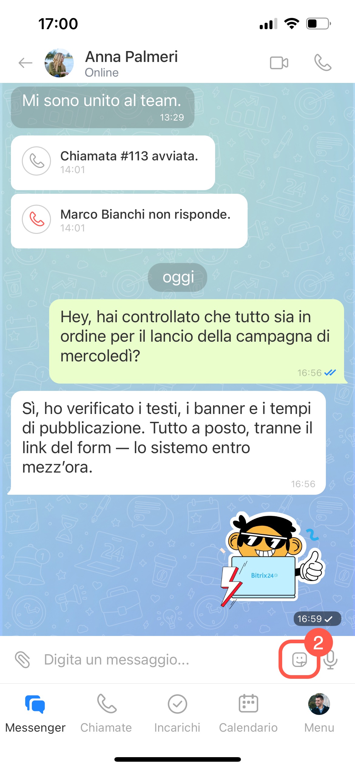 Nel Messenger di Bitrix24 puoi usare gli adesivi: un modo rapido e intuitivo per animare le conversazioni di lavoro. Gli adesivi ti permettono di rispondere senza scrivere: puoi inviarne uno al posto di un "ok" o di un "grazie", mostrare supporto a un collega o aggiungere un tocco di emozione alle chat.