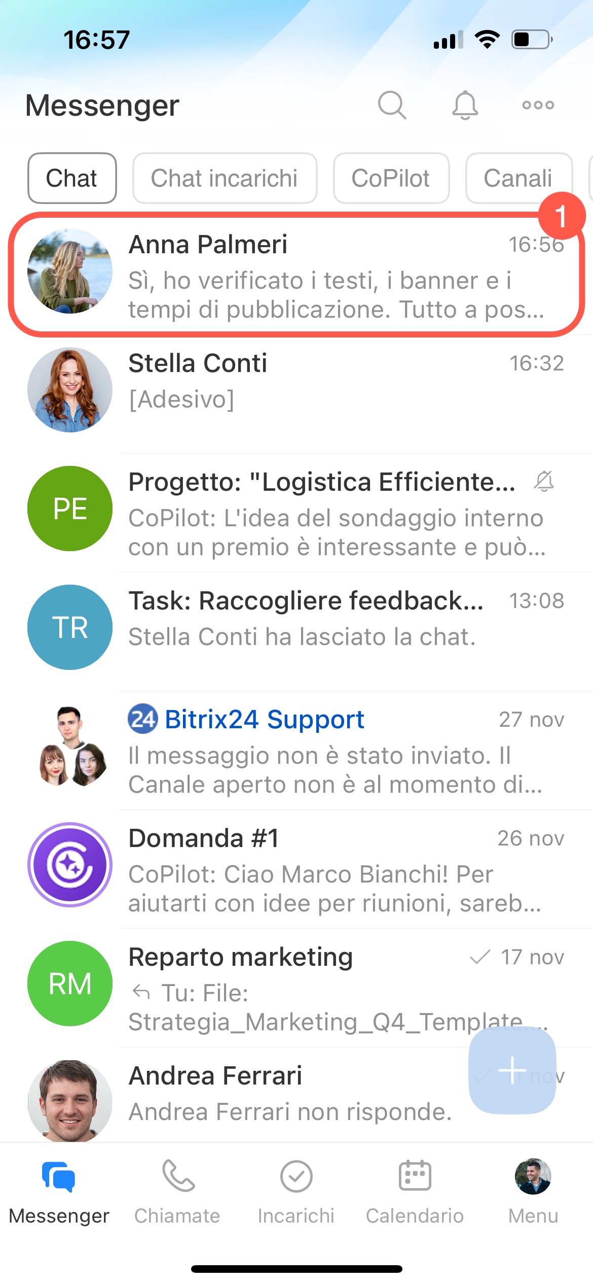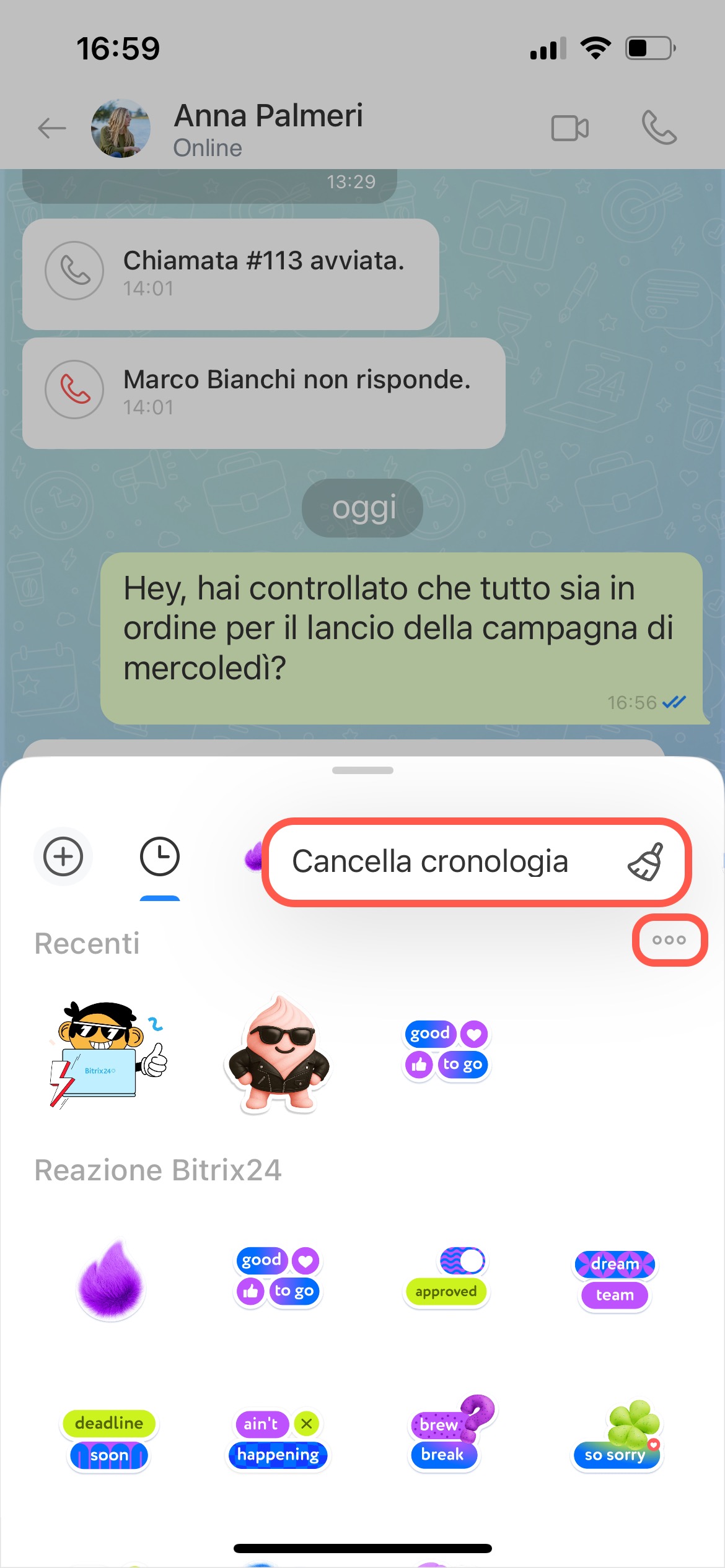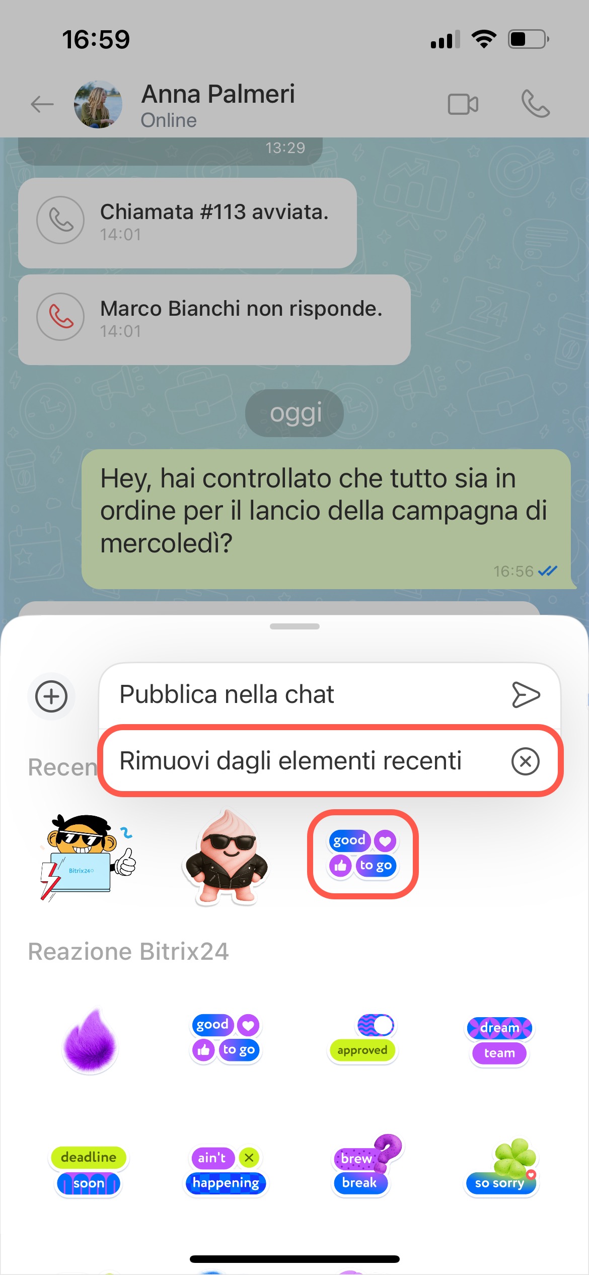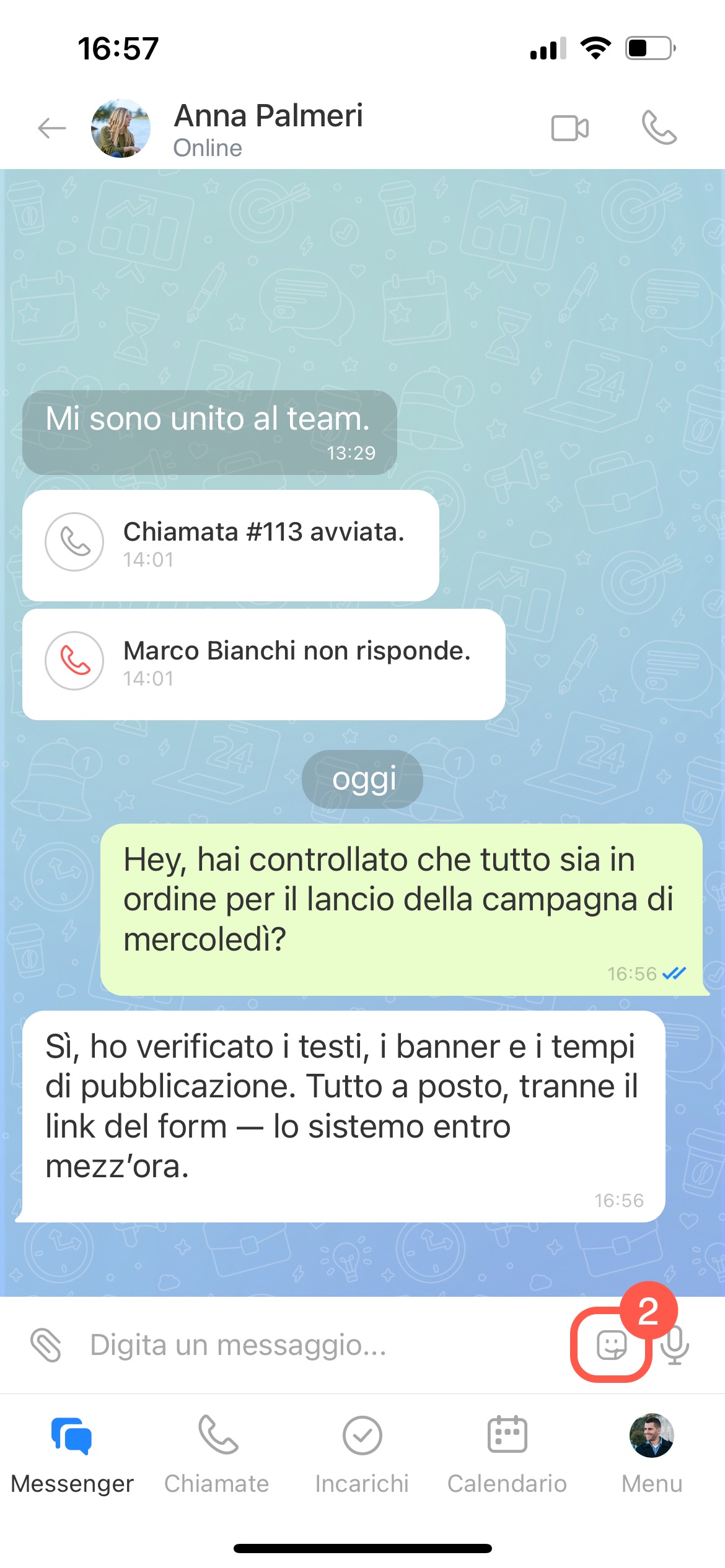 Nel Messenger di Bitrix24 puoi usare gli adesivi: un modo rapido e intuitivo per animare le conversazioni di lavoro. Gli adesivi ti permettono di rispondere senza scrivere: puoi inviarne uno al posto di un "ok" o di un "grazie", mostrare supporto a un collega o aggiungere un tocco di emozione alle chat.