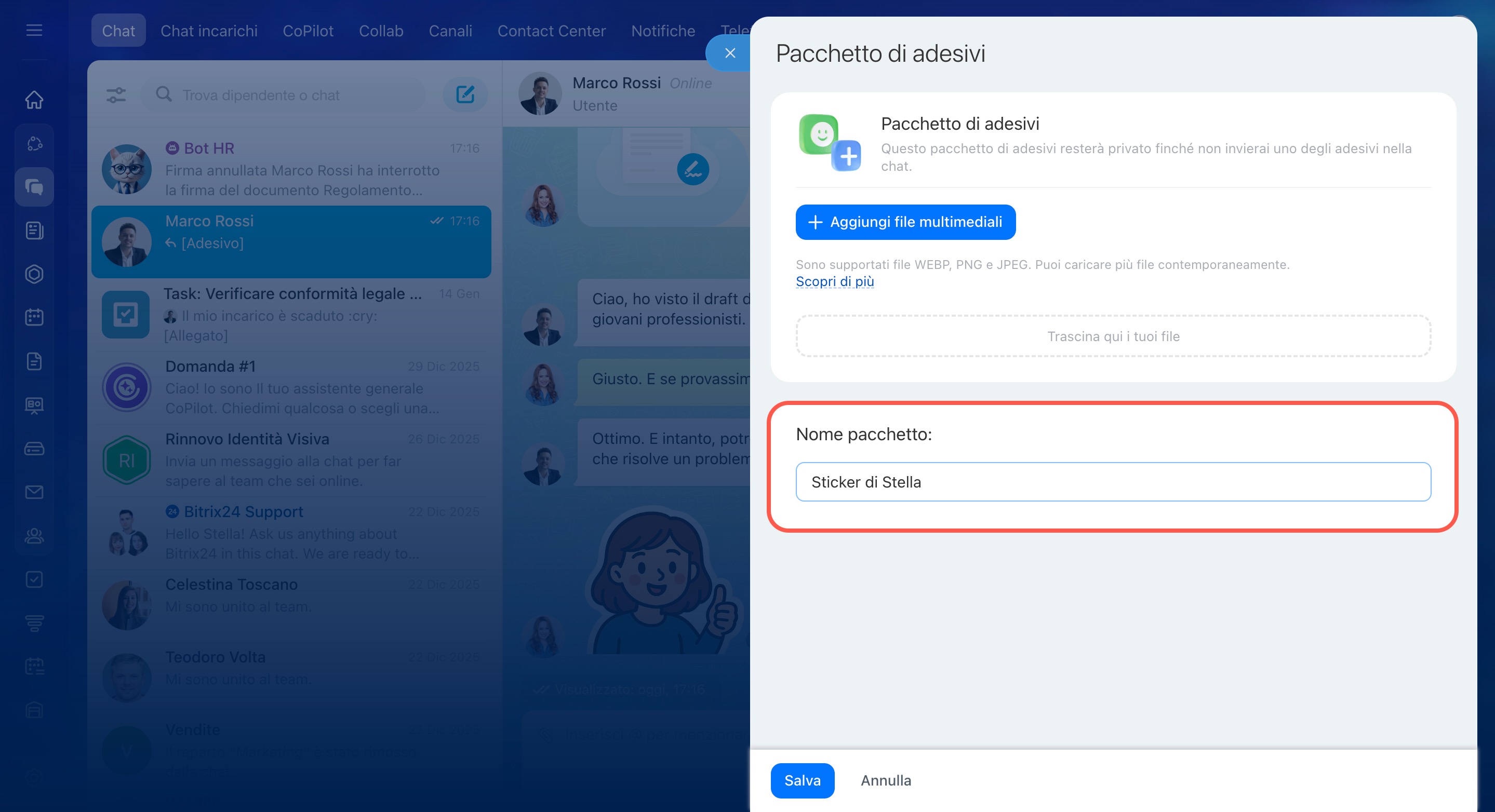 Bitrix24 mette a disposizione pacchetti di adesivi predefiniti, pensati per mantenere uno stile professionale con un tocco di leggerezza. Puoi usarli così come sono oppure arricchire la tua raccolta creando e aggiungendo pacchetti di adesivi personalizzati.