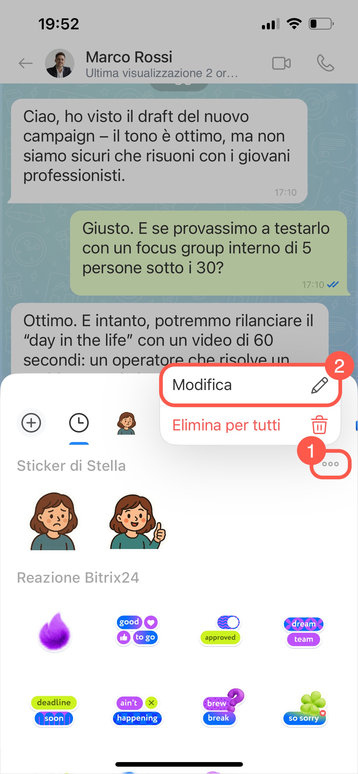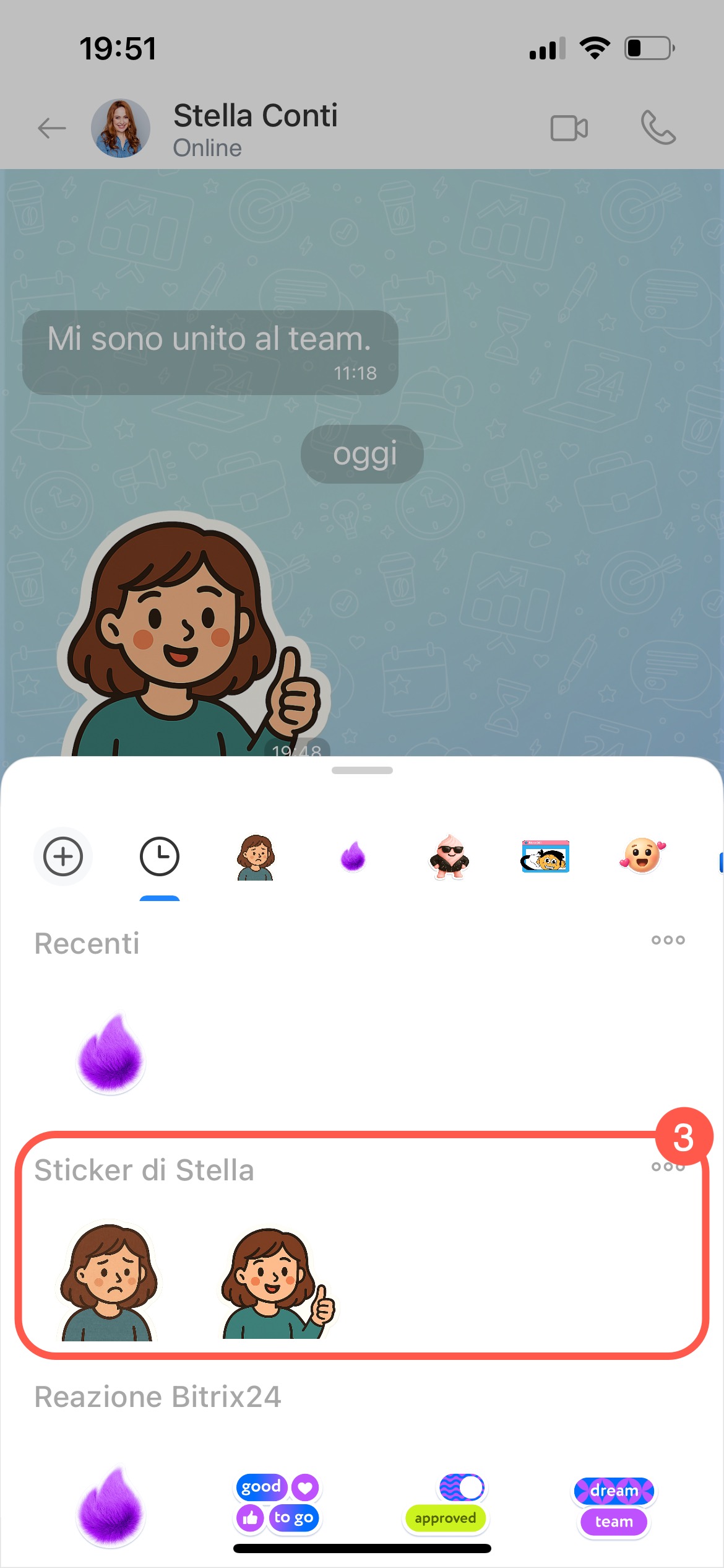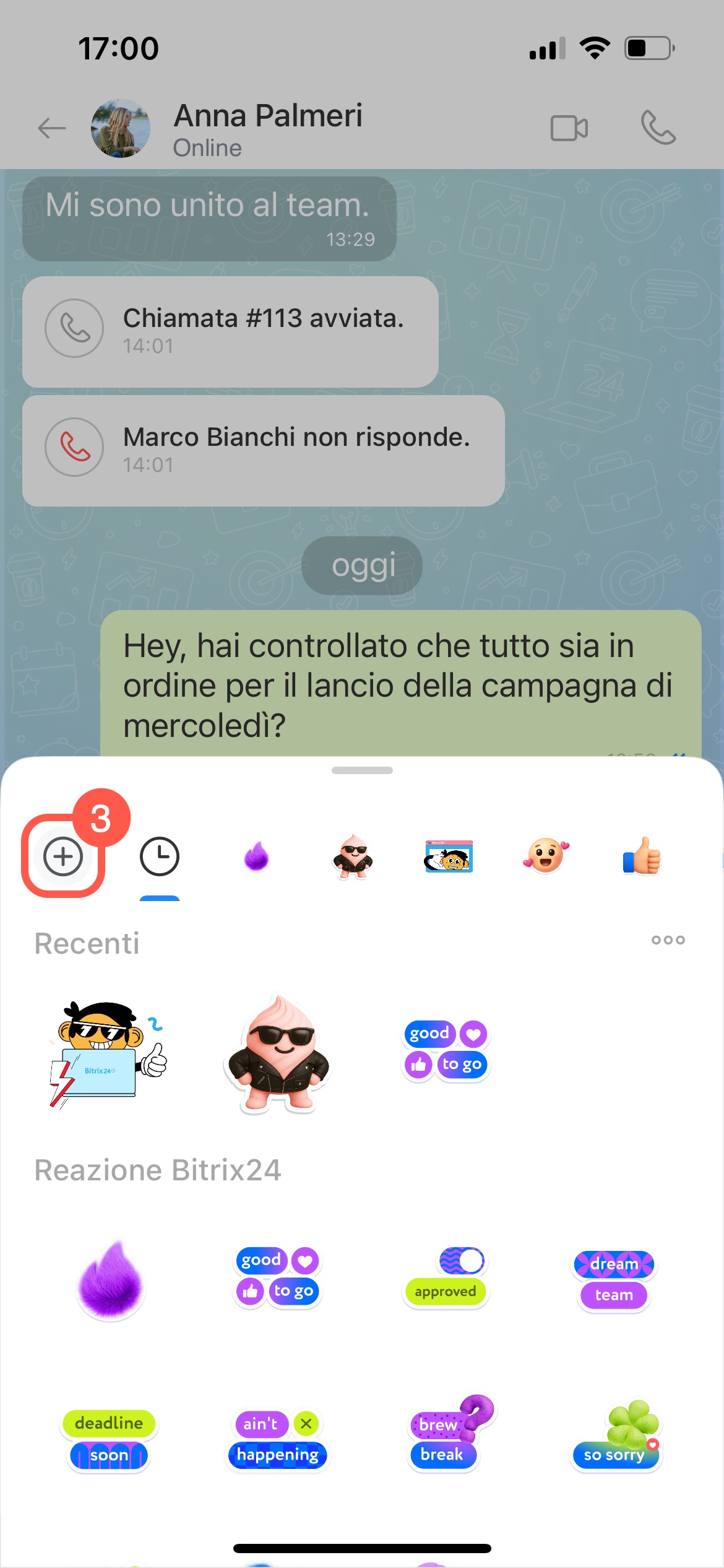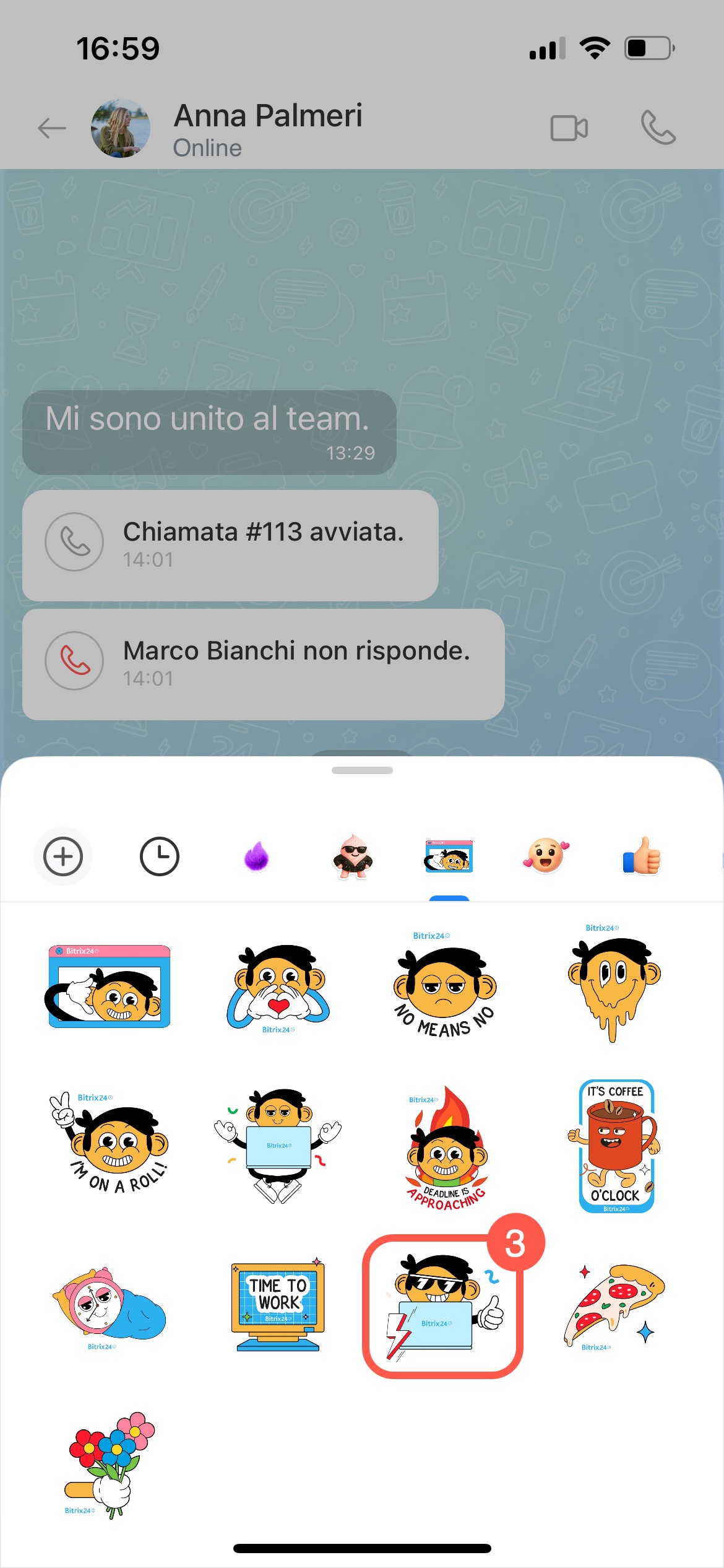 Tutti i dipendenti hanno automaticamente accesso ai pacchetti di adesivi predefiniti di Bitrix24, sia dalla versione web che dall’app mobile.