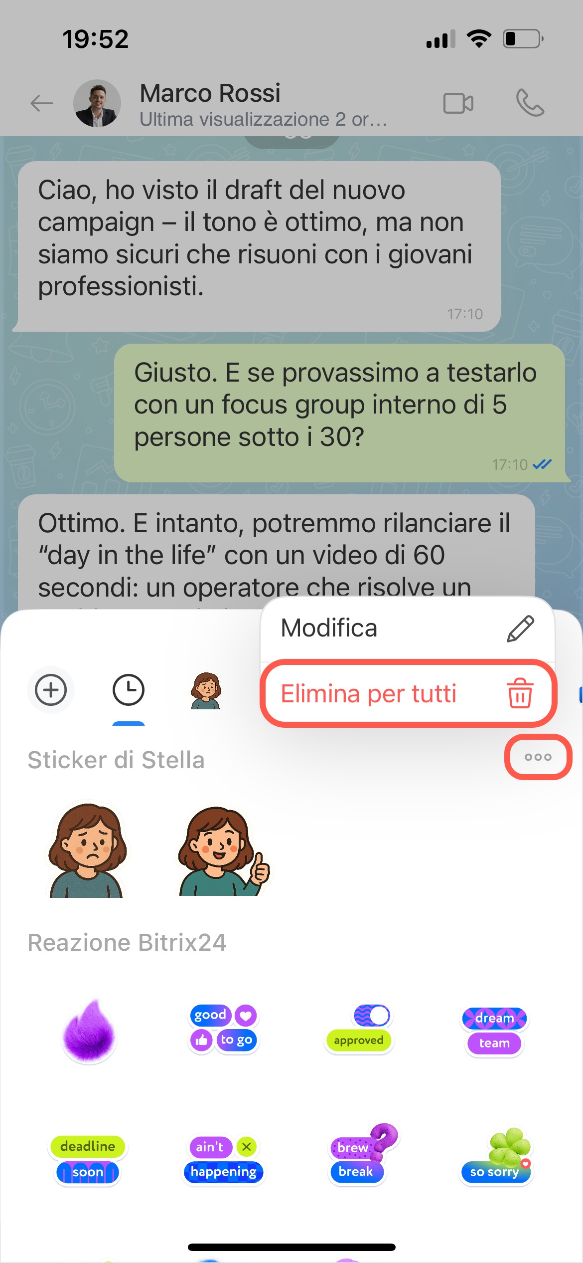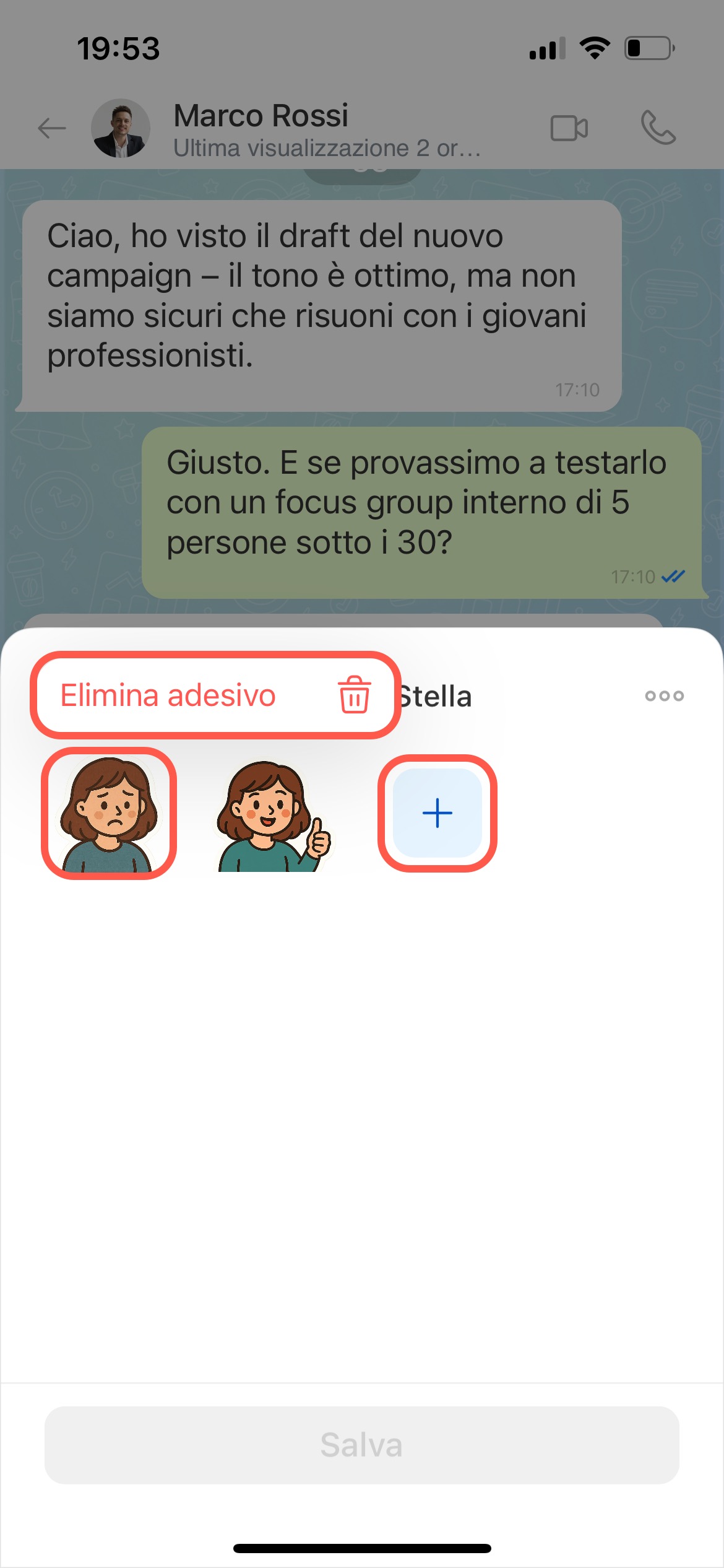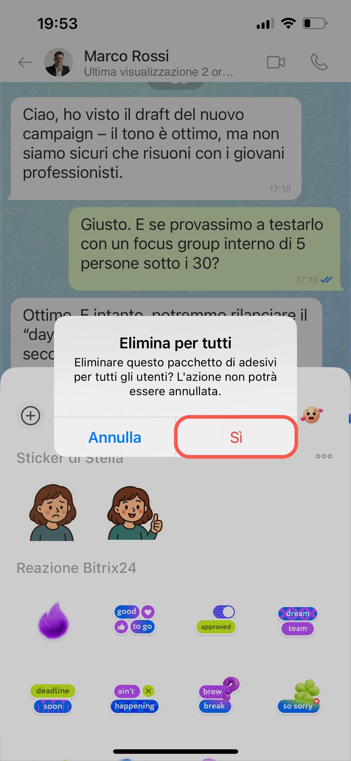- Elimina per tutti: rimuove completamente il pacchetto di adesivi per tutti gli utenti.