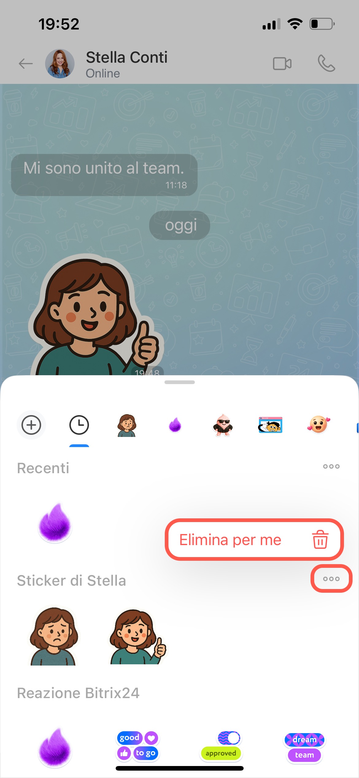Pacchetti di adesivi dei colleghi. Se hai aggiunto pacchetti di adesivi creati dai colleghi, puoi rimuoverli dalla tua collezione toccando Tre punti (...) > Rimuovi da me.