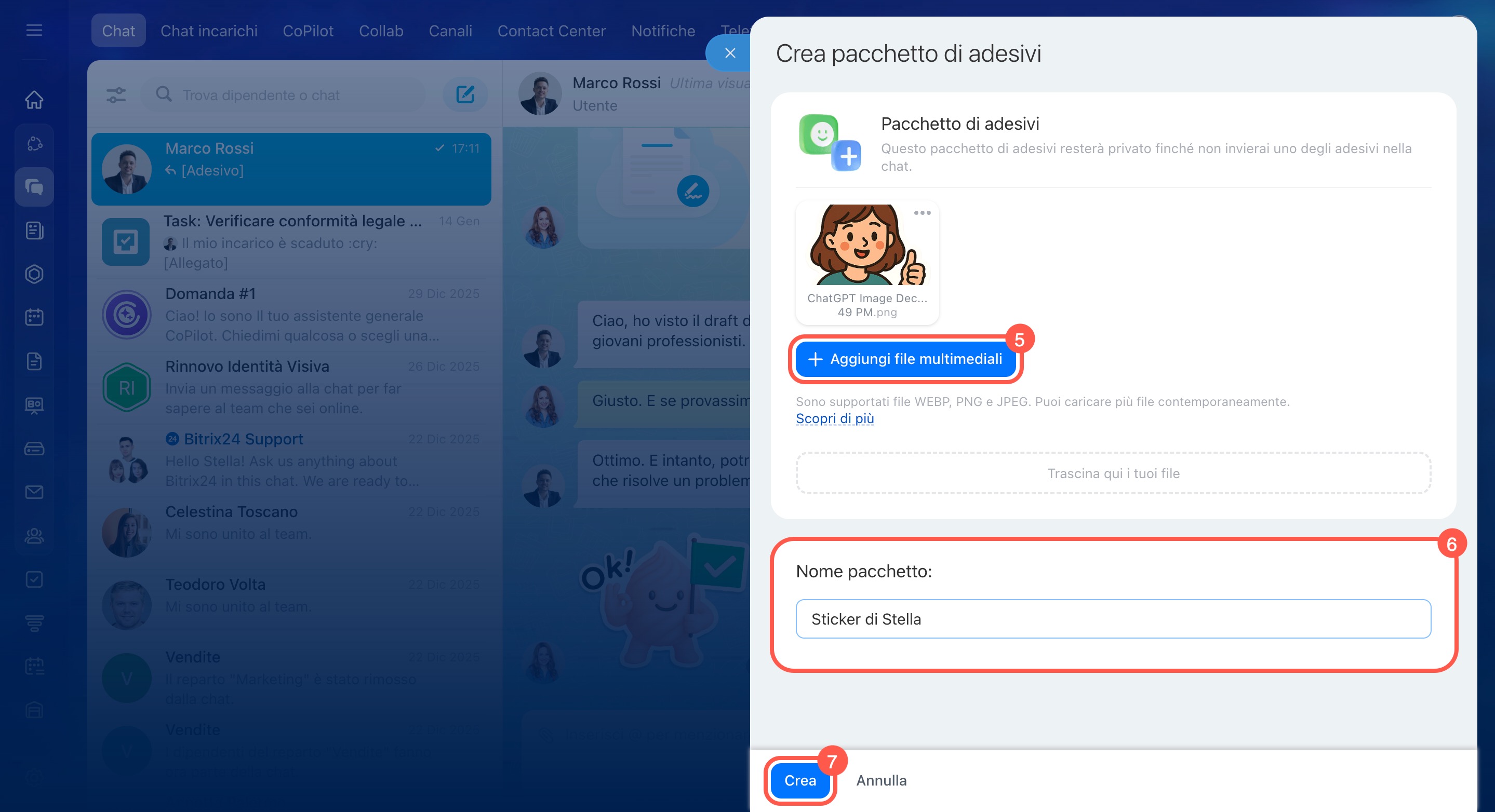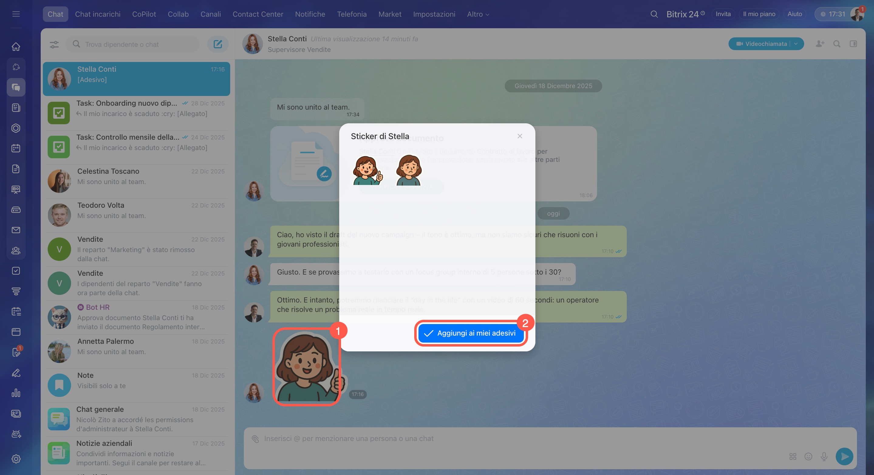 - In Bitrix24 puoi creare pacchetti di adesivi personalizzati. Dopo l’invio di un adesivo in chat, gli altri partecipanti possono aggiungere l’intero pacchetto alla loro collezione.