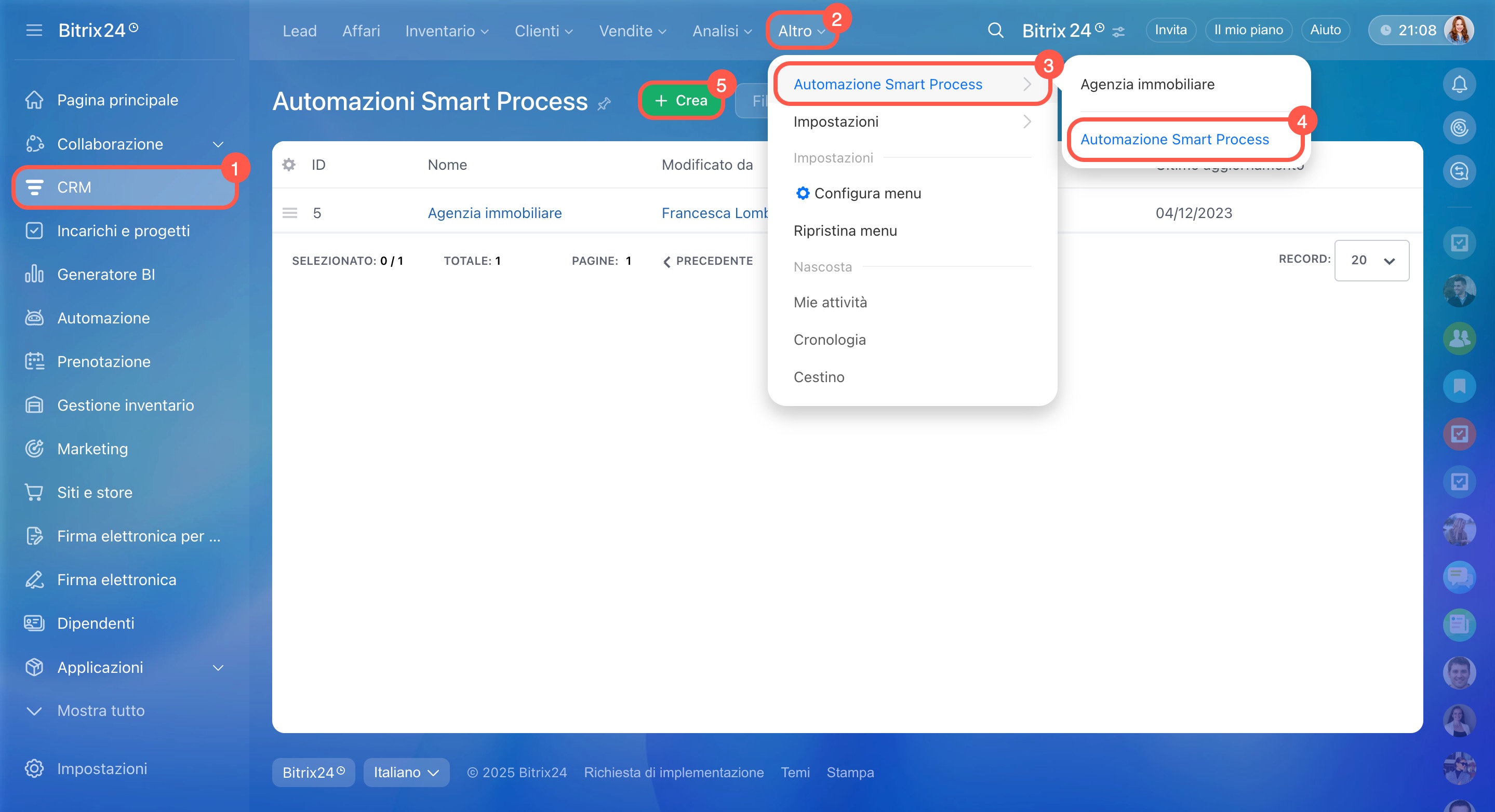 - Vai alla sezione CRM > Altro > Automazione Smart Process.