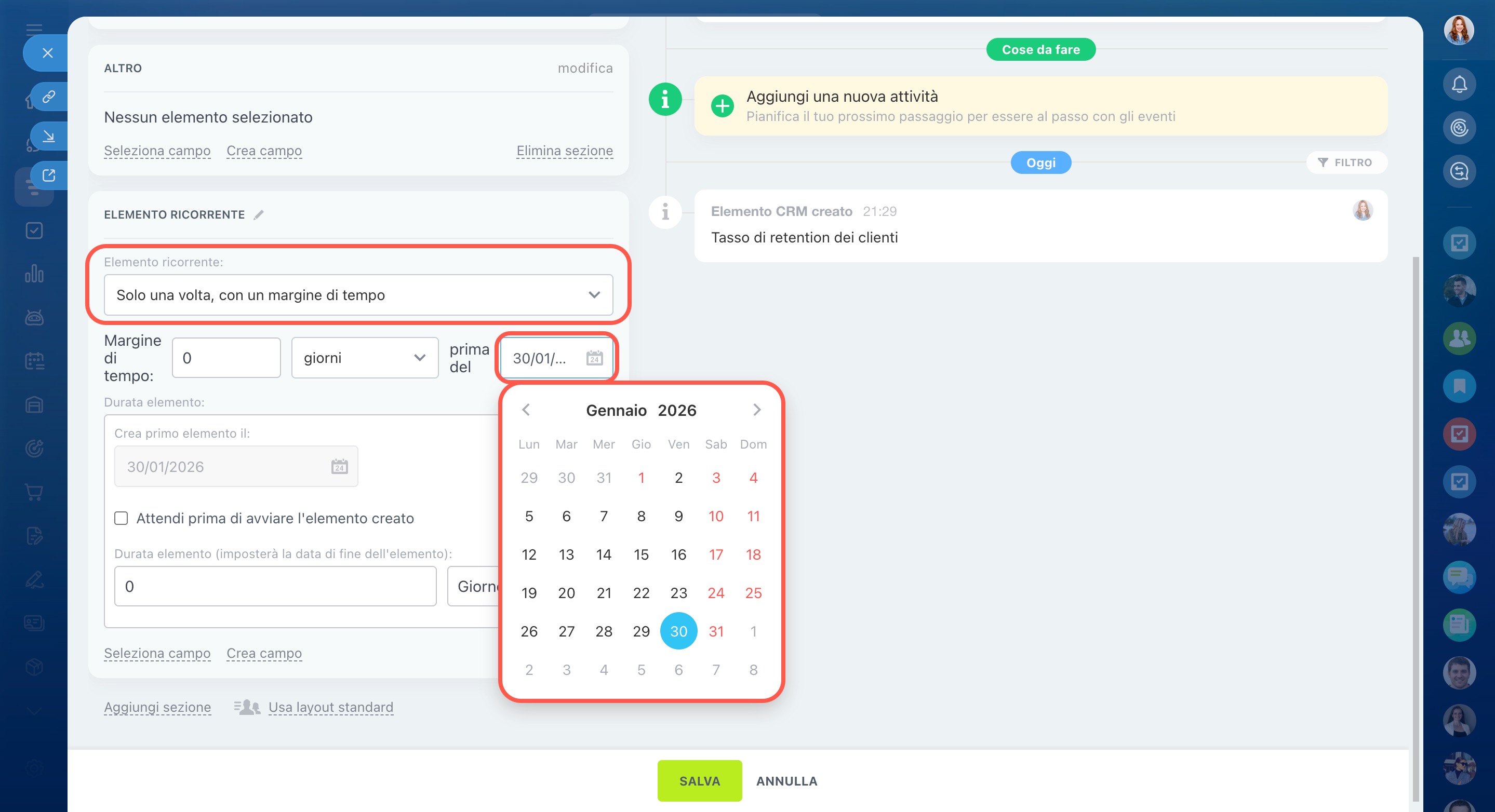 - Solo una volta, con un margine di tempo — il CRM creerà un nuovo elemento una sola volta, nella data specificata.
