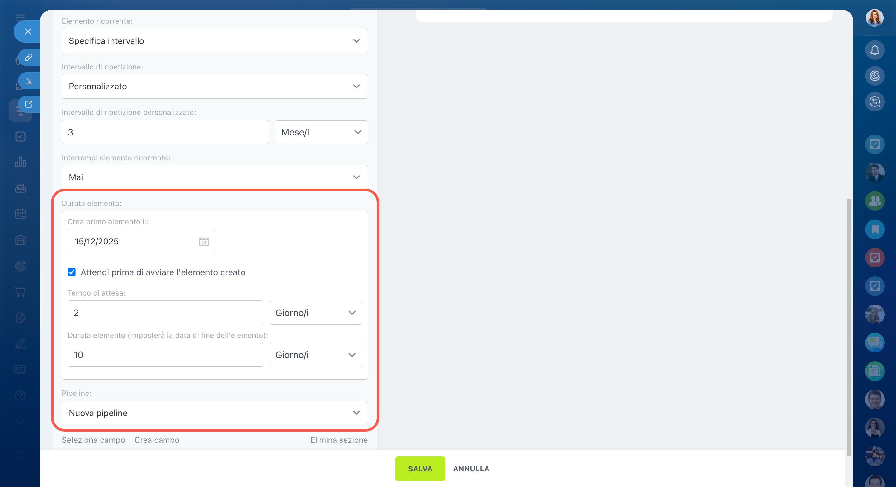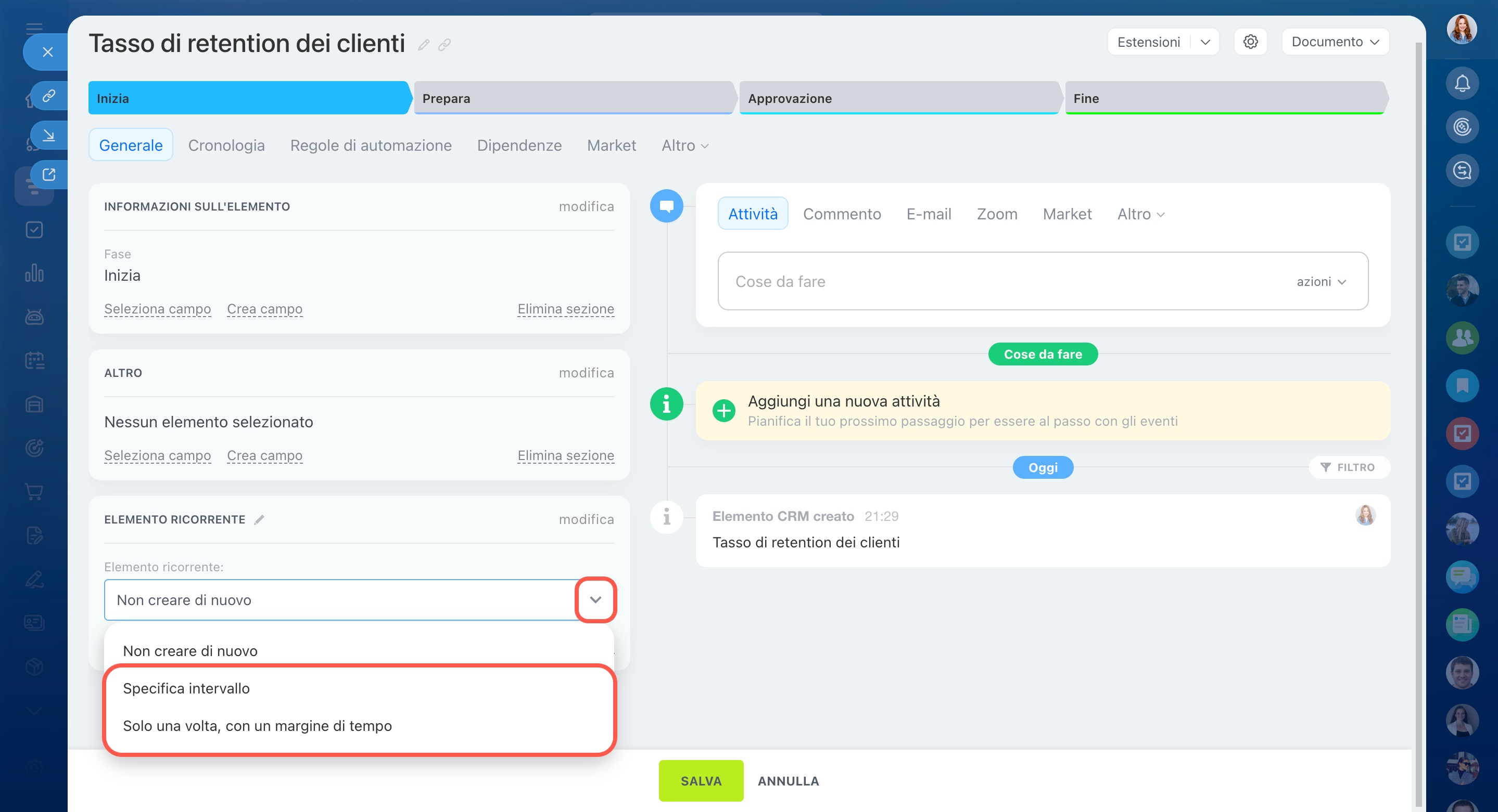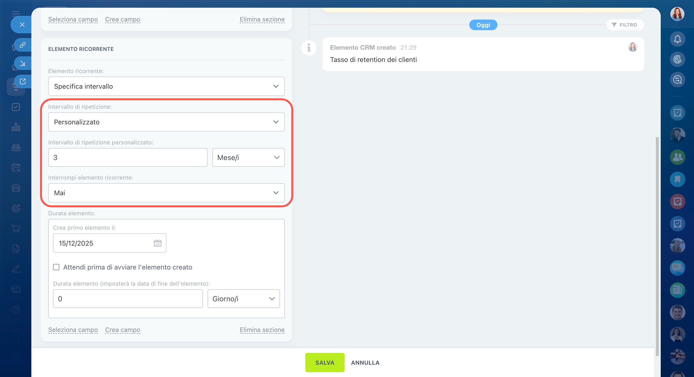 - Specifica intervallo — il CRM crea automaticamente nuovi elementi, ad esempio ogni settimana o mese.