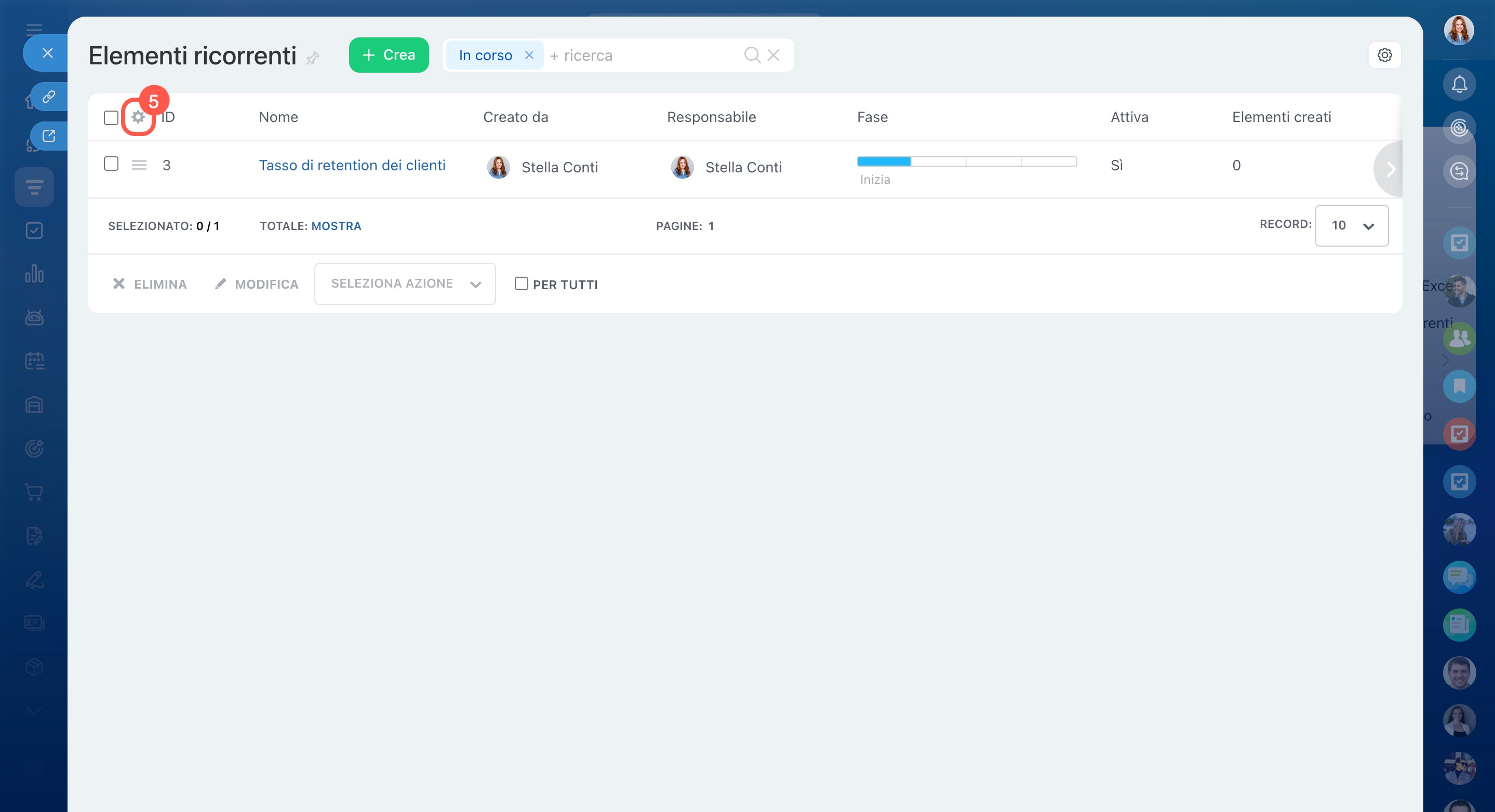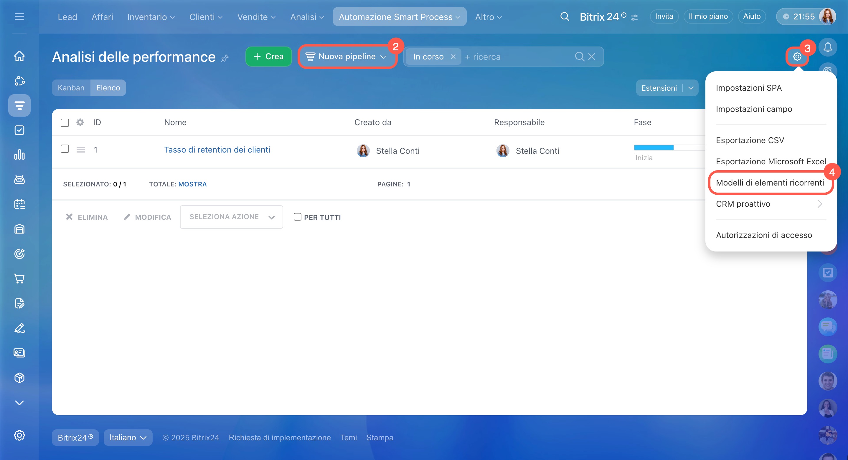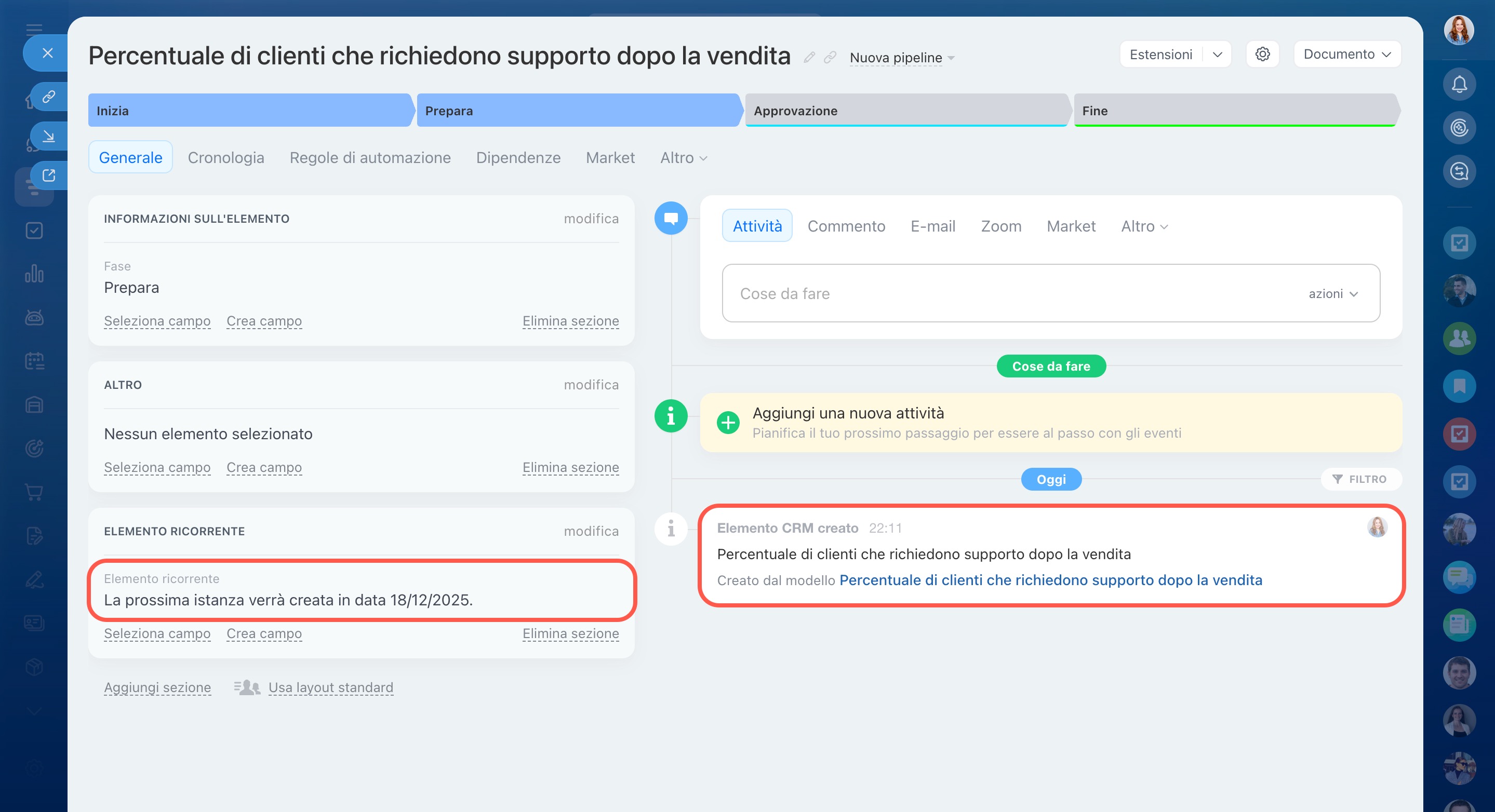 Gli elementi ricorrenti degli Smart Process ti aiutano a non dimenticare le attività ricorrenti, sia all’interno dell’azienda, sia nel lavoro con i clienti. Bitrix24 crea automaticamente questi elementi in base alla pianificazione impostata, ad esempio una volta al mese per l’inventario di magazzino o ogni trimestre per la manutenzione programmata.