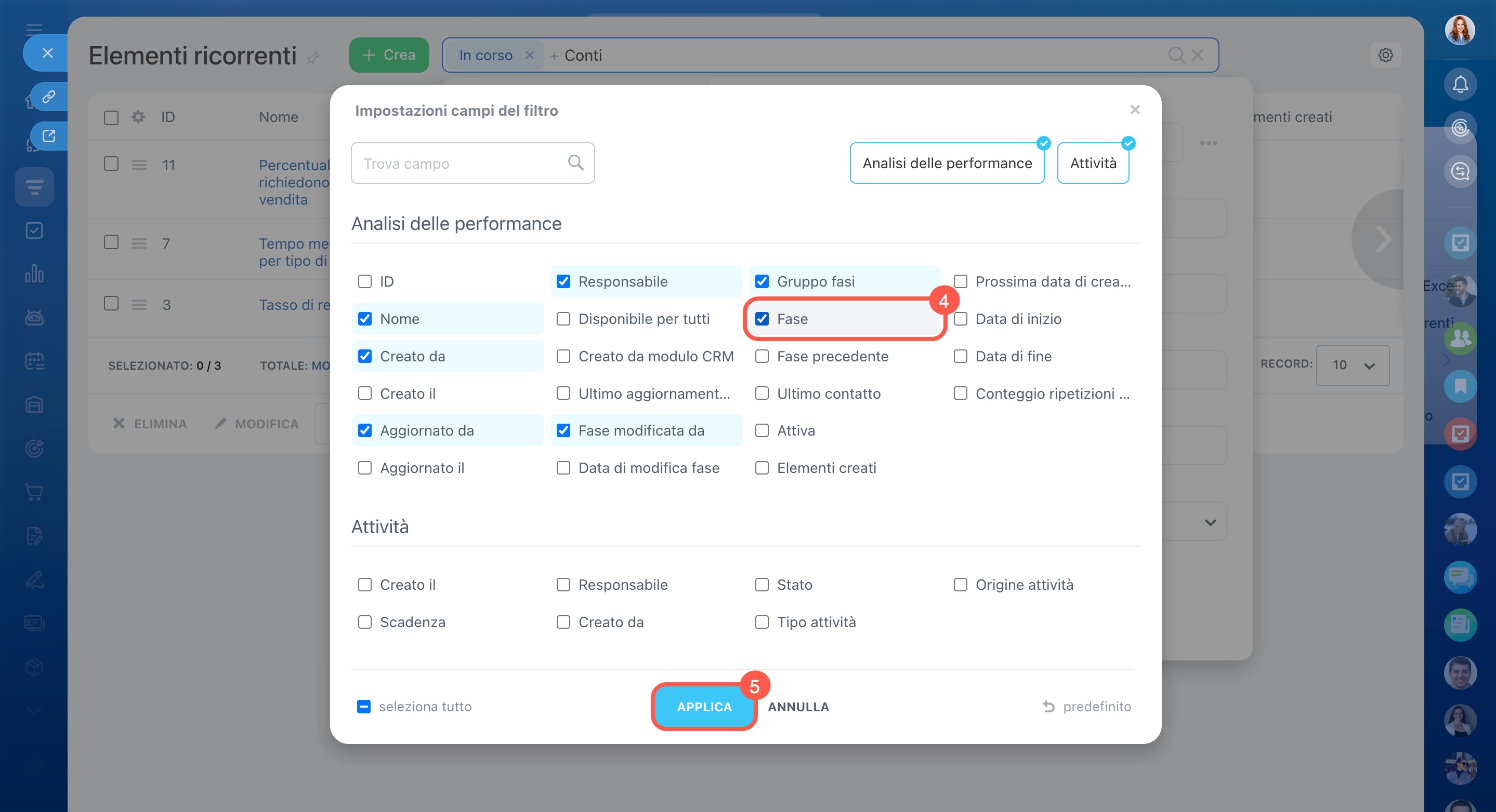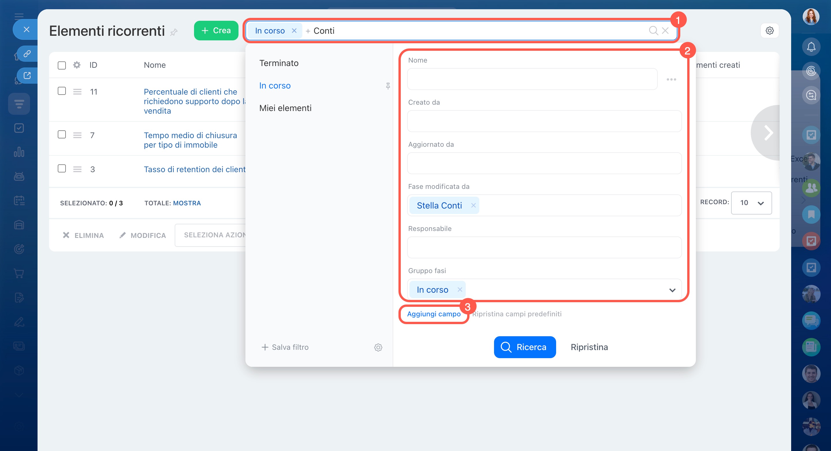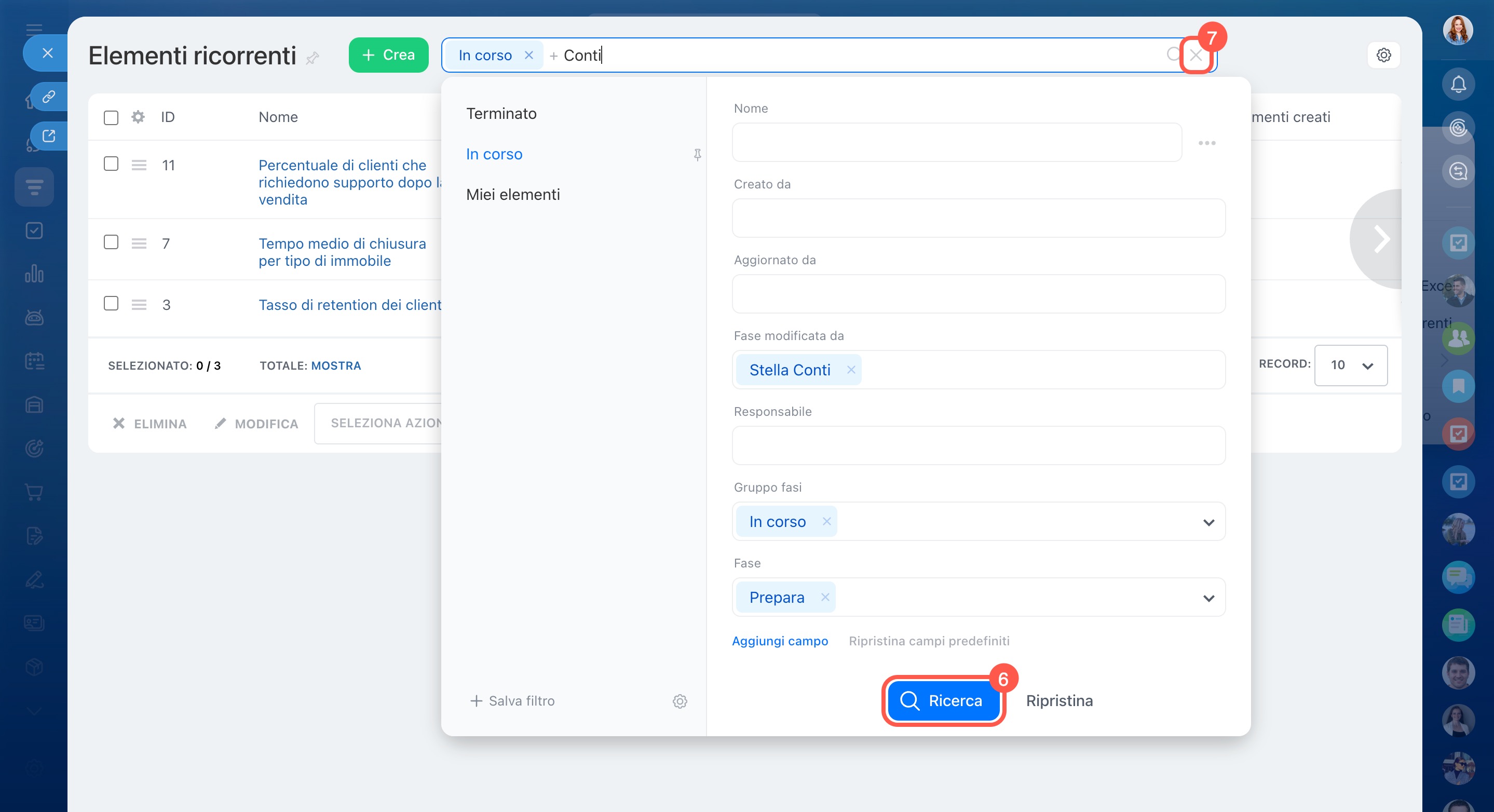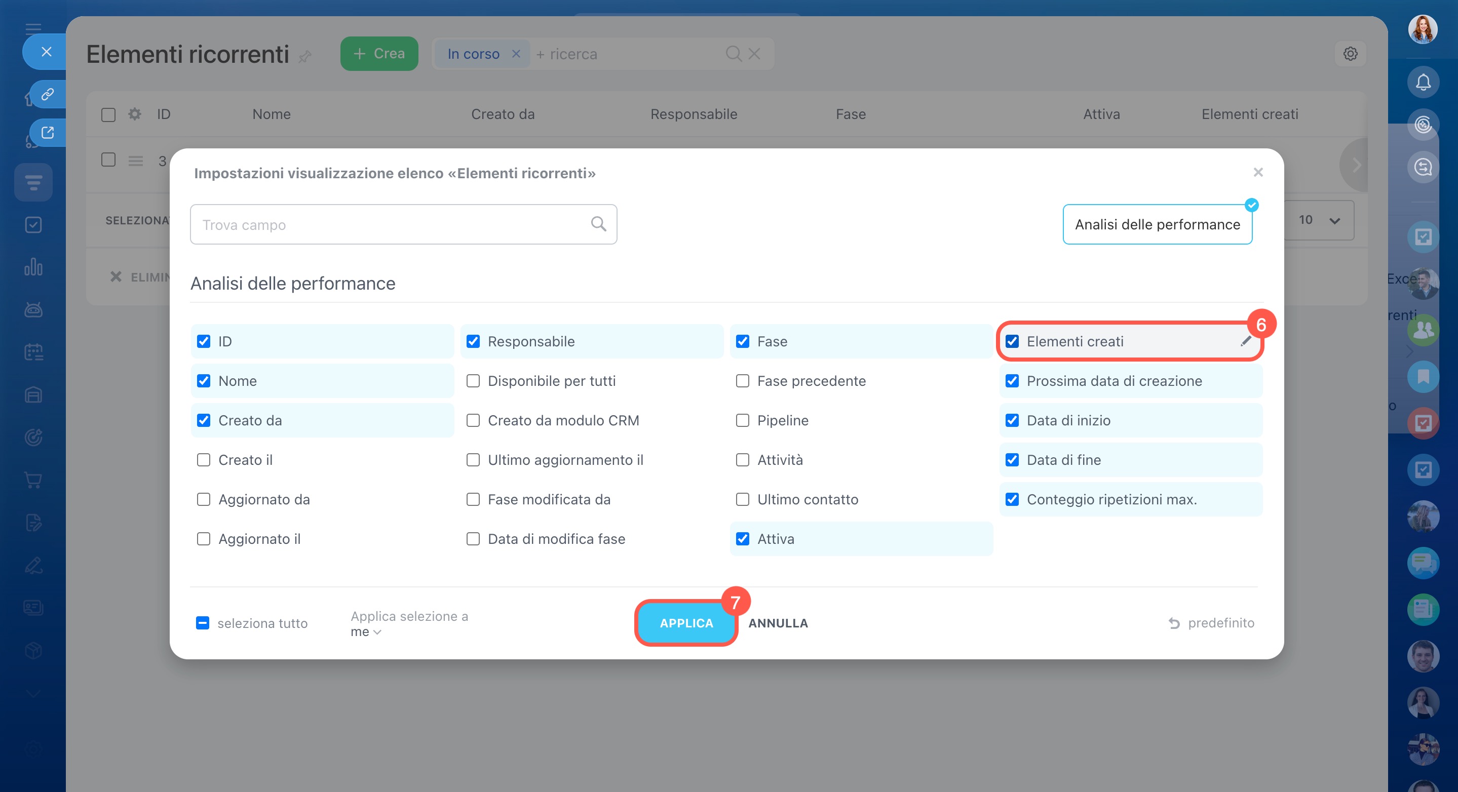 Gli elementi ricorrenti degli Smart Process ti aiutano a non dimenticare le attività ricorrenti, sia all’interno dell’azienda, sia nel lavoro con i clienti. Bitrix24 crea automaticamente questi elementi in base alla pianificazione impostata, ad esempio una volta al mese per l’inventario di magazzino o ogni trimestre per la manutenzione programmata.