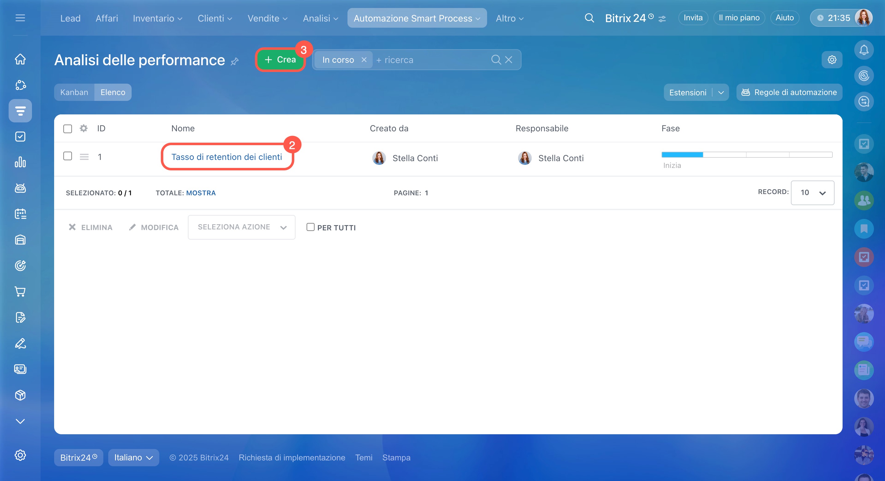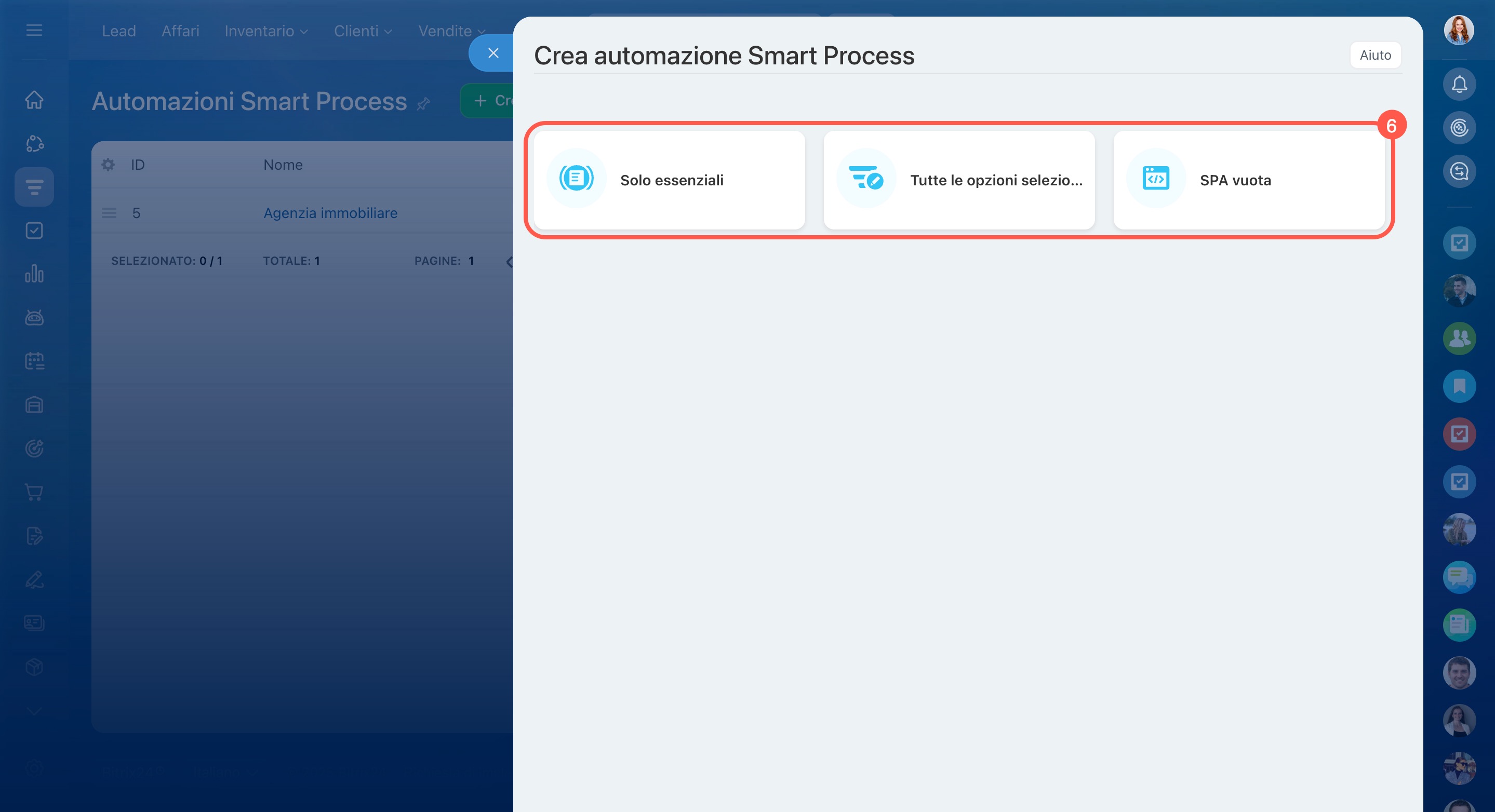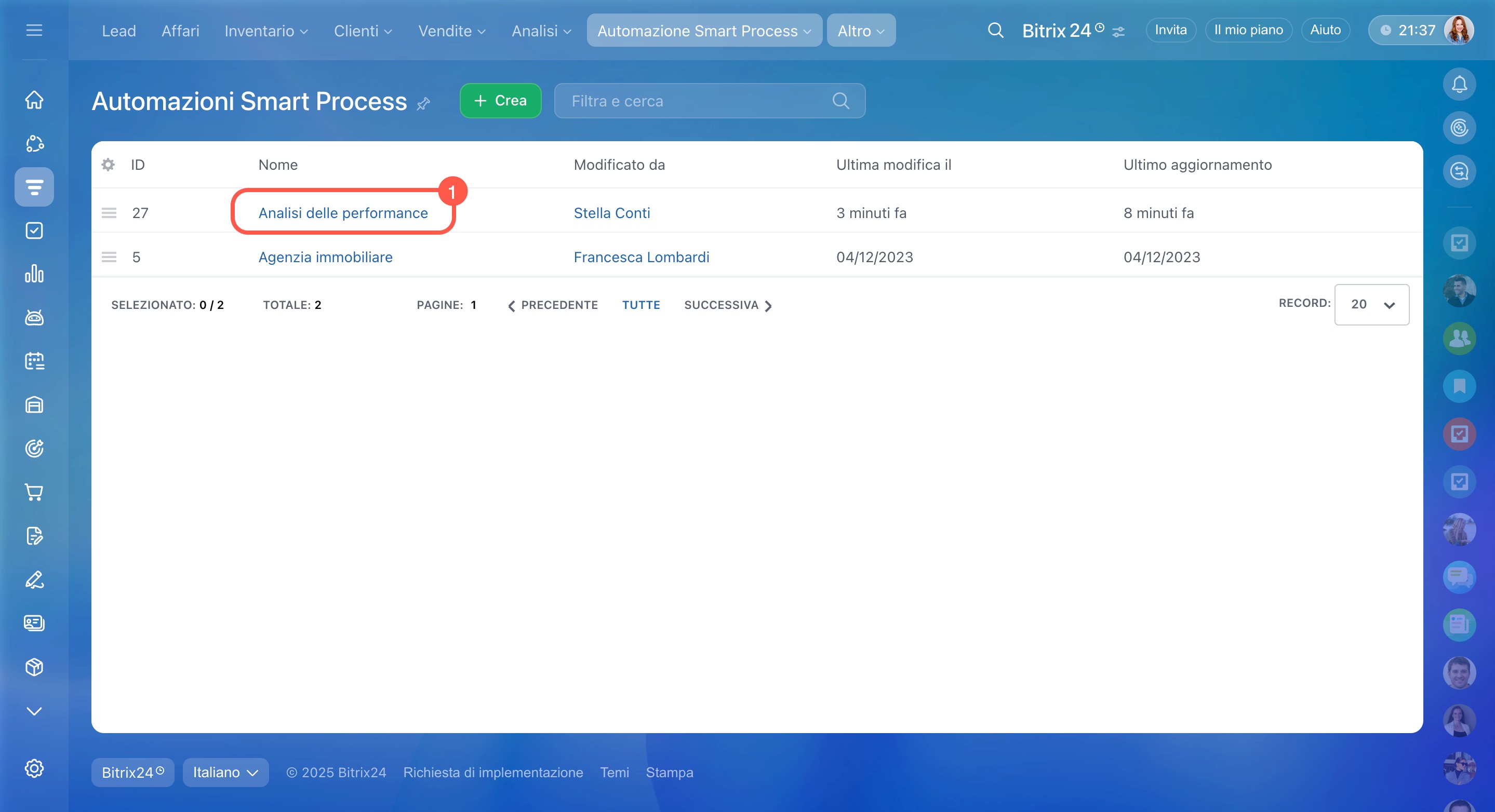- Vai alla sezione CRM > Altro > Automazione Smart Process > Automazione Smart Process.