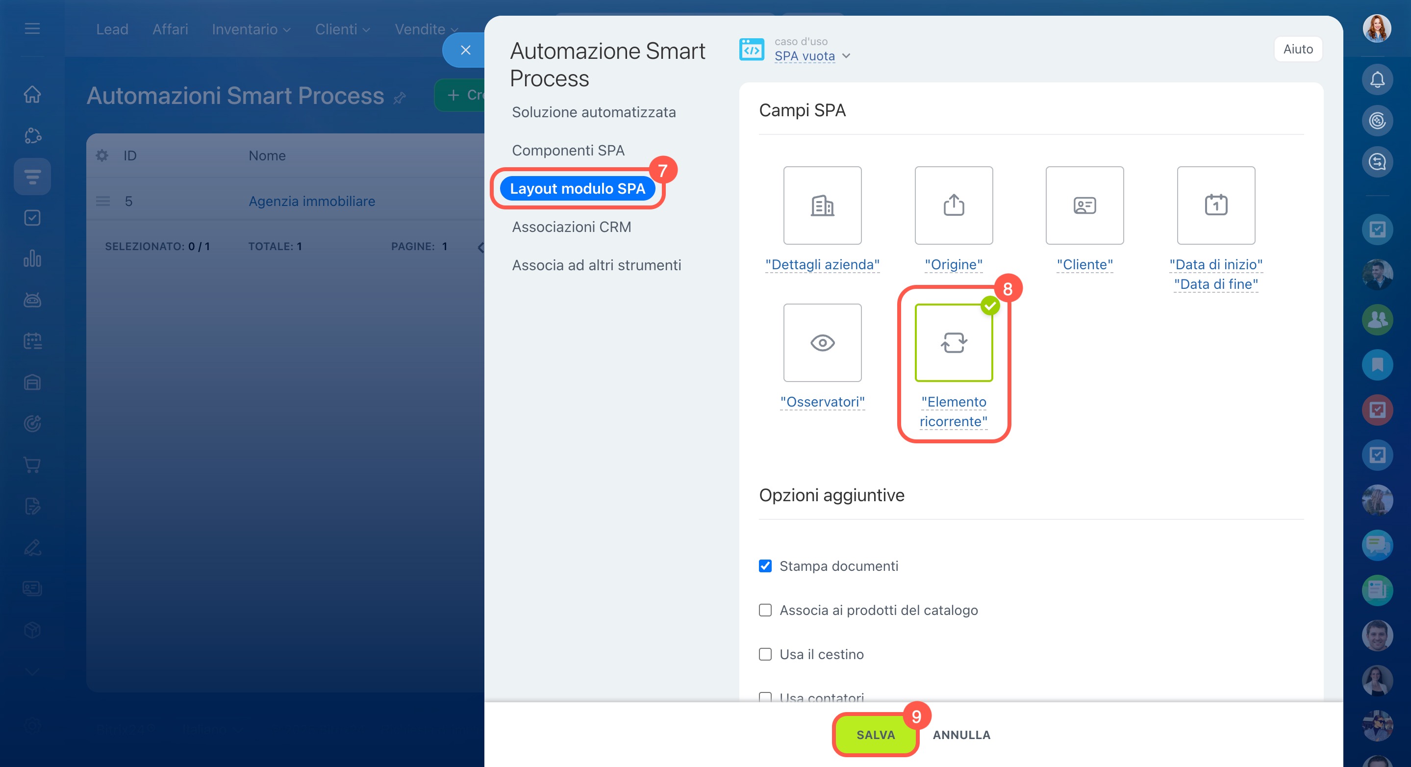 Per avviare la creazione automatica degli elementi, è necessario abilitare la ricorrenza nello Smart Process. Puoi farlo sia durante la creazione, sia modificando un processo esistente. La procedura è la stessa nel CRM e nelle soluzioni automatizzate.