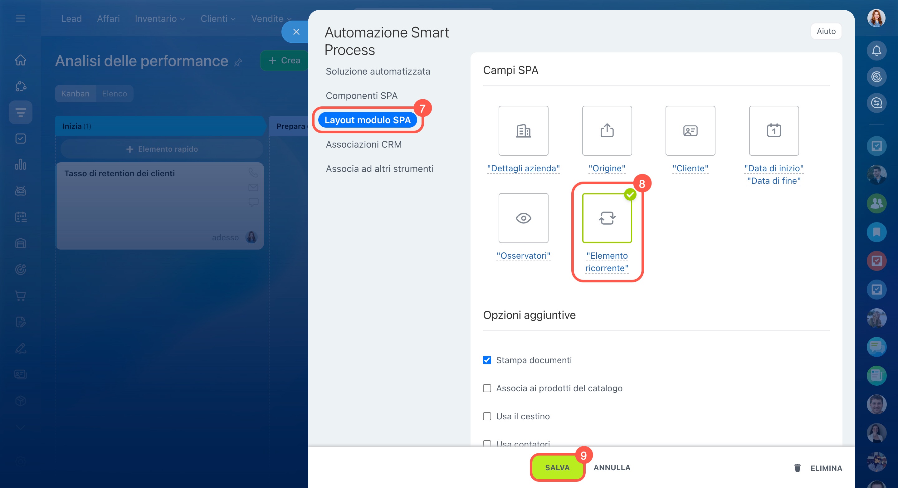Per fare in modo che Bitrix24 crei automaticamente nuovi elementi secondo una pianificazione, è necessario abilitare la ricorrenza nello Smart Process.