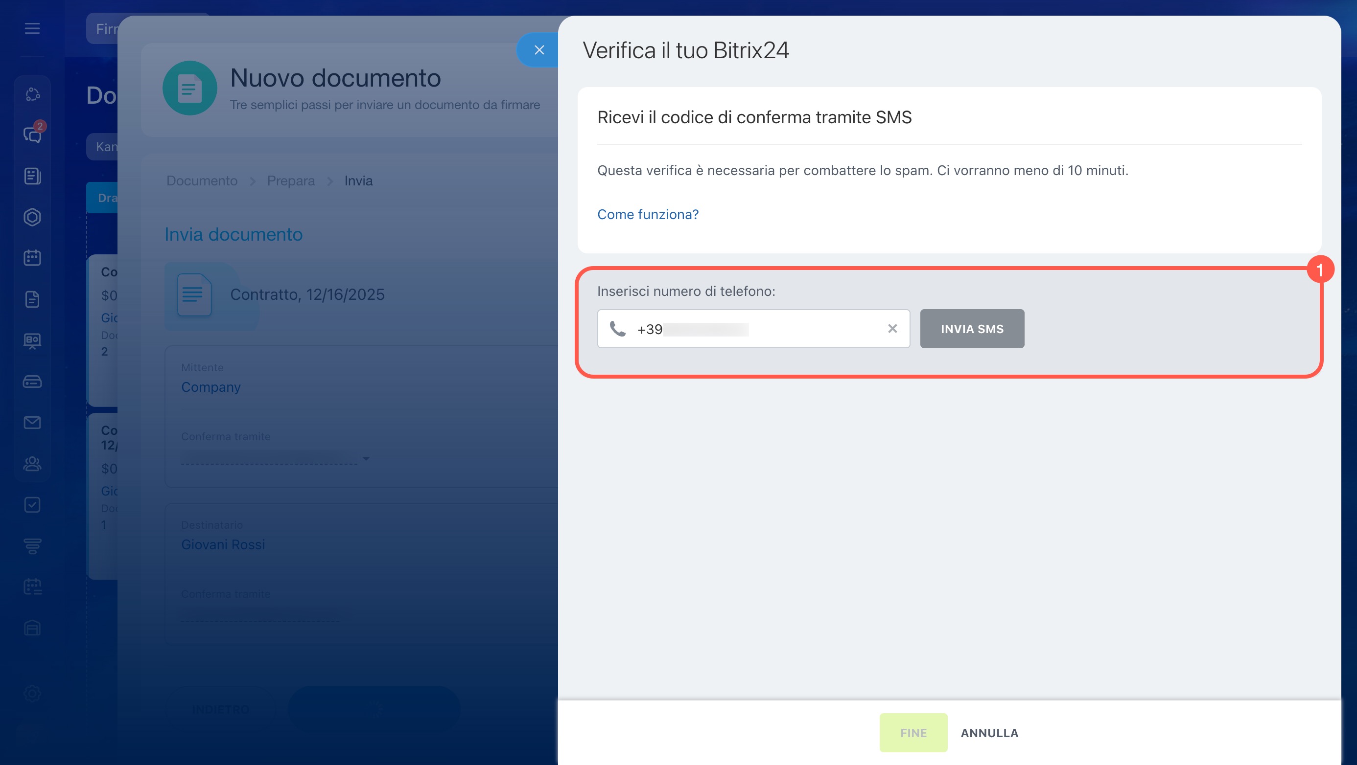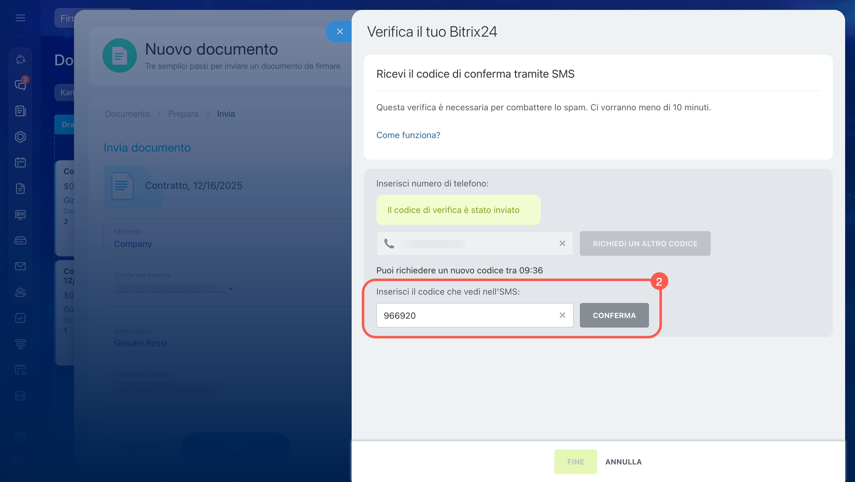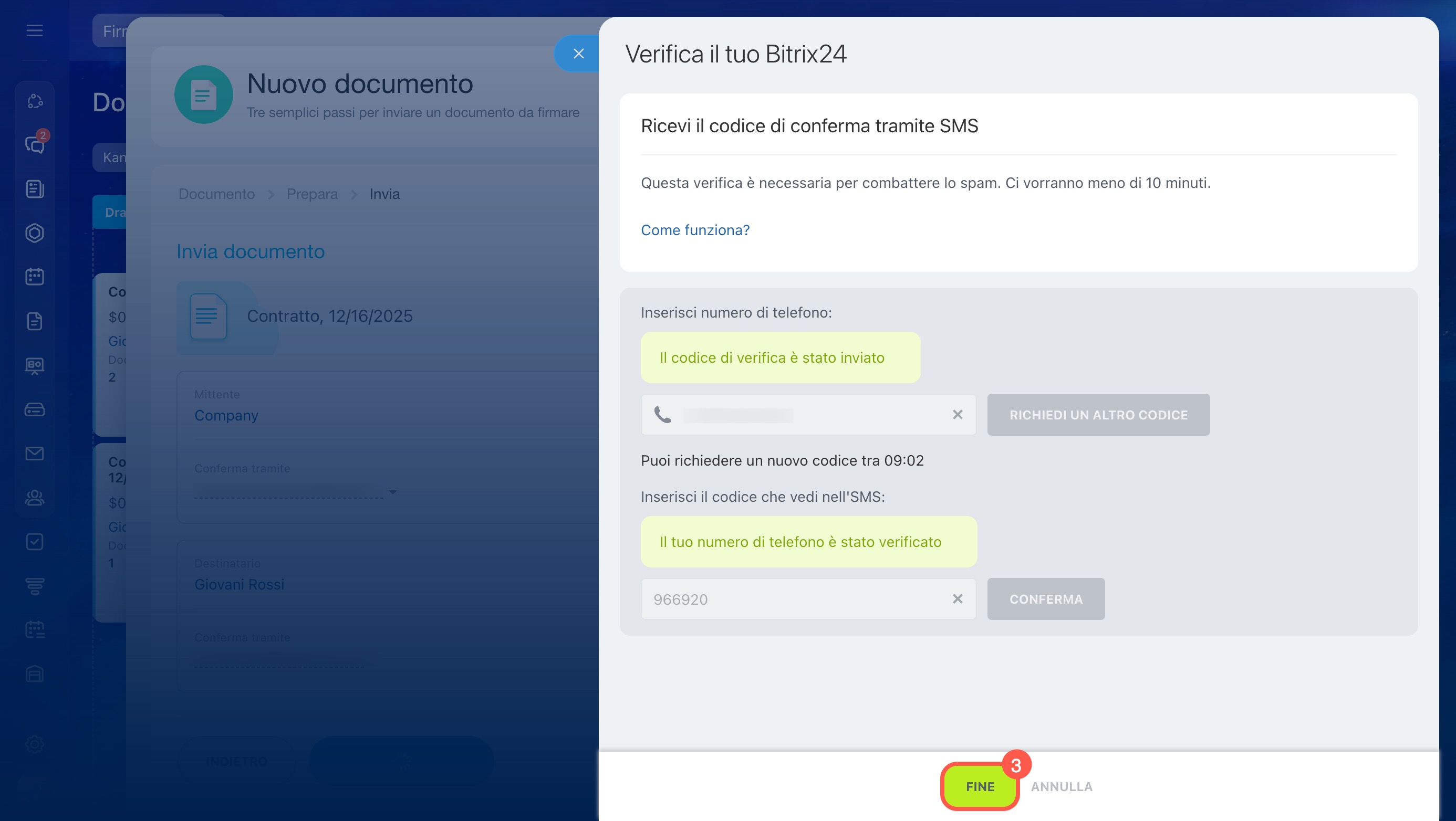 Prima di inviare il terzo documento, è necessario confermare il numero di telefono dell’utente che crea i documenti in Bitrix24. Questa verifica serve a proteggere l’account e a prevenire l’uso improprio del servizio per attività di spam.