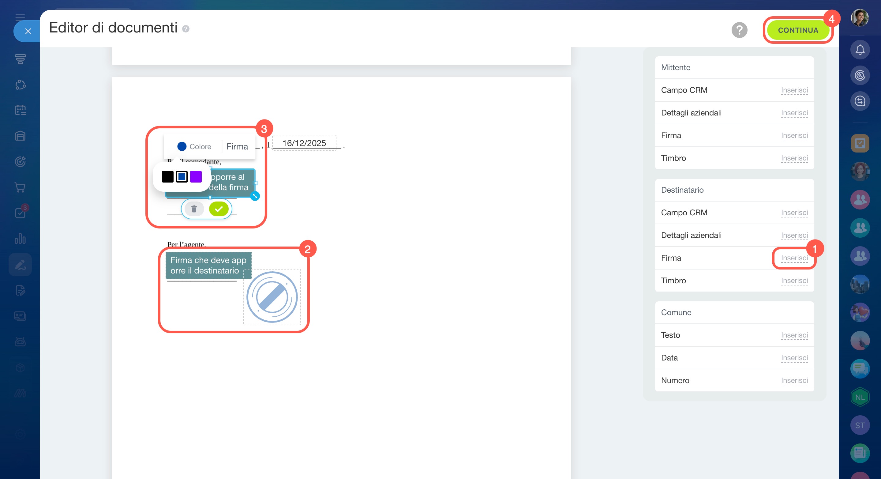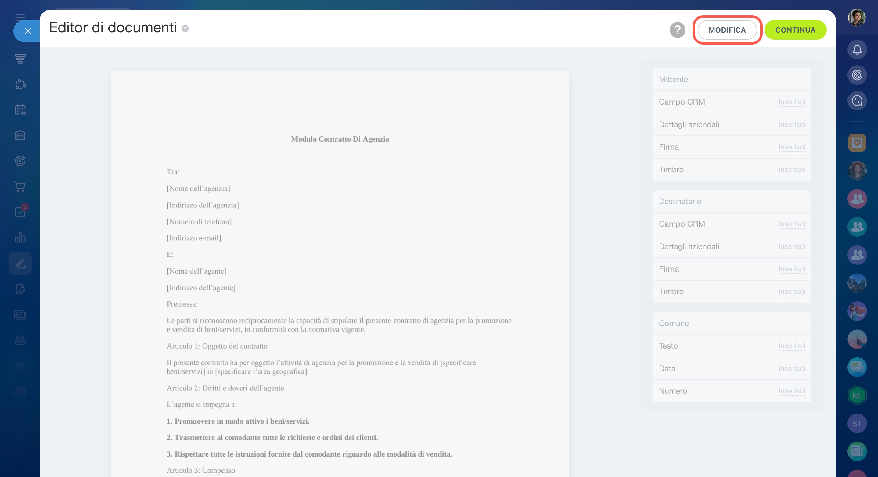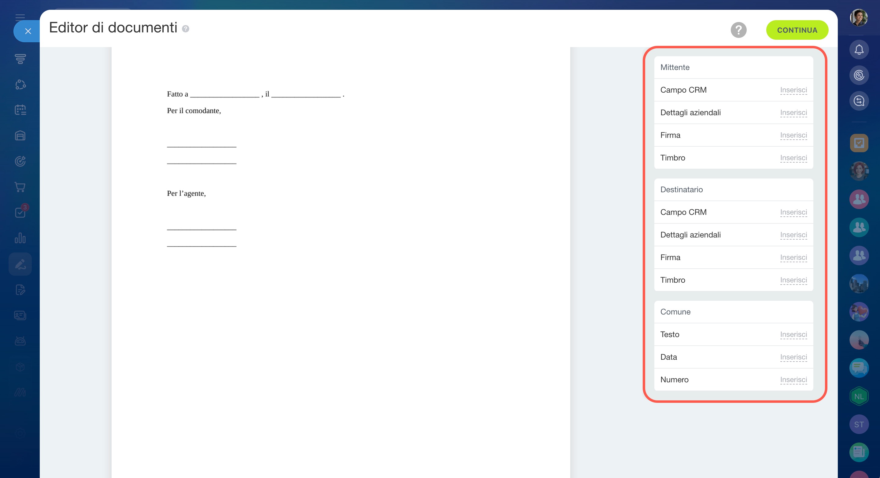 - Campo CRM — consente di inserire dati dalla scheda di un contatto, di un’azienda o di un affare.