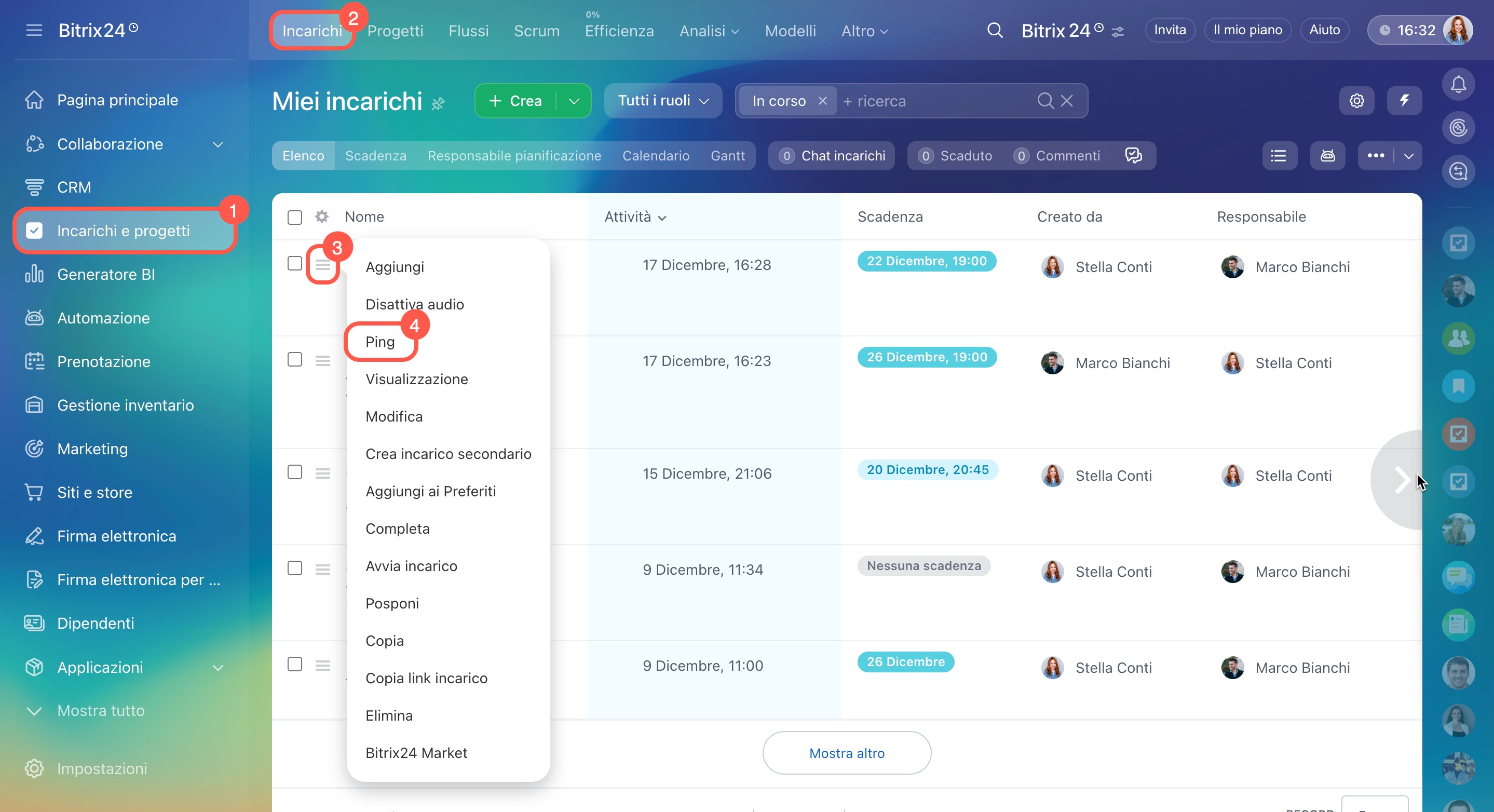 Vai su Incarichi e progetti > Incarichi, seleziona l'incarico desiderato, apri il Menu (≡) e fai clic su Ping. Il responsabile e i partecipanti riceveranno una notifica e nella chat dell’incarico apparirà un messaggio di sistema.