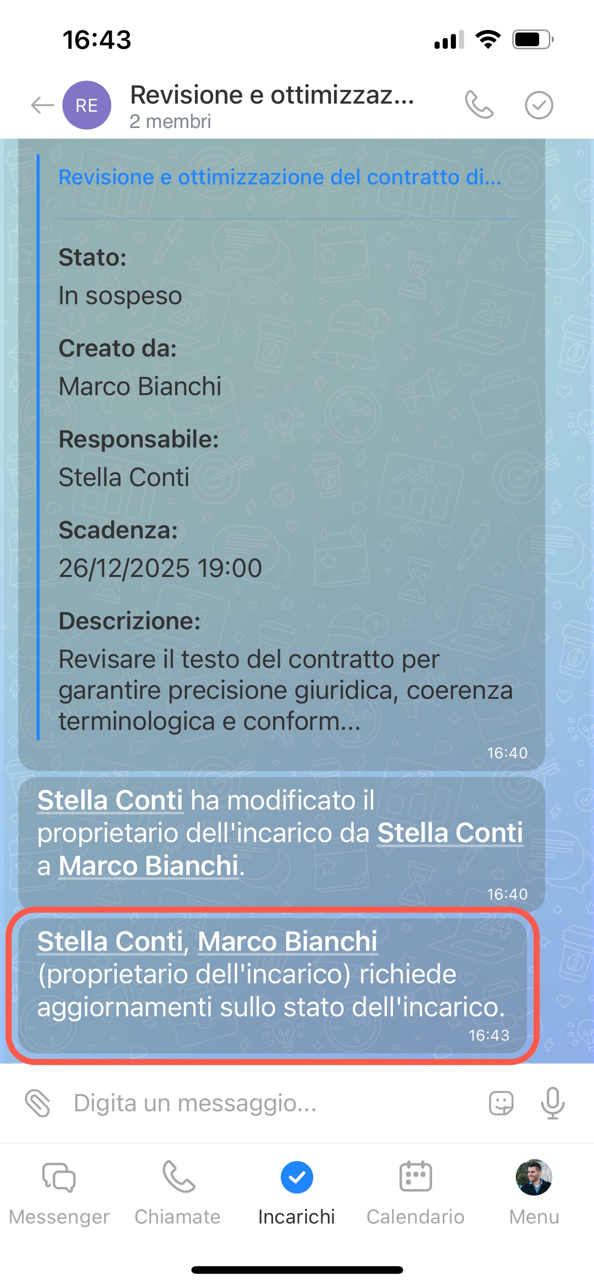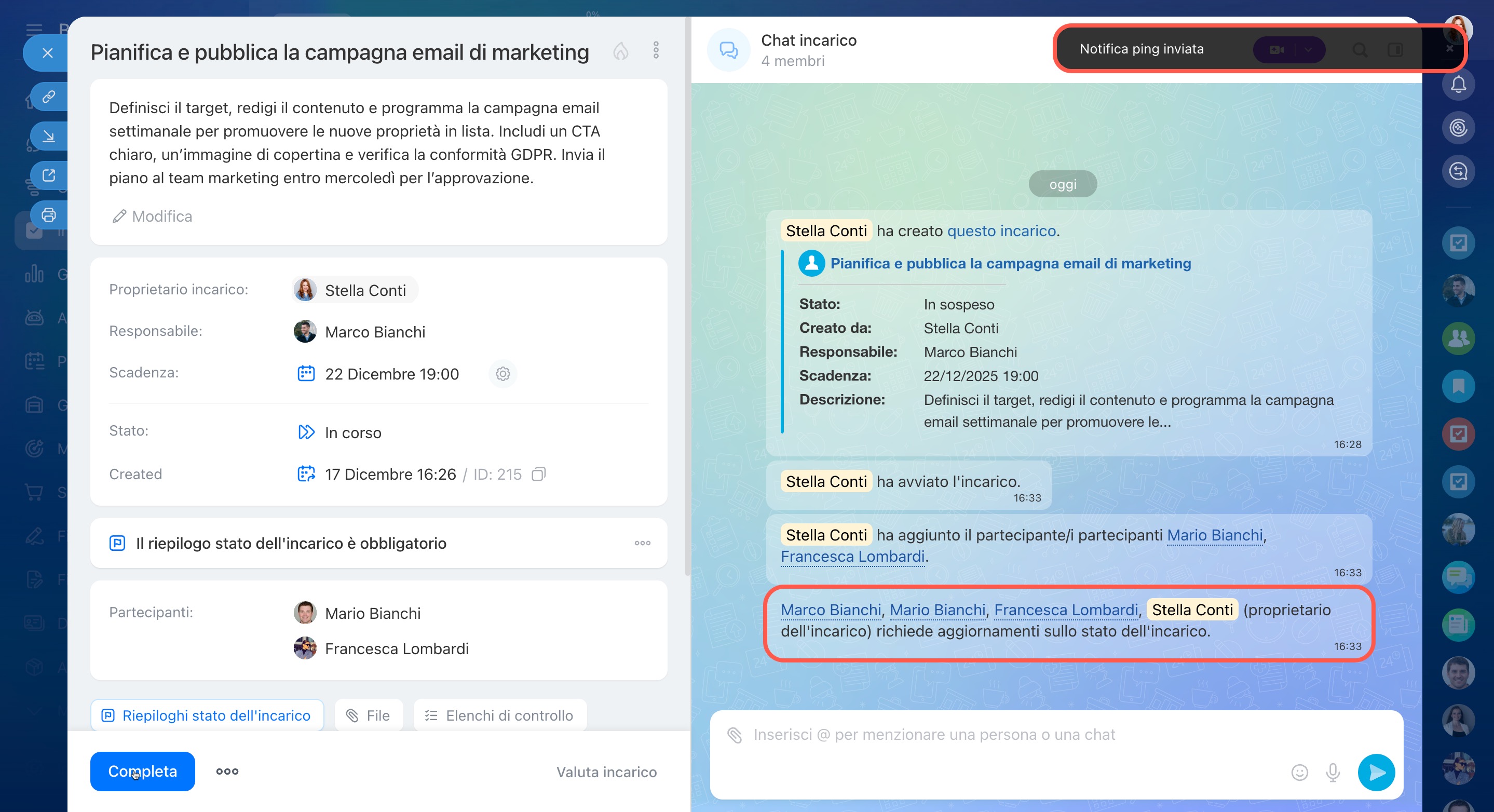 - Il responsabile e i partecipanti ricevono una notifica e vedono il ping come un messaggio di sistema nella chat dell’incarico.
