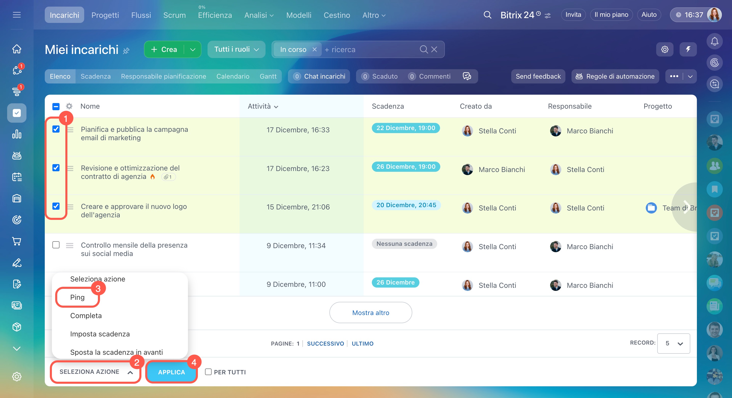 Se devi richiedere lo stato di più incarichi, puoi usare le azioni di gruppo: nell’elenco seleziona gli incarichi desiderati, poi fai clic su Seleziona azione > Ping > Applica.