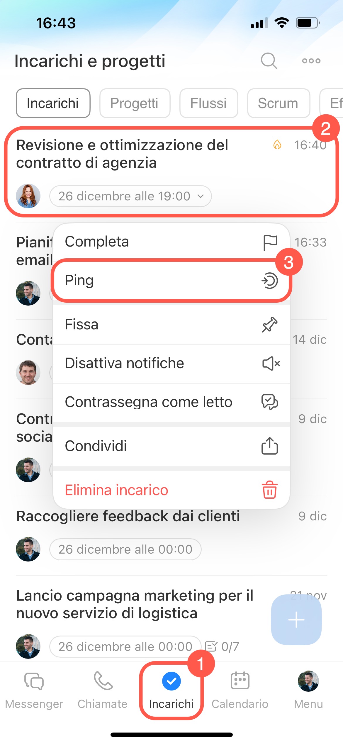 - Puoi inviare un ping dall’elenco degli incarichi: nella versione web dal menu dell’incarico, nell’app mobile tenendo premuto sull’incarico.