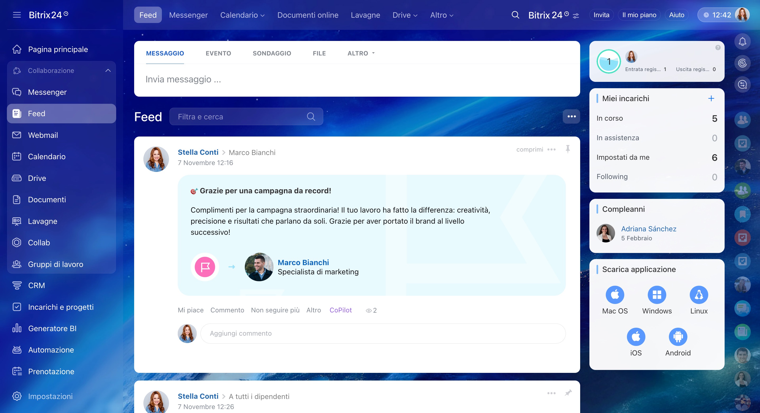 Bitrix24 è uno spazio di lavoro completo per la collaborazione, in cui strumenti come incarichi, chat, chiamate e calendario sono integrati tra loro. Non è necessario passare da un’app all’altra: tutto ciò che serve per lavorare è disponibile in un unico ambiente.