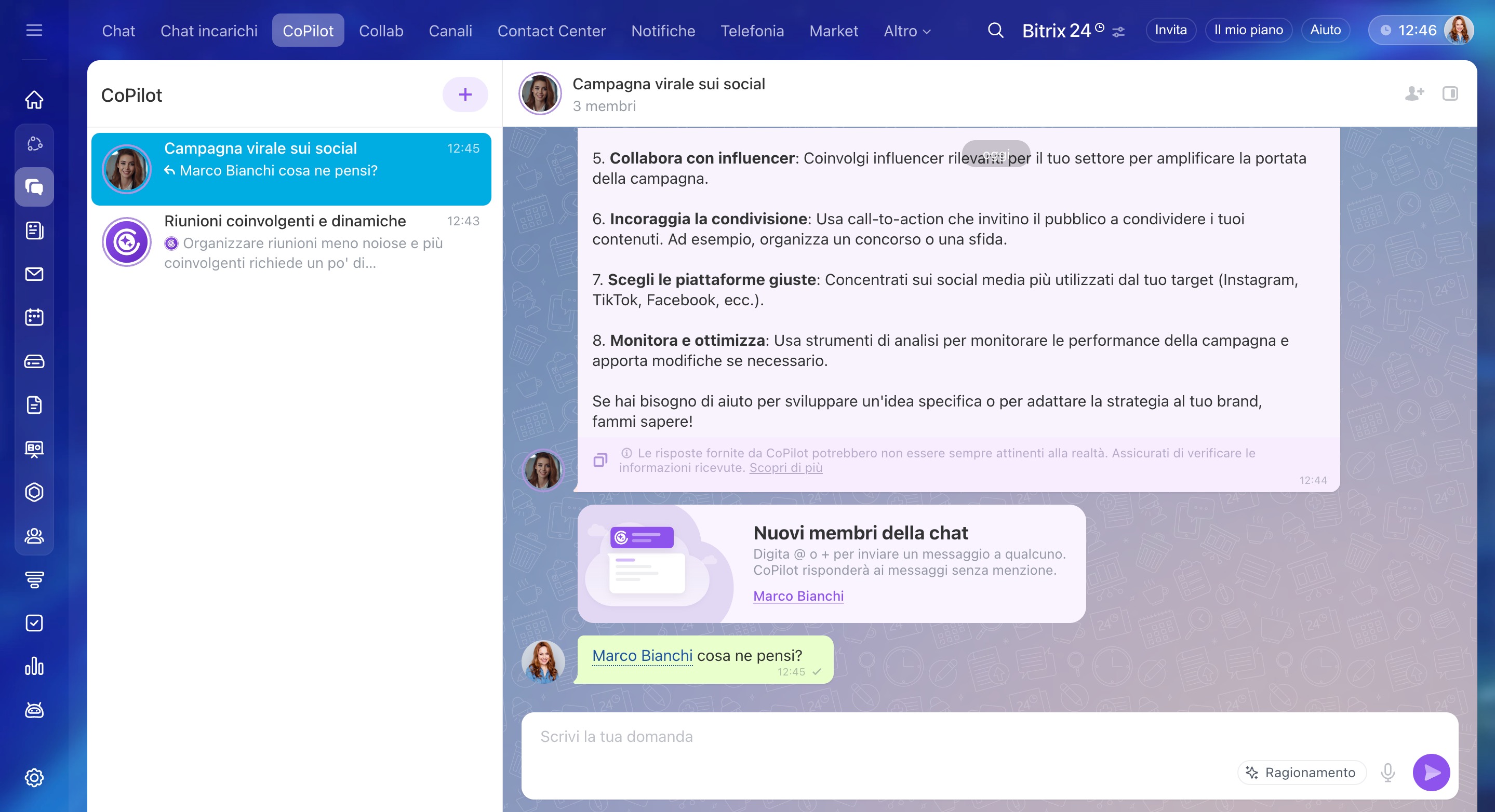 Qui trovi le risposte alle domande sull’utilizzo di CoPilot, l’assistente IA di Bitrix24. Può aiutarti a scrivere testi, sviluppare idee, riformulare contenuti o riassumere messaggi lunghi in pochi punti chiave.