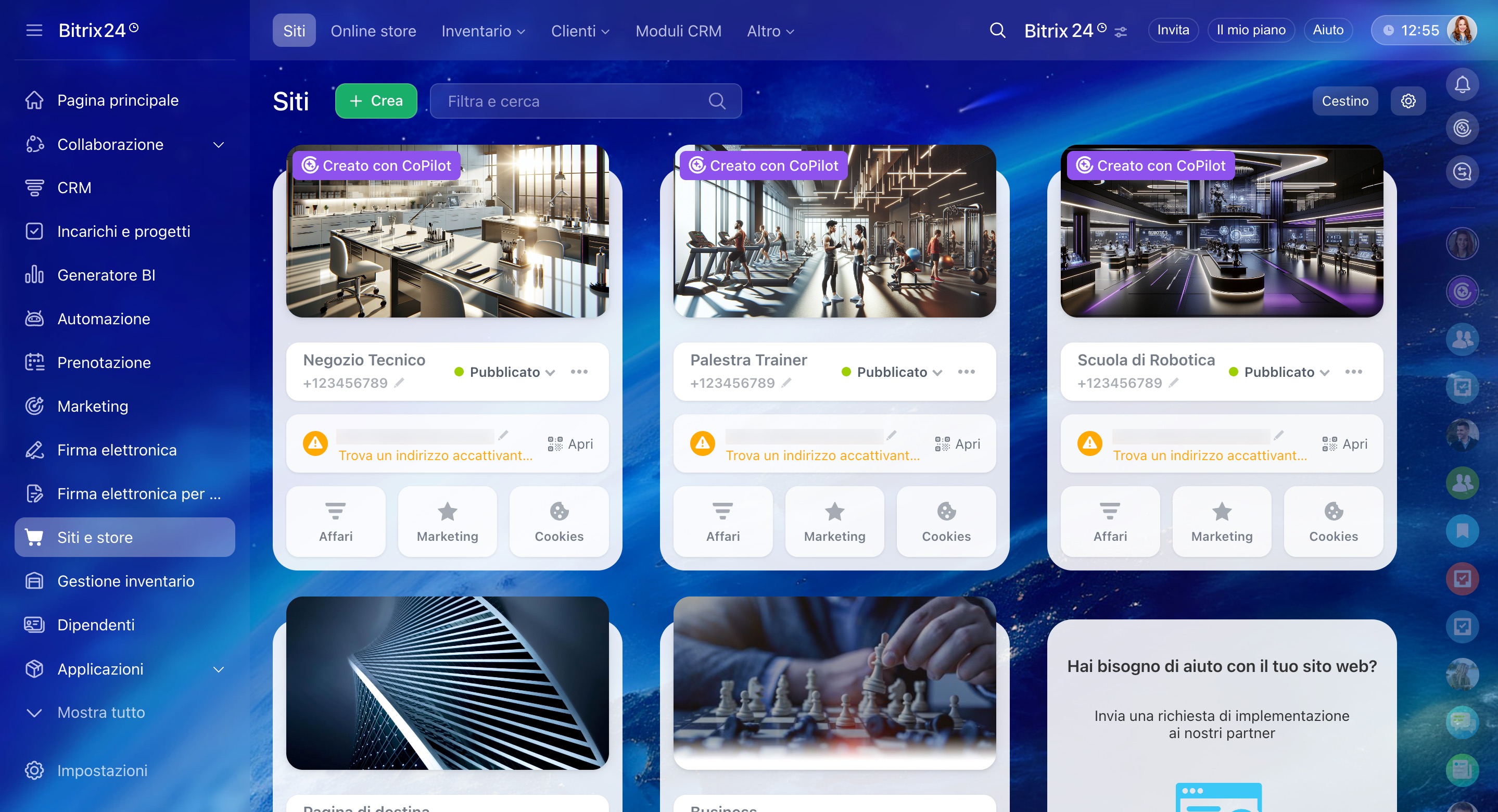 Questa sezione risponde alle domande più frequenti sulla creazione di siti e store online con Bitrix24: gestione del dominio, impostazioni SEO, sistemi di pagamento, sconti sui prodotti e altro ancora.