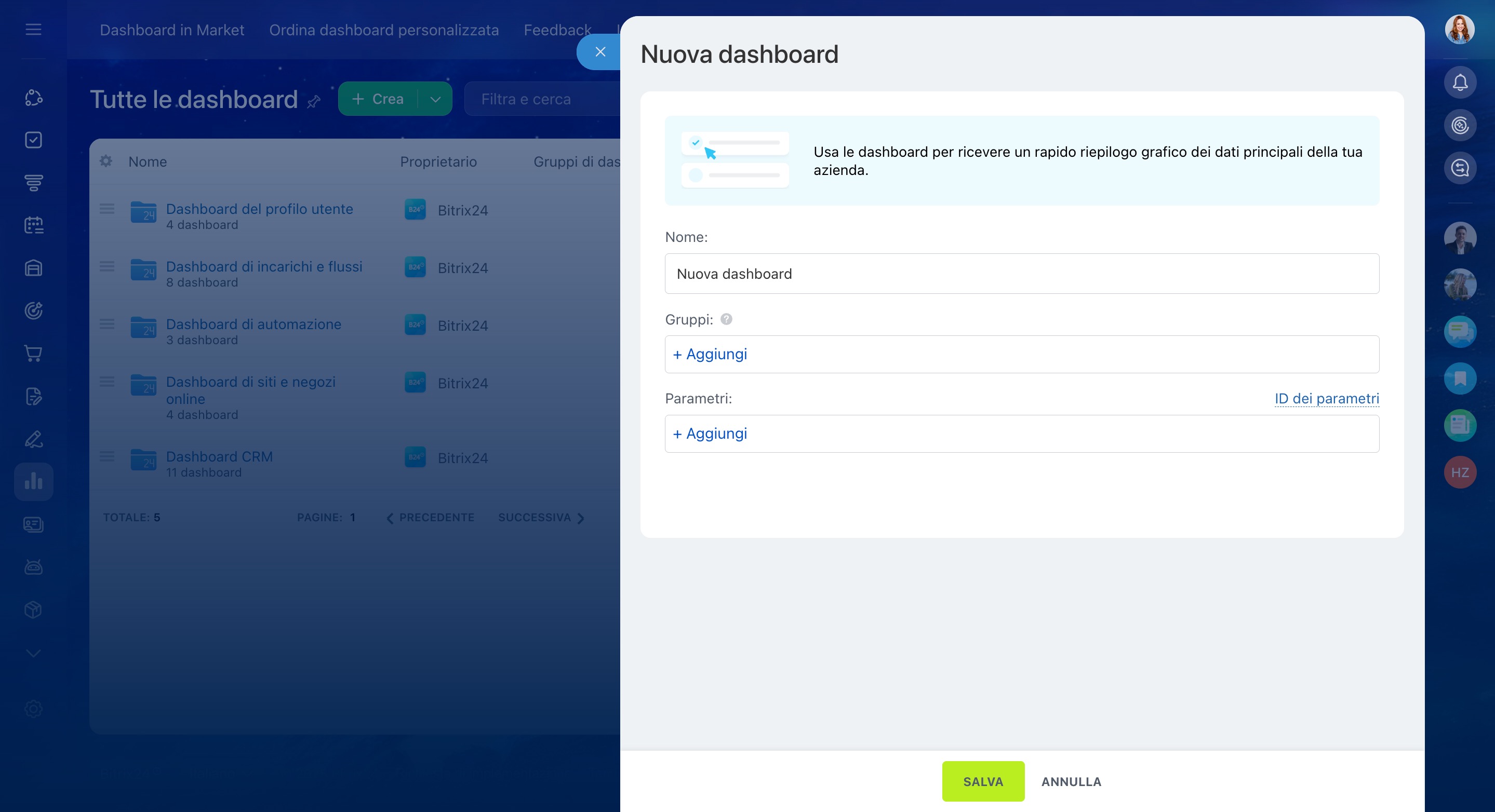 In questa sezione trovi le risposte alle domande su Generatore BI, rapporti CRM e analisi delle vendite: come collegare le fonti dati, configurare dashboard, filtri e grafici, e valutare le performance di vendita e dei canali pubblicitari.