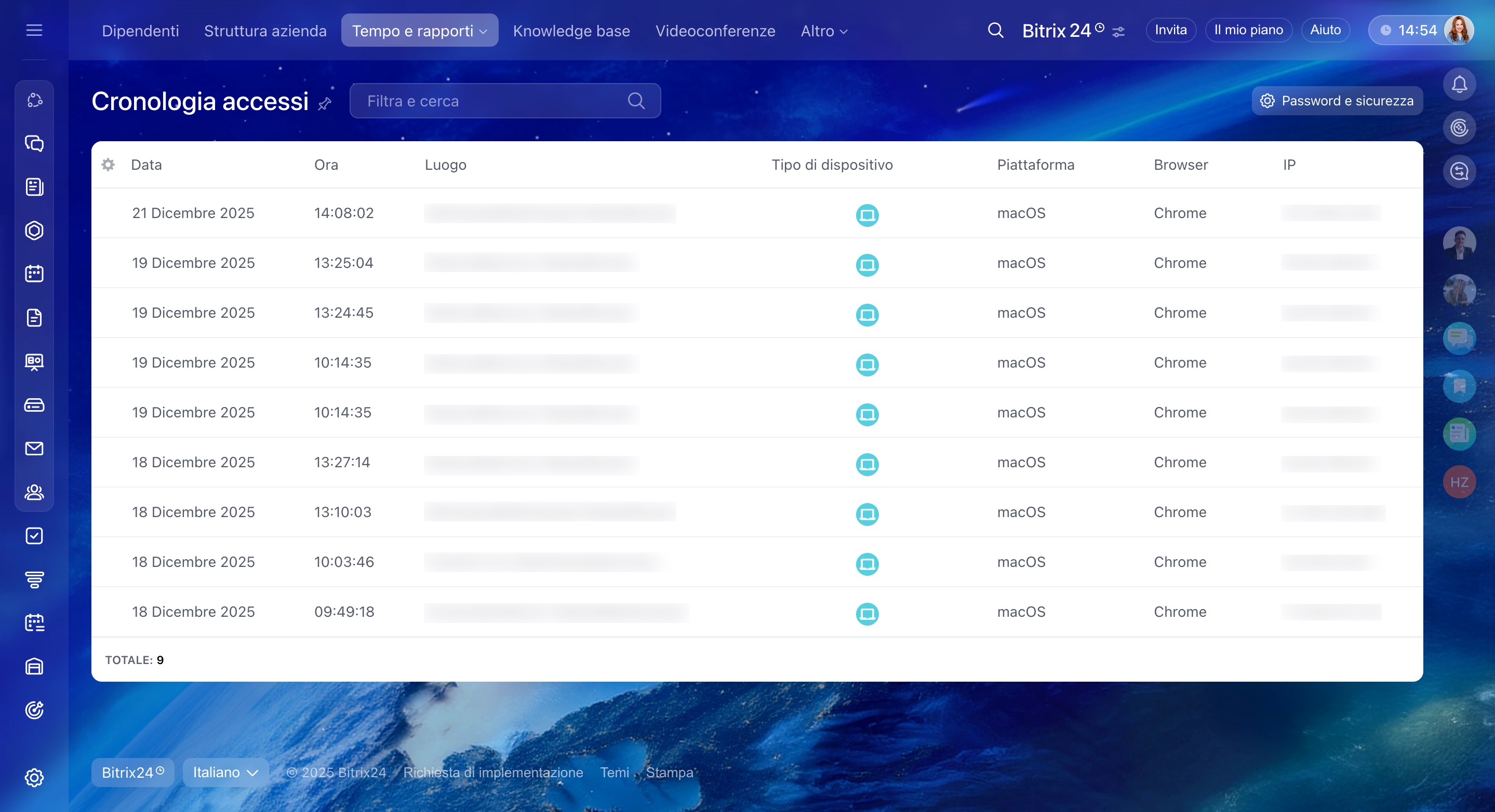 L’amministratore può definire un elenco di indirizzi IP autorizzati e consentire l’accesso a Bitrix24 solo da questi. In questo modo è possibile proteggere i dati aziendali da accessi non autorizzati, ad esempio da dispositivi sconosciuti o reti Wi-Fi pubbliche.