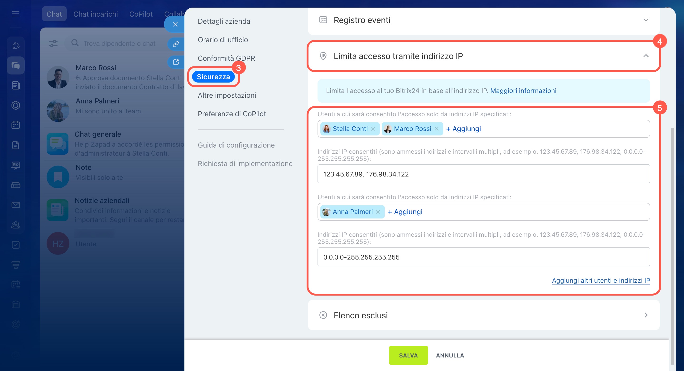 - Inserisci l’elenco degli indirizzi IP autorizzati e indica i dipendenti per cui la restrizione deve essere applicata.