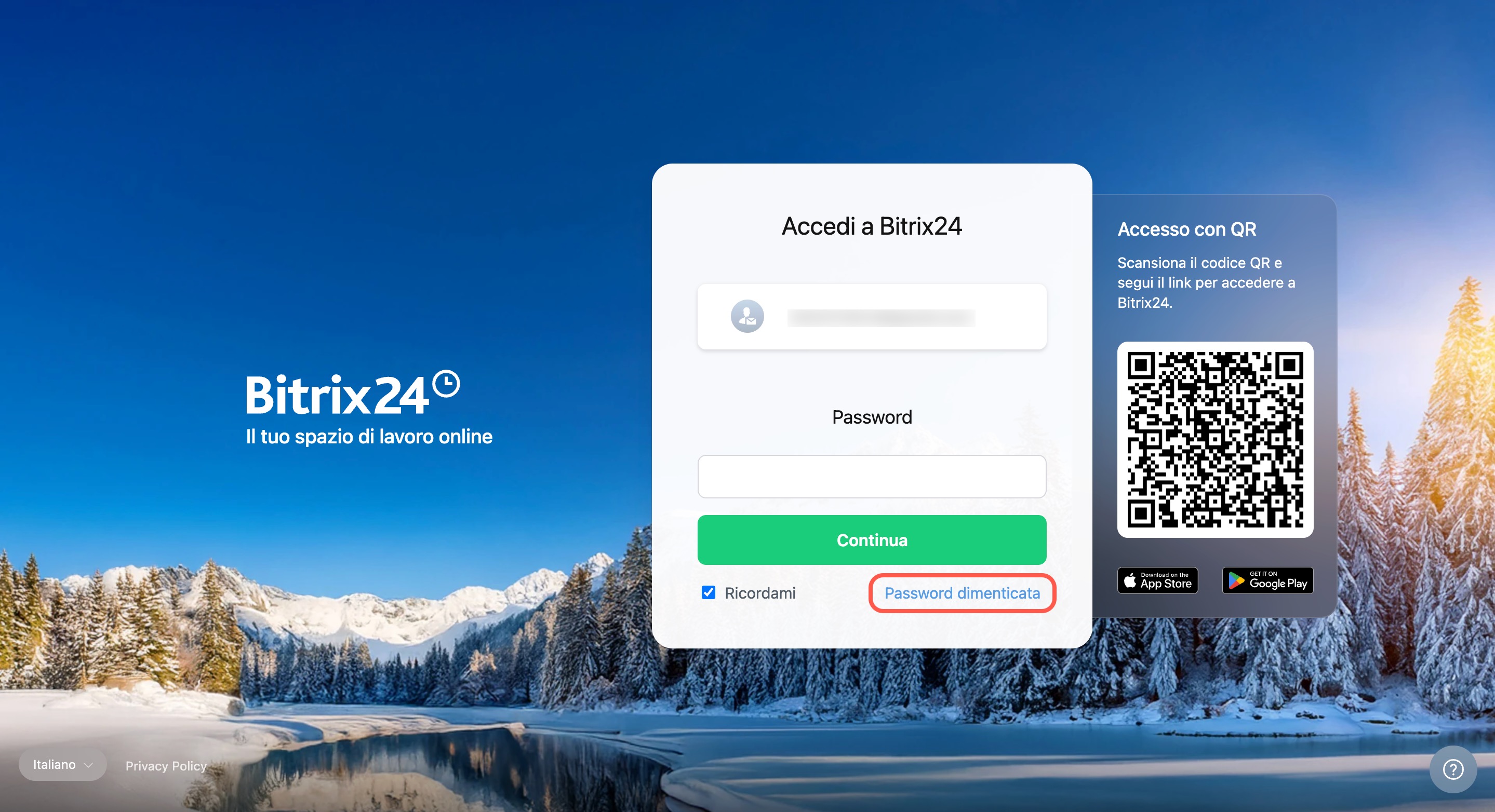 - accedere all’account tramite codice QR dall’app mobile di Bitrix24, se sei già autorizzato.