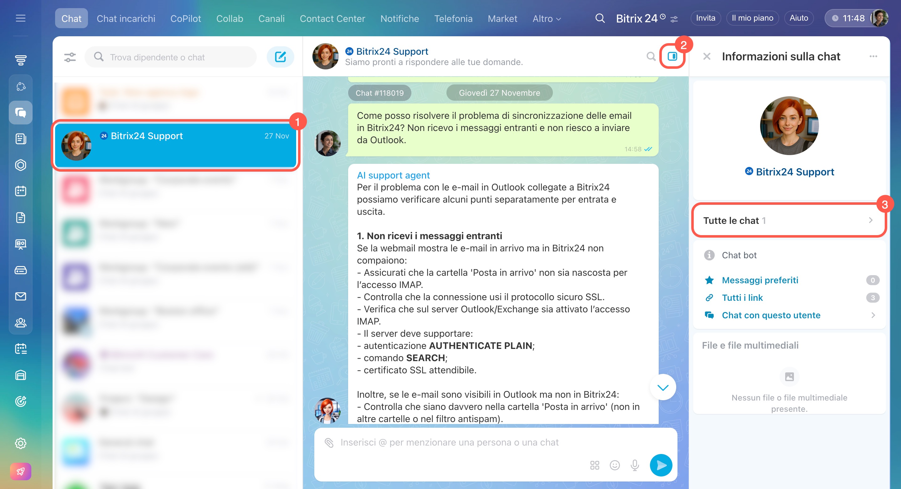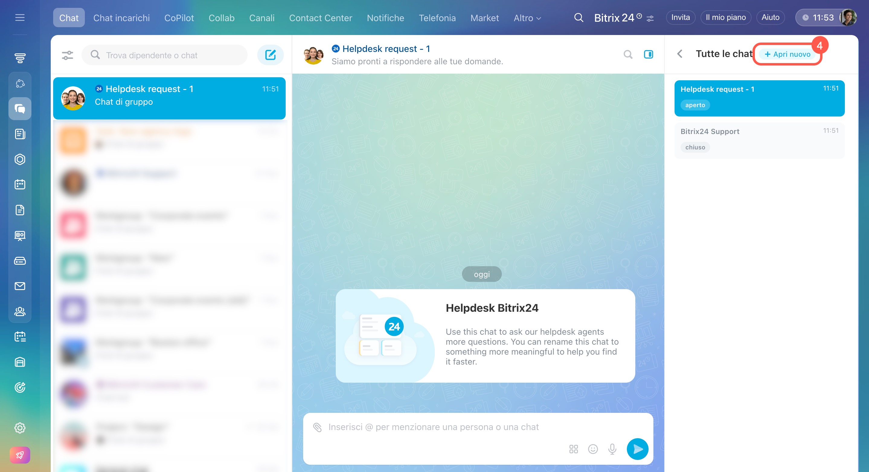 Puoi contattare il supporto Bitrix24 tramite chat, sia dalla versione web che dall’app mobile.