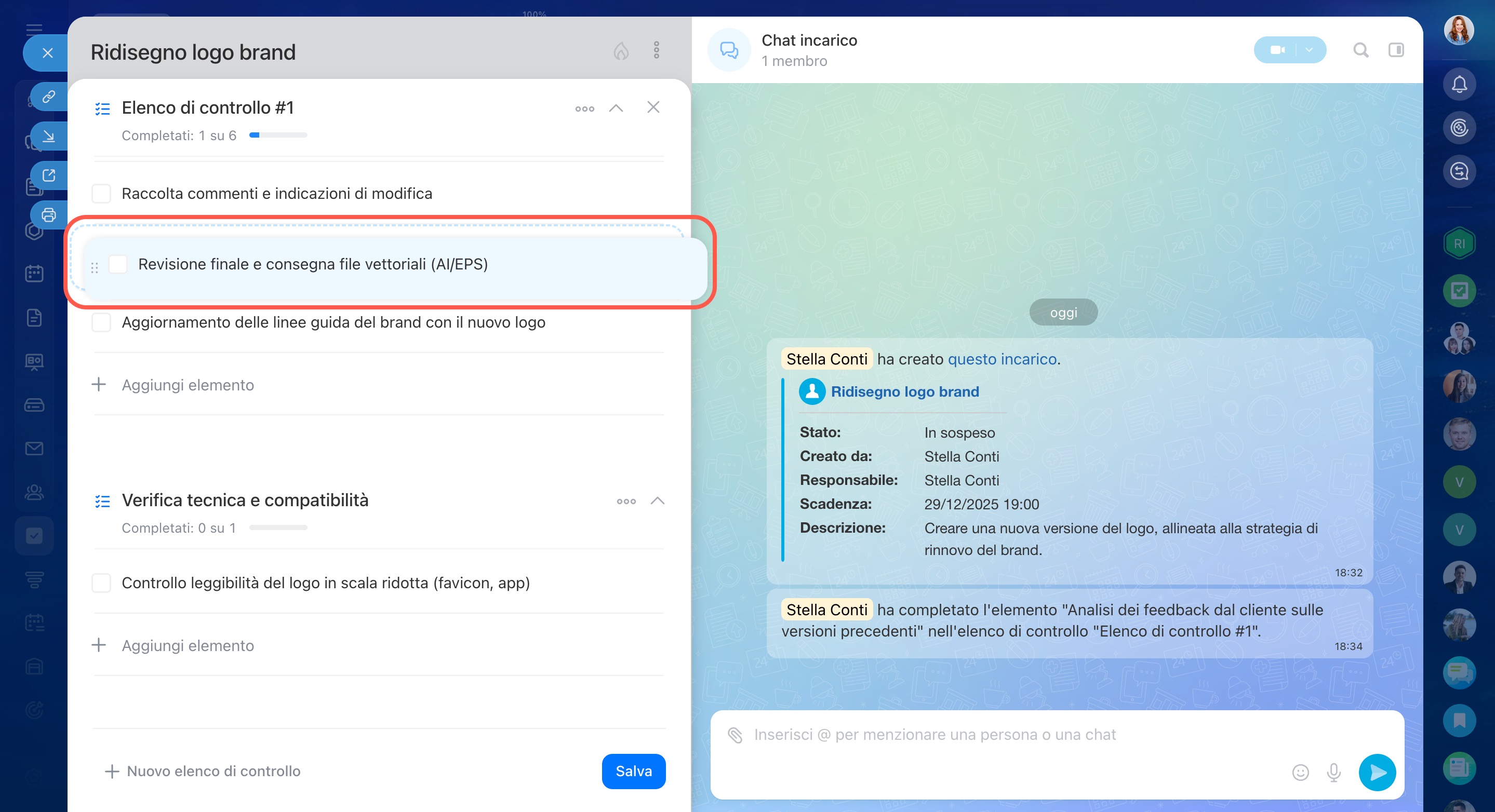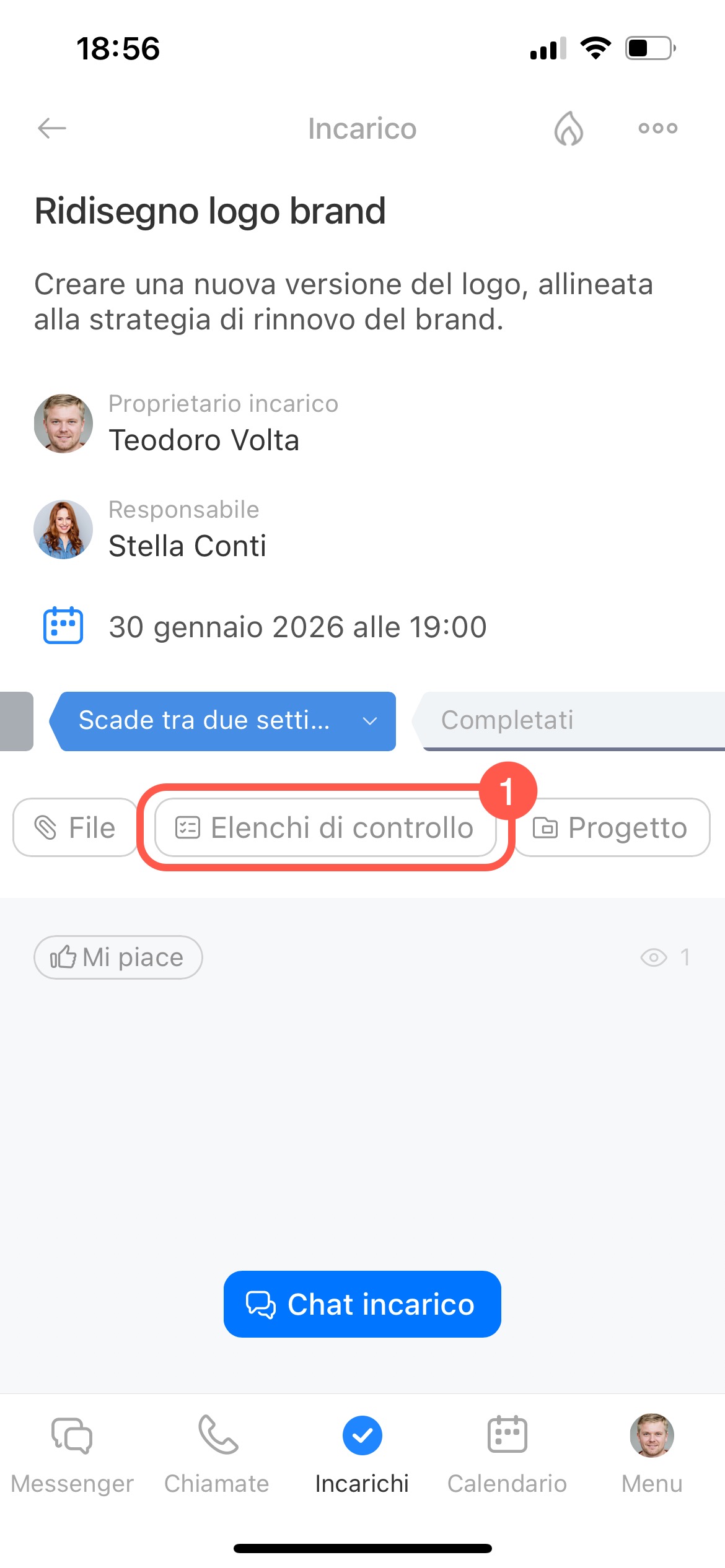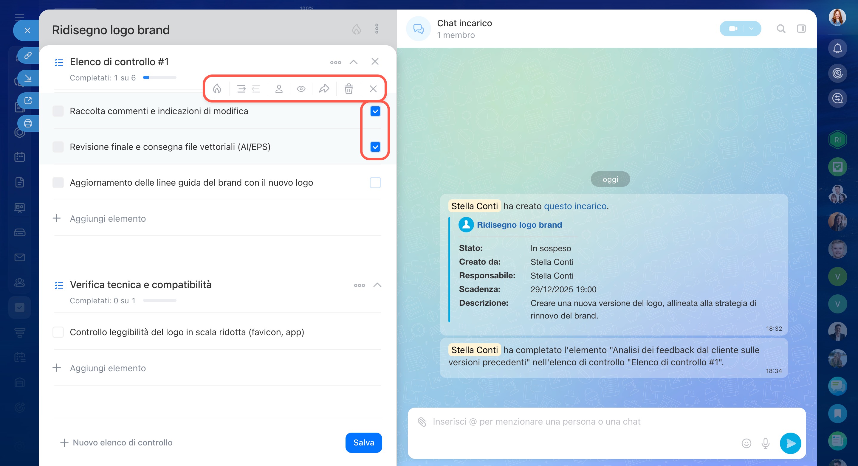 In un incarico puoi creare più elenchi di controllo, aggiornare i punti, contrassegnare quelli completati ed eliminare ciò che non serve più. Questo ti aiuta a mantenere l’incarico ordinato e a concentrarti sulle attività ancora da svolgere.