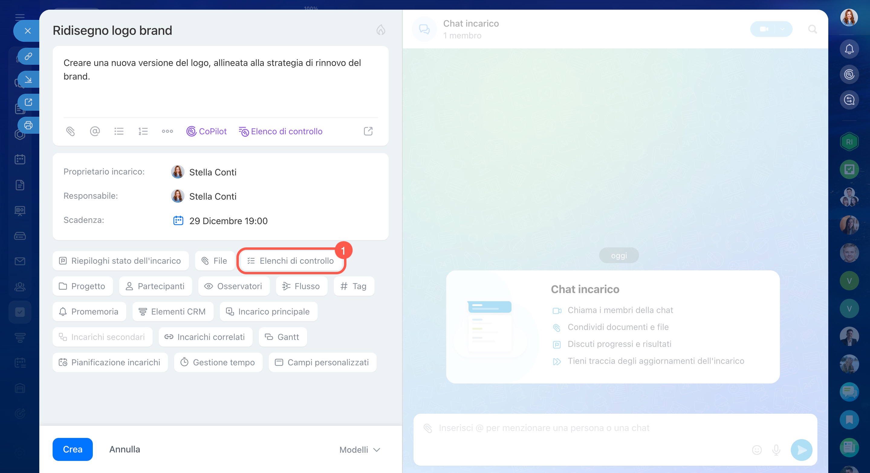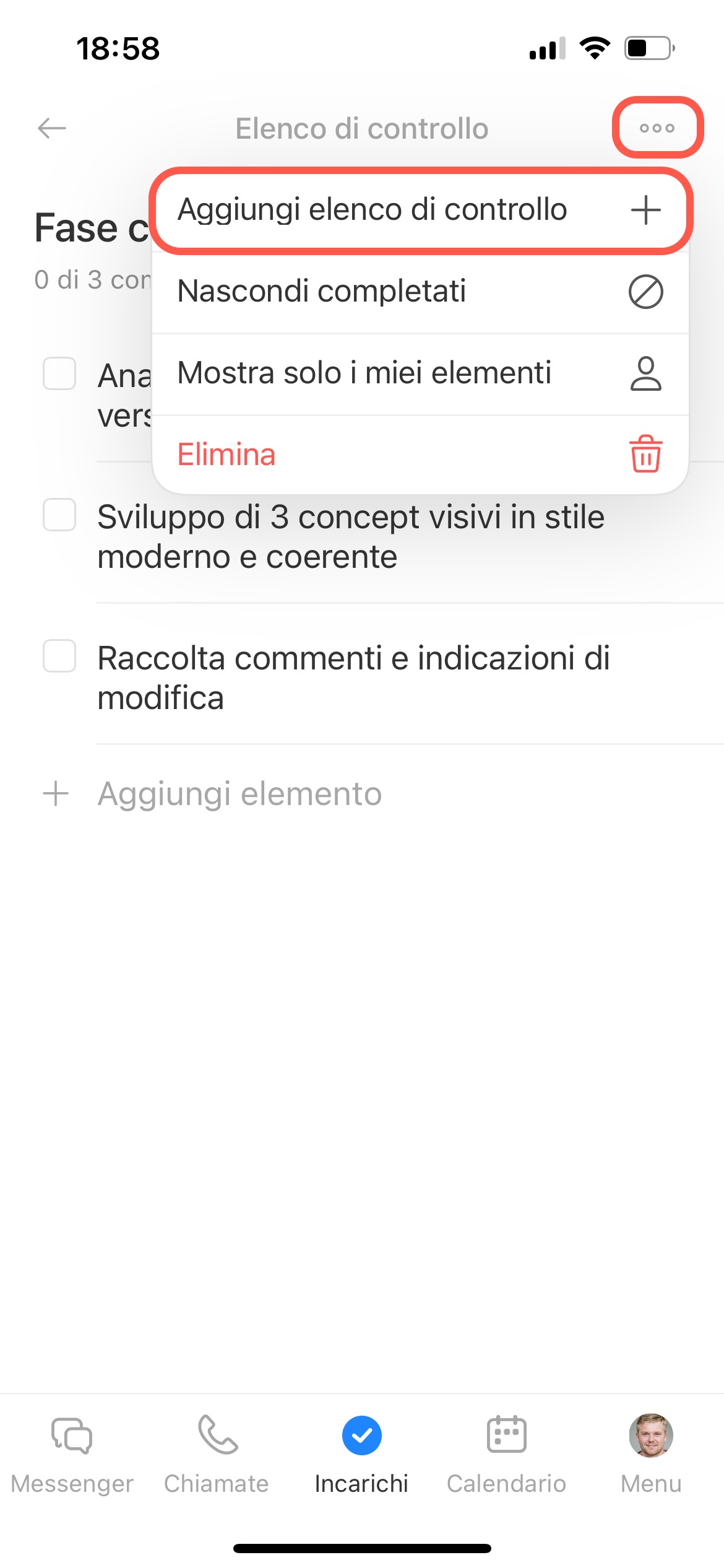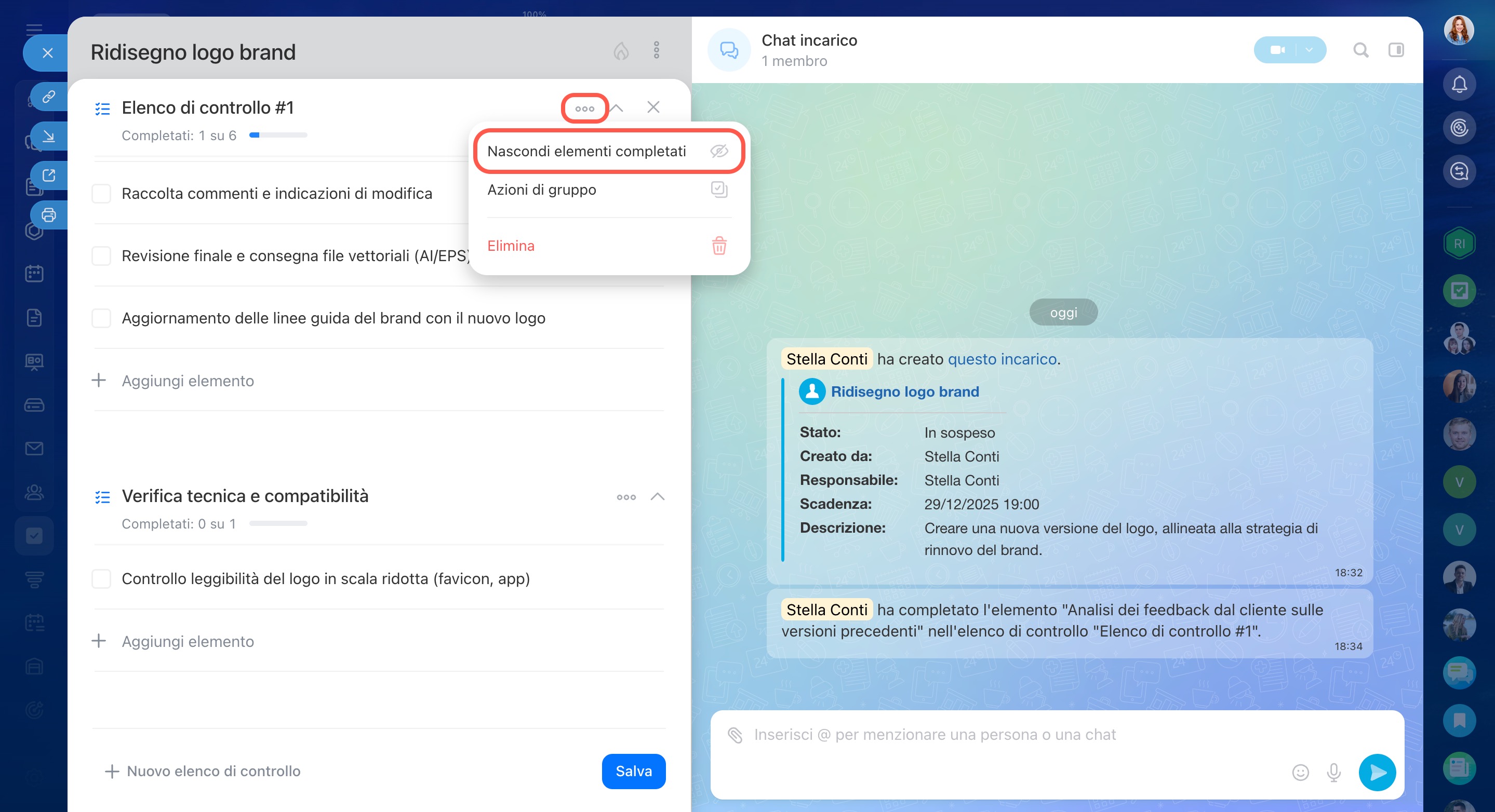 In un incarico puoi creare più elenchi di controllo, aggiornare i punti, contrassegnare quelli completati ed eliminare ciò che non serve più. Questo ti aiuta a mantenere l’incarico ordinato e a concentrarti sulle attività ancora da svolgere.