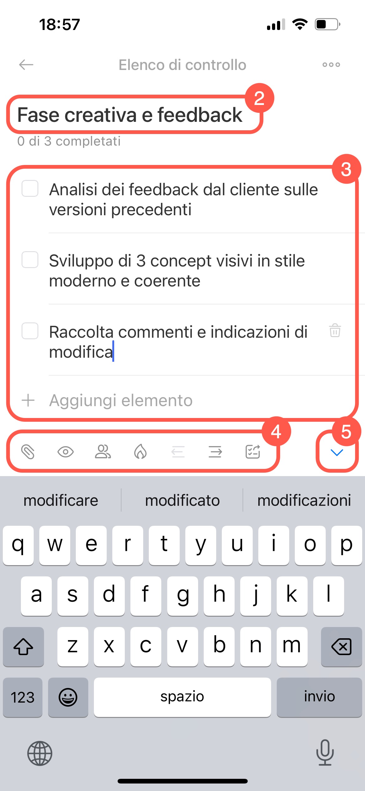 Spostare un punto dell’elenco di controllo. Per cambiare l’ordine dei punti, tieni premuta l’icona di trascinamento accanto al punto e spostalo nella posizione desiderata.