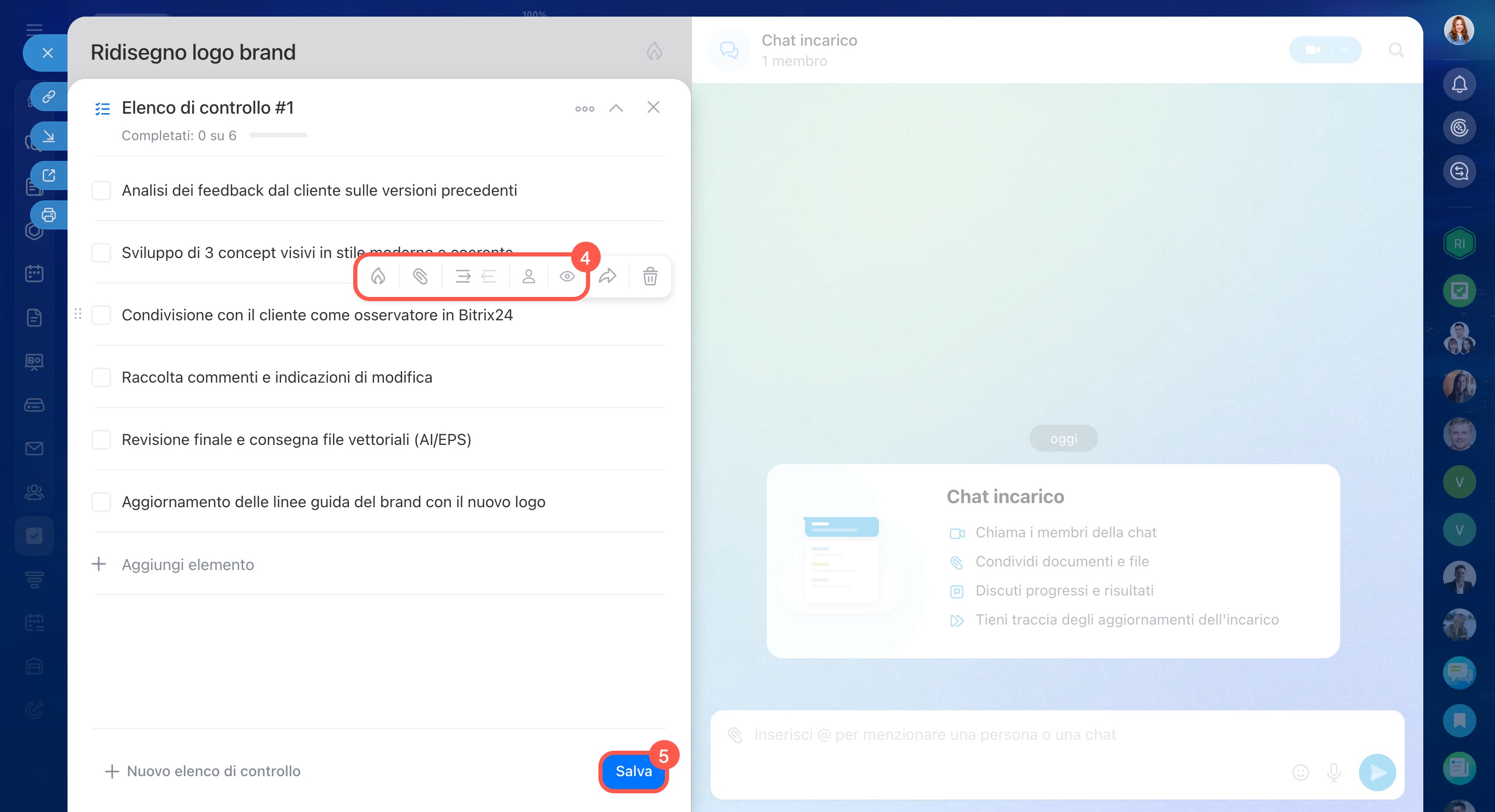 Puoi creare un elenco di controllo in un incarico di Bitrix24 sia dal computer che dall’app mobile. È possibile aggiungerlo durante la creazione di un nuovo incarico oppure a un incarico già esistente.