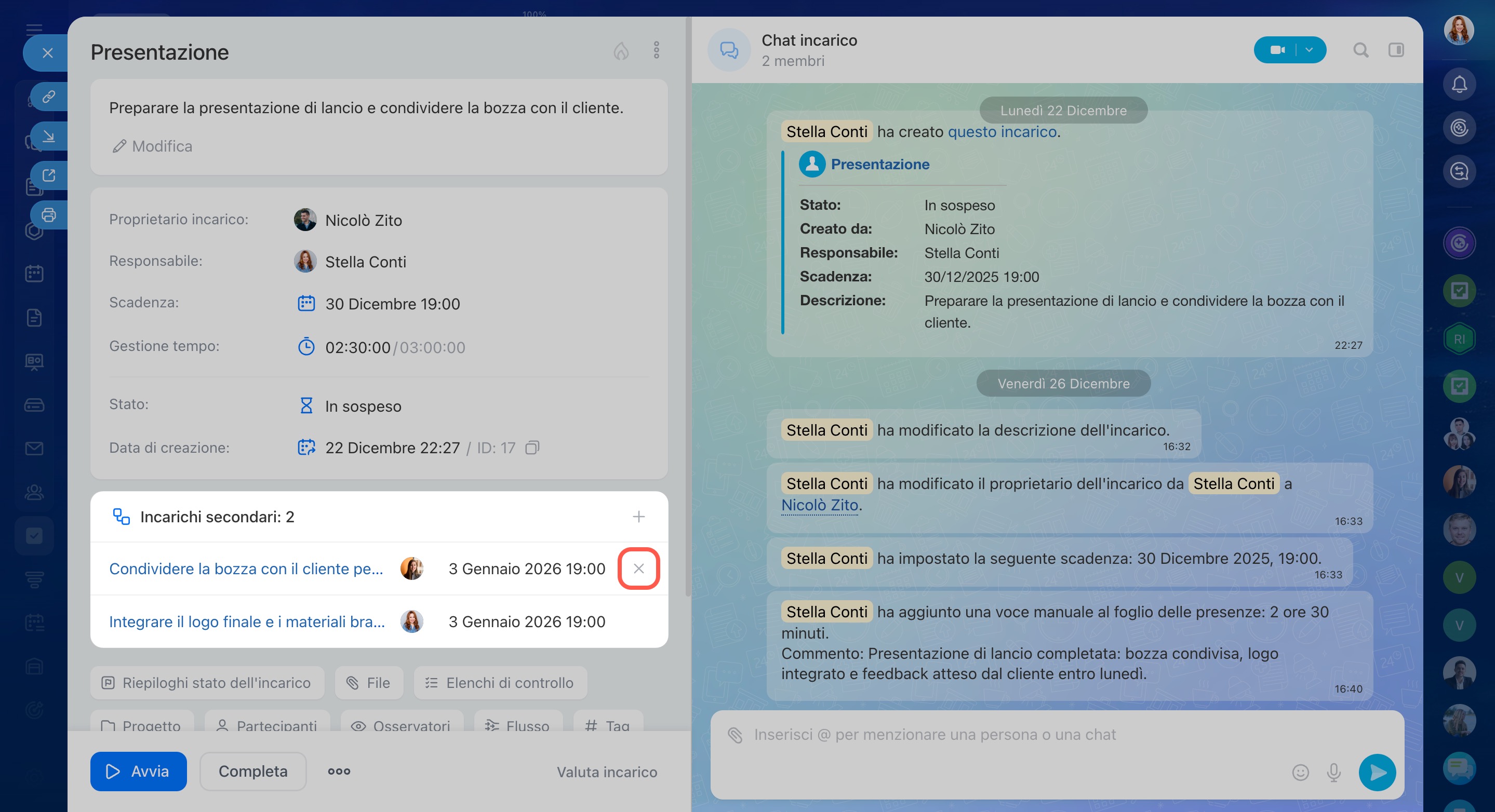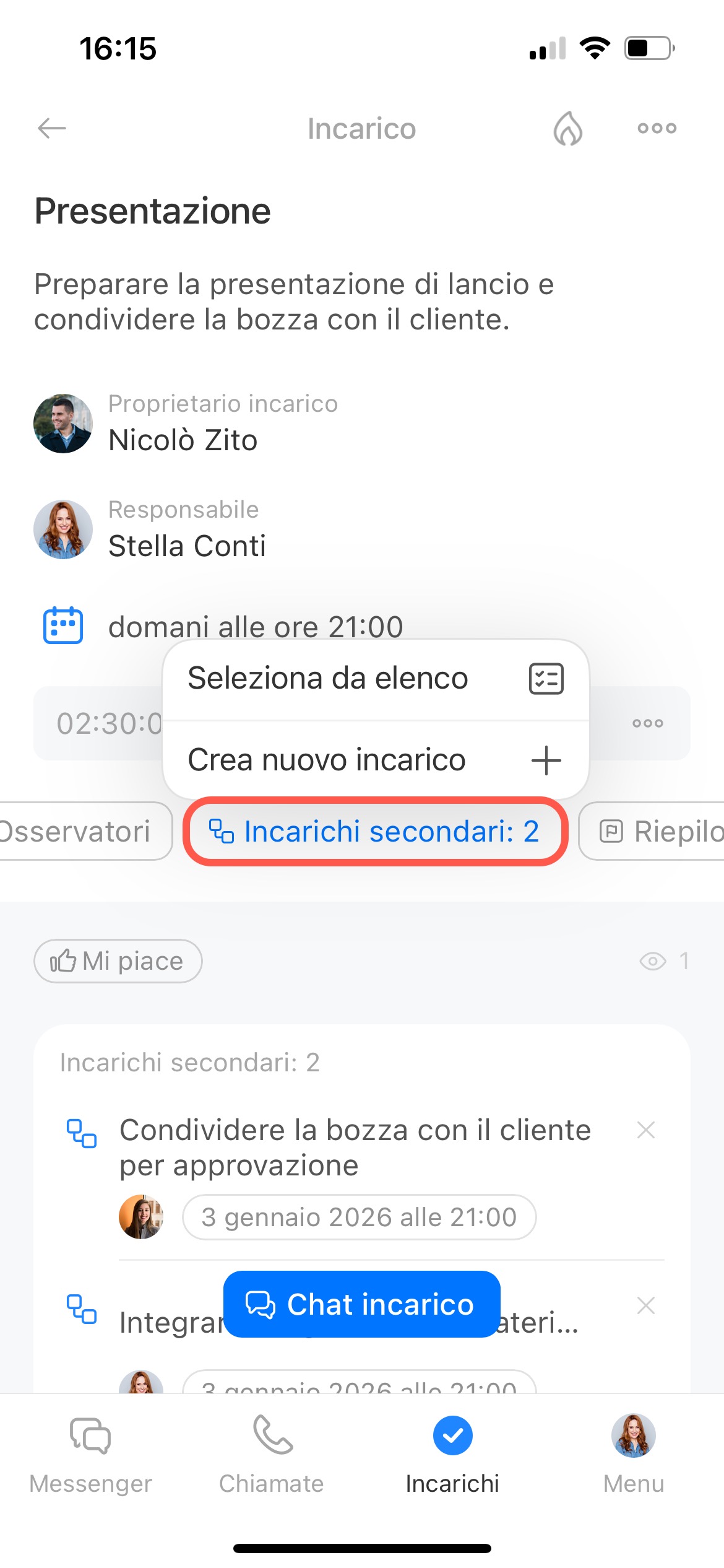 Gli incarichi secondari aiutano a organizzare il lavoro quando un progetto è suddiviso in più fasi. Ogni team o dipendente si occupa della propria parte, mentre il risultato complessivo viene gestito nell’incarico principale. In quest’ultimo è consigliabile indicare l’obiettivo generale del progetto e assegnare come responsabile chi coordina il risultato finale.