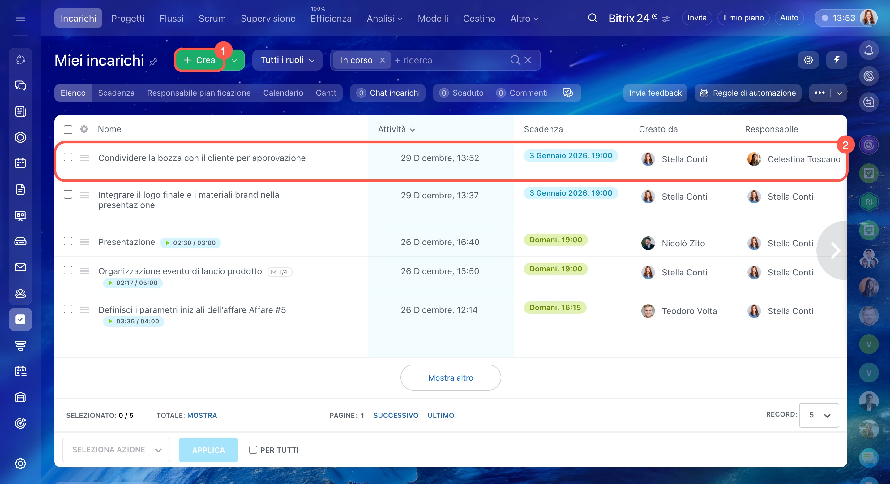 Se un incarico è articolato e composto da più fasi, in Bitrix24 puoi suddividerlo in incarichi secondari. Questa organizzazione permette di distribuire il lavoro tra più dipendenti, seguire ogni fase nel dettaglio e controllare l’avanzamento complessivo.