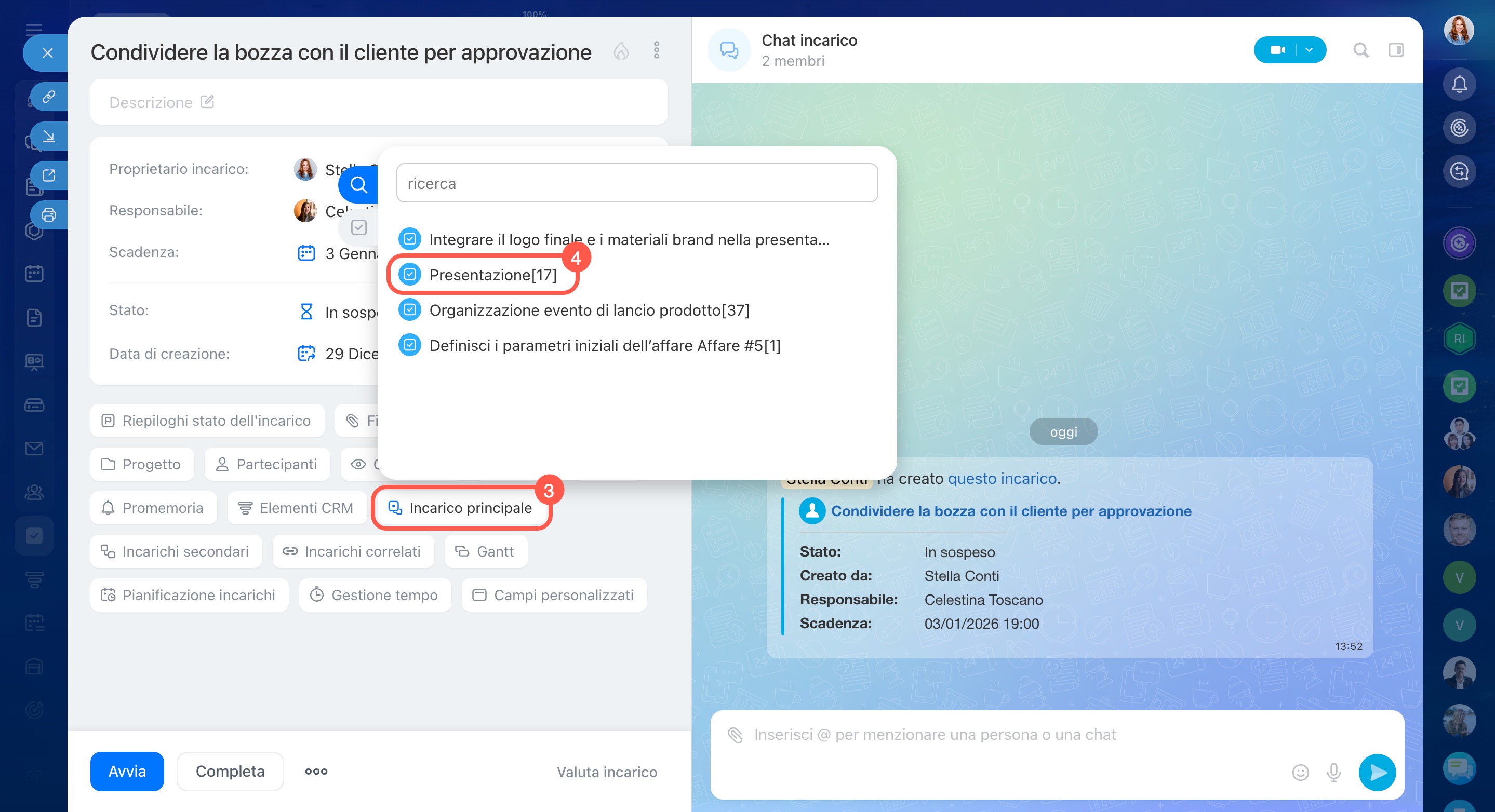 L’incarico che raccoglie tutti quelli secondari si chiama incarico principale. Da qui puoi avere una visione d’insieme del progetto e monitorare i progressi di tutte le attività collegate. Ad esempio, l’incarico principale può essere “Preparare il lancio di una campagna pubblicitaria”, mentre gli incarichi secondari possono includere “Creare i banner”, “Approvare i testi” e “Configurare la pubblicità”.