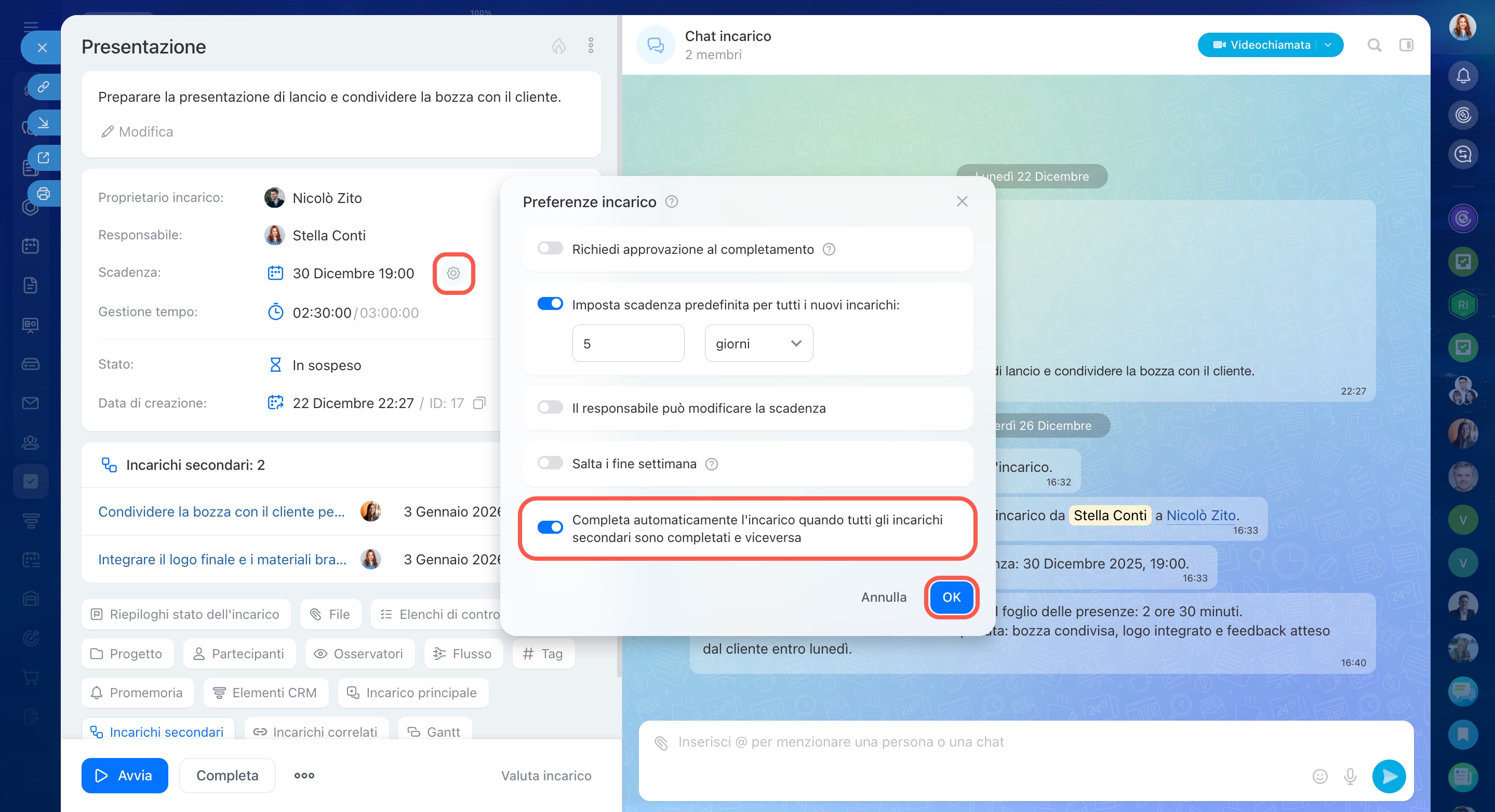 Attivando questa opzione, Bitrix24 chiude automaticamente l’incarico principale al completamento di tutti gli incarichi secondari, e viceversa.