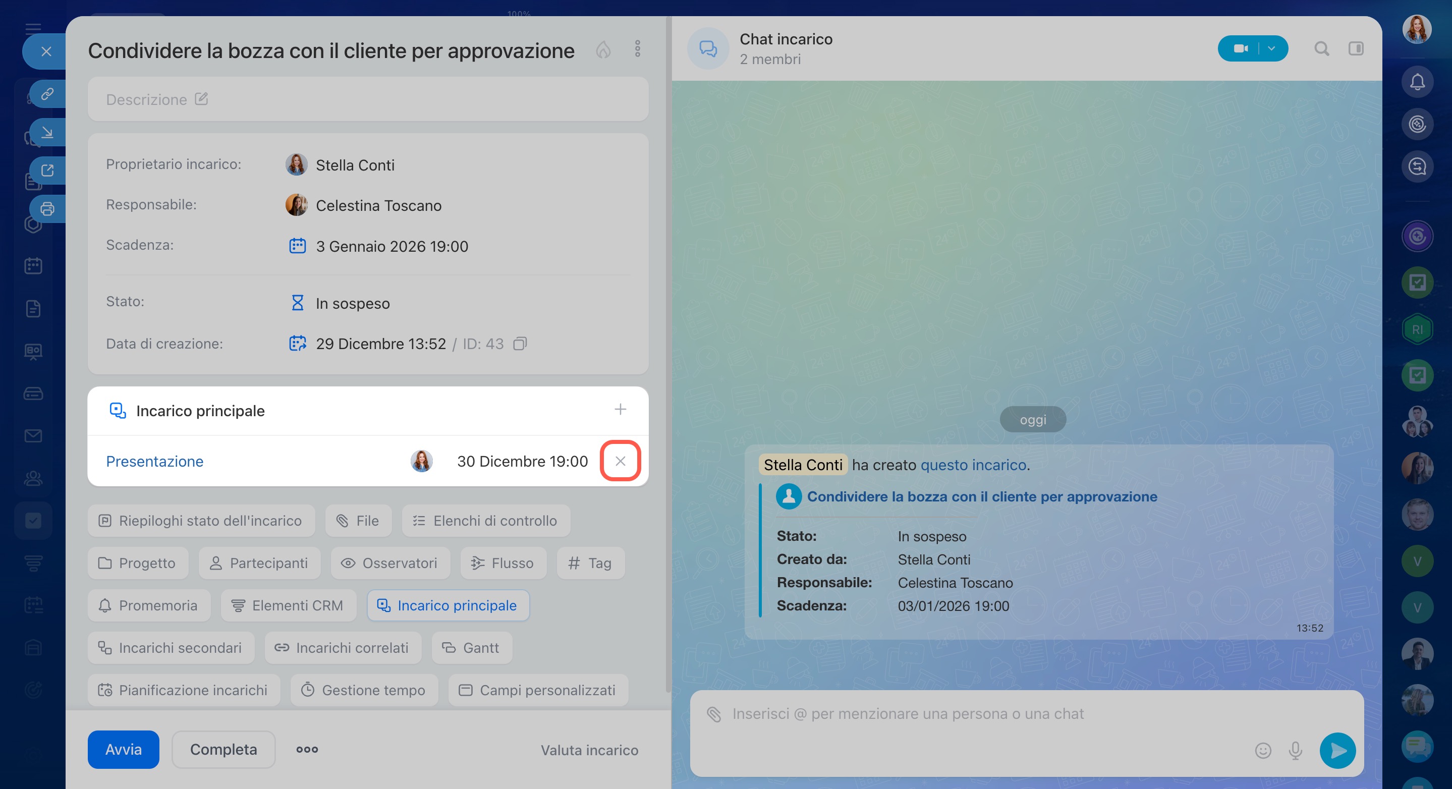 Se un incarico secondario non è più collegato al progetto principale, può essere reso indipendente. Puoi farlo sia dalla scheda dell’incarico principale sia da quella dell’incarico secondario.