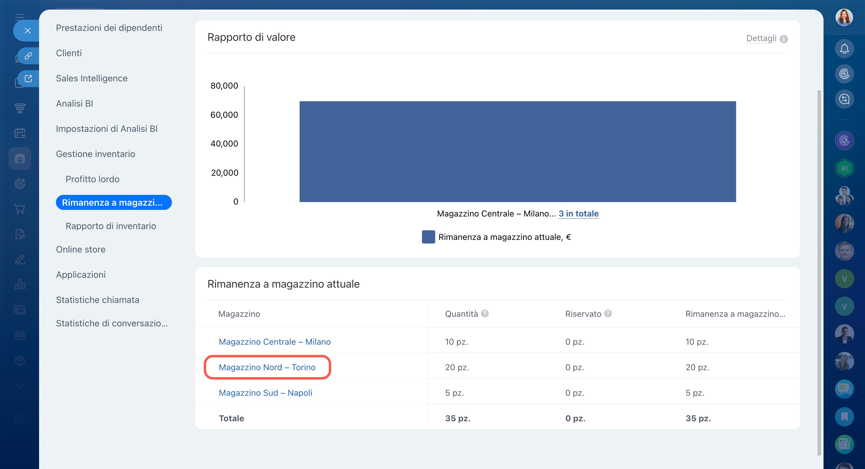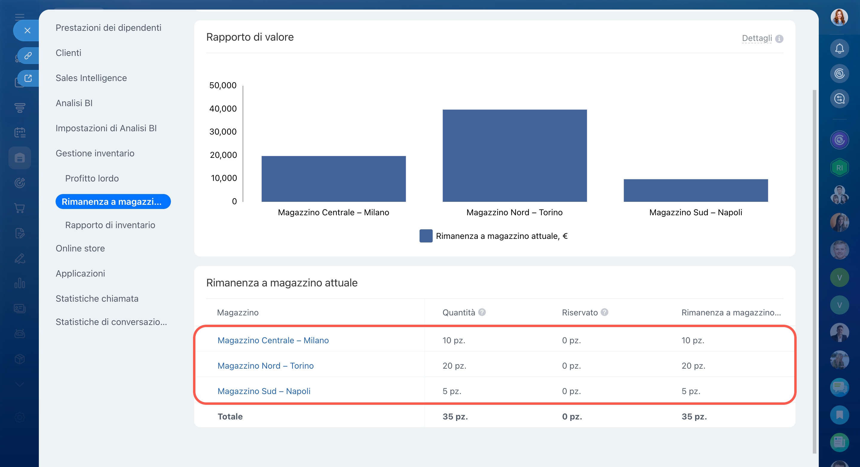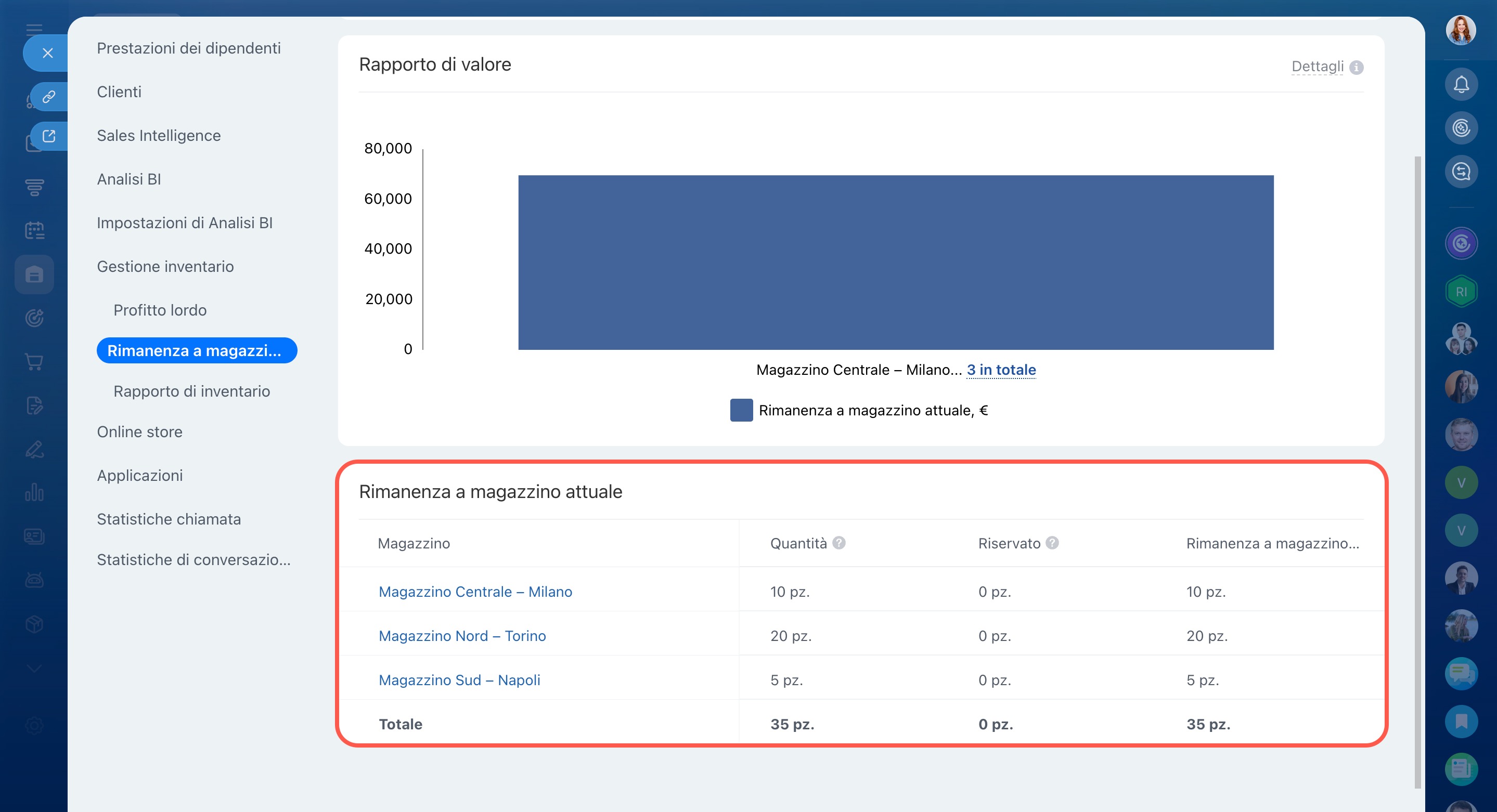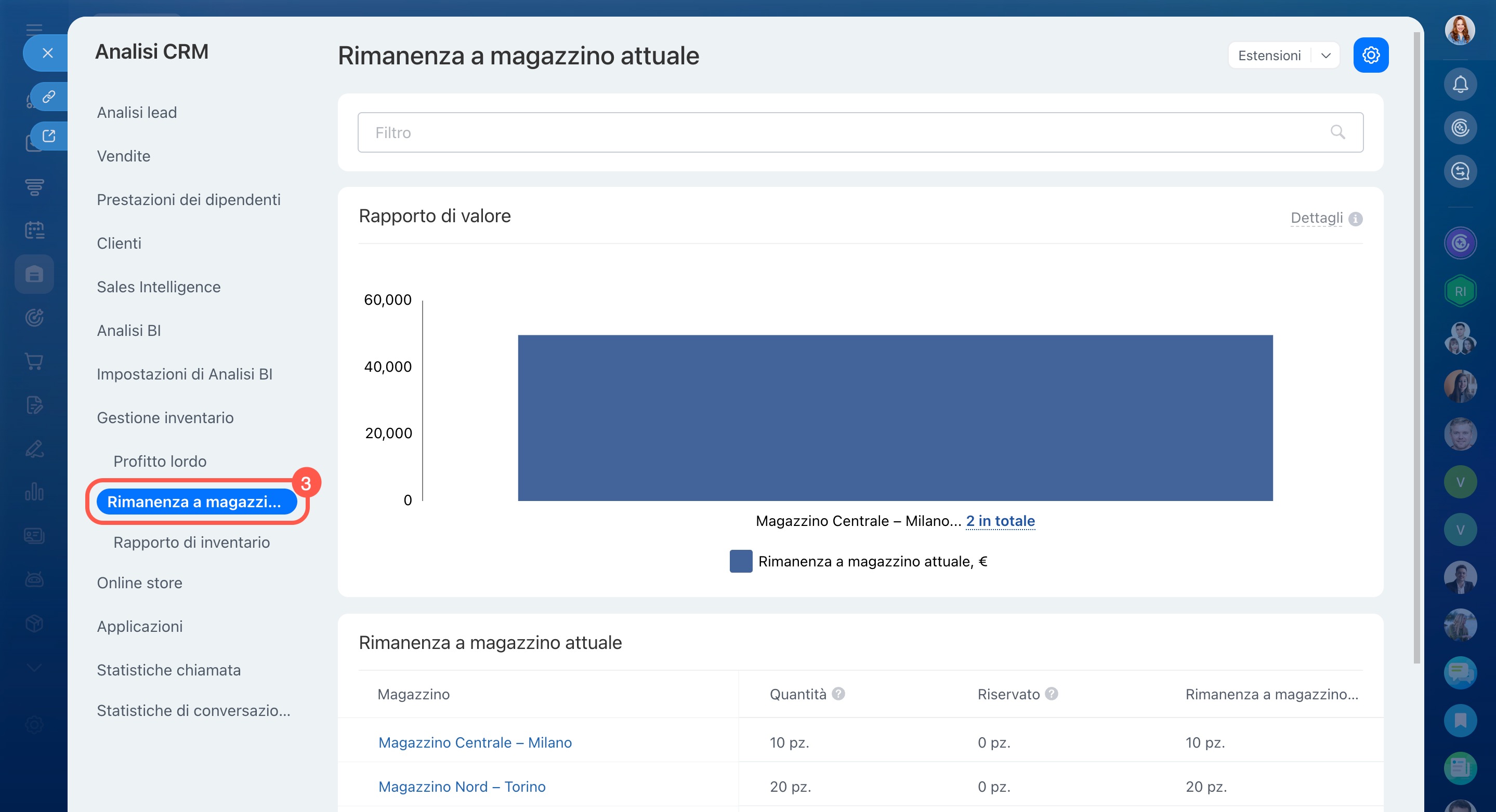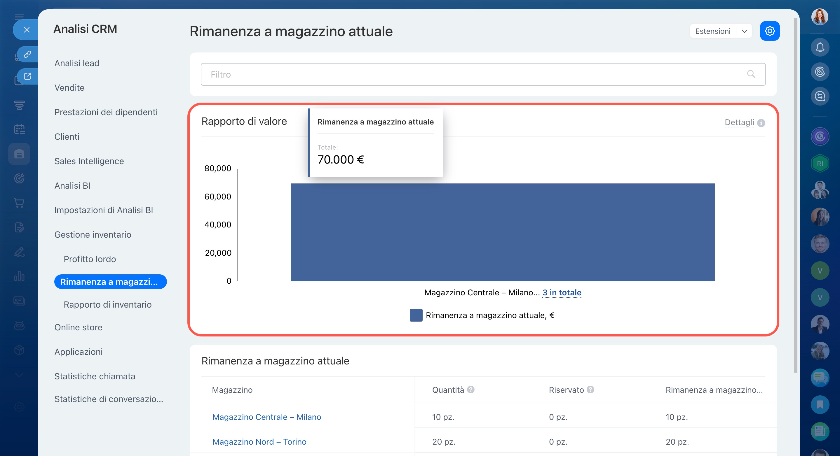 Il rapporto mostra quanti prodotti sono disponibili in ciascun magazzino, quanti sono già riservati negli affari e quale quantità può essere venduta. Questi dati aiutano a individuare eventuali carenze, pianificare gli acquisti e decidere quando trasferire i prodotti tra i magazzini.