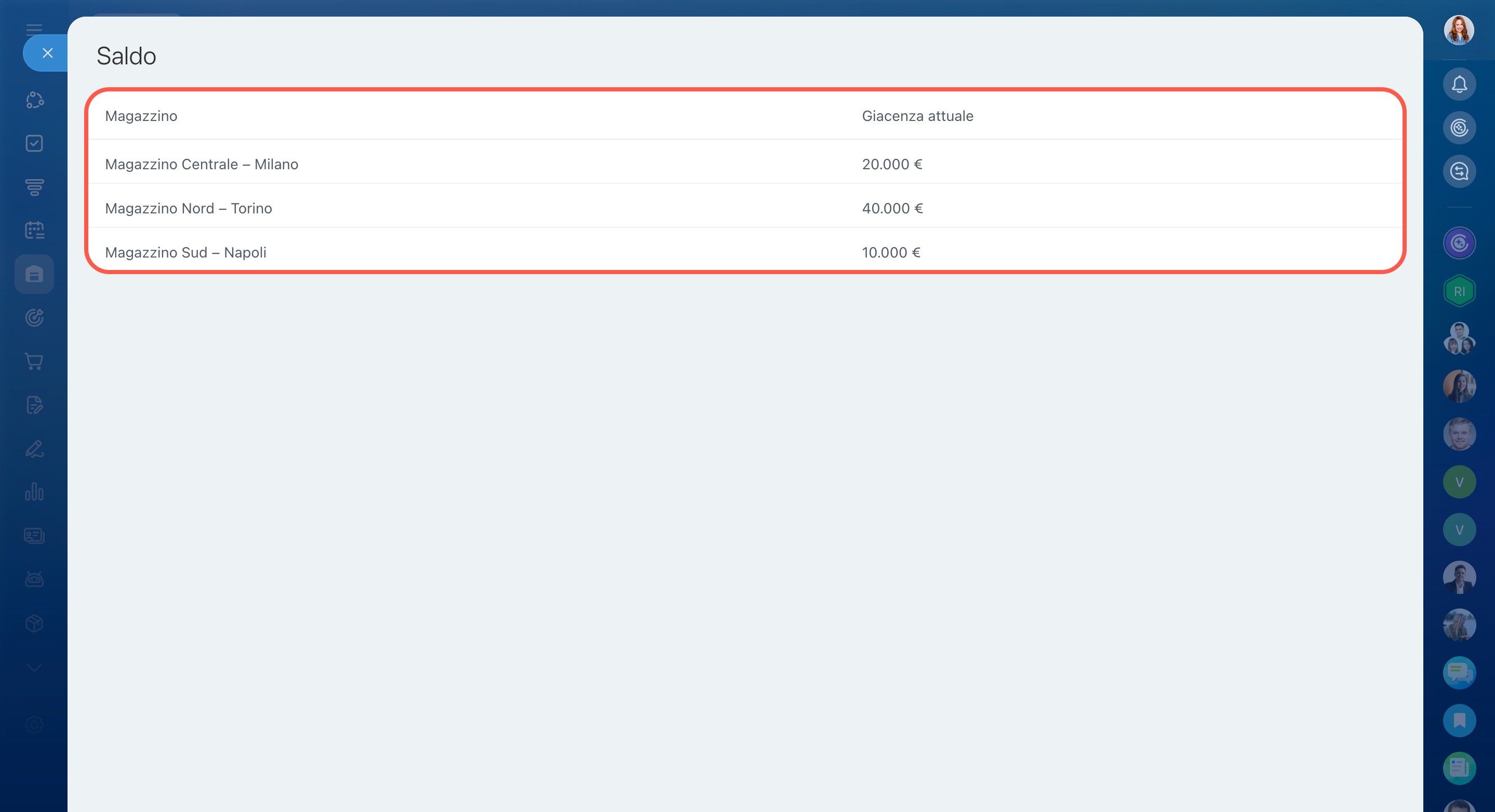 Per ogni magazzino puoi consultare informazioni più dettagliate sui prodotti conservati. Fai clic sul nome del magazzino per aprire una tabella con quantità, riserve e disponibilità dei singoli articoli. Utili per pianificare gli acquisti o riorganizzare le scorte.