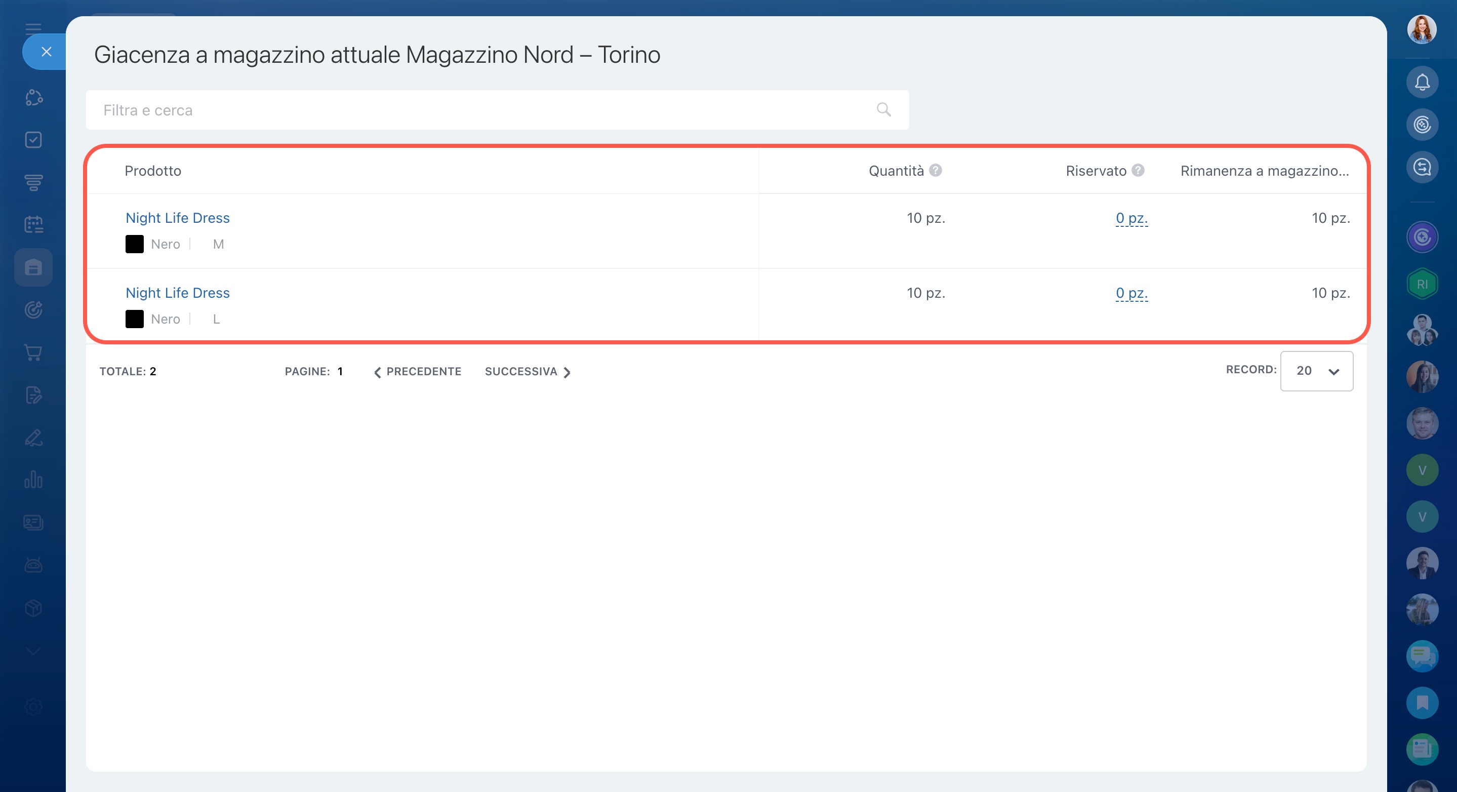 - Rimanenza a magazzino disponibile — è la differenza tra quantità e riserve. Rappresenta i prodotti che possono essere venduti o riservati.