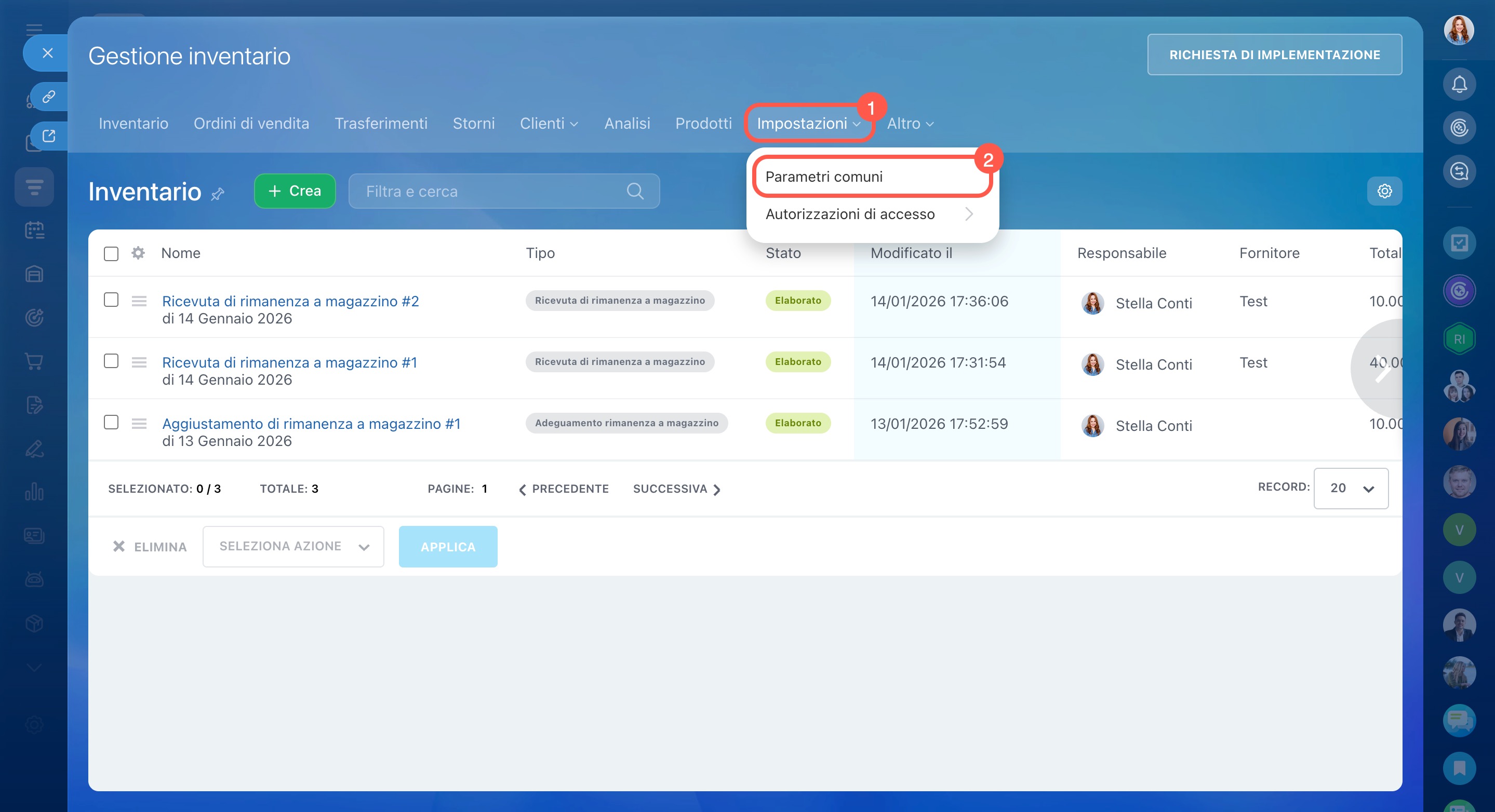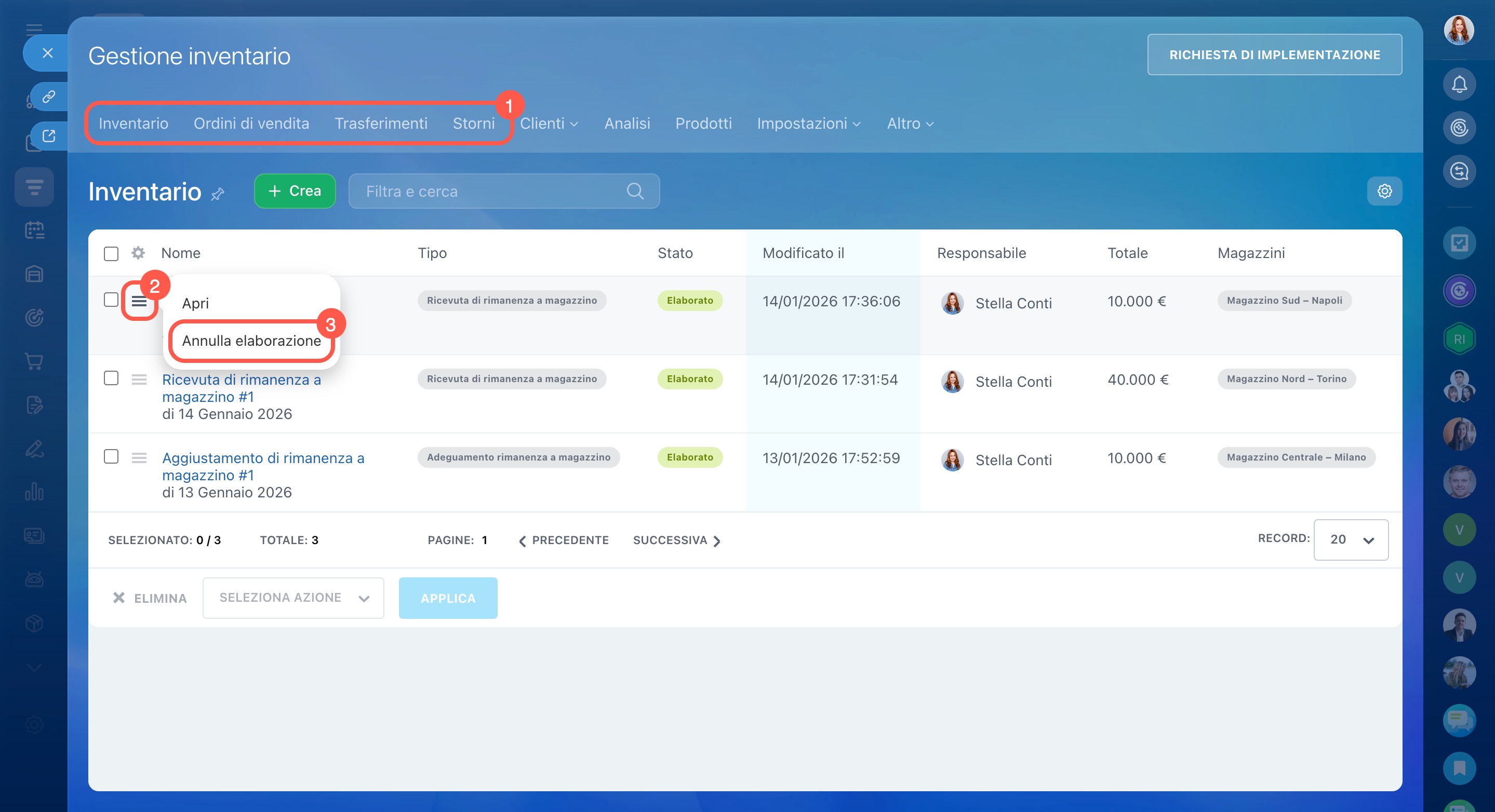 La Gestione inventario mostra quanti prodotti sono disponibili in ciascun magazzino e registra i movimenti: arrivi, vendite, storni e trasferimenti.