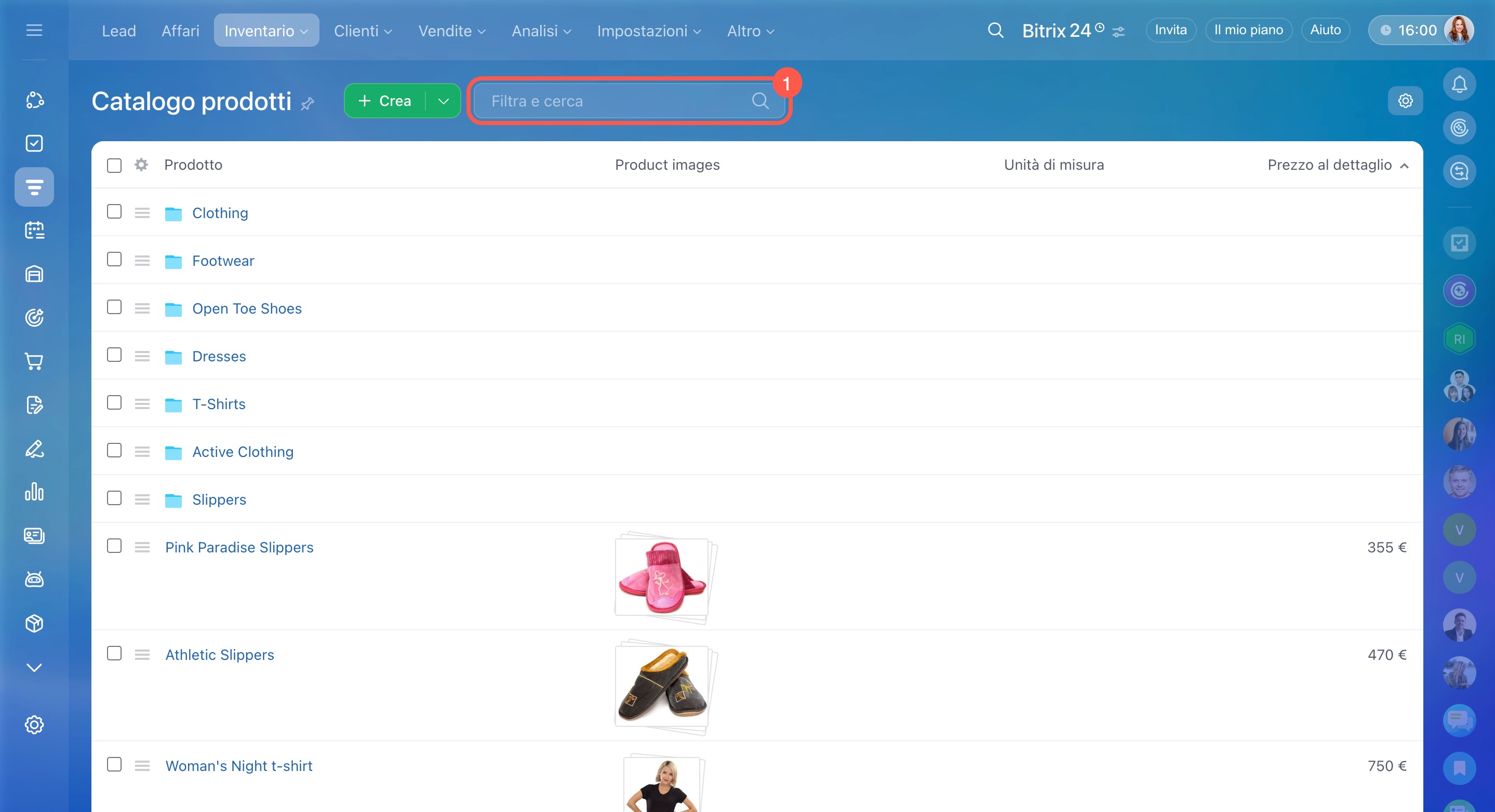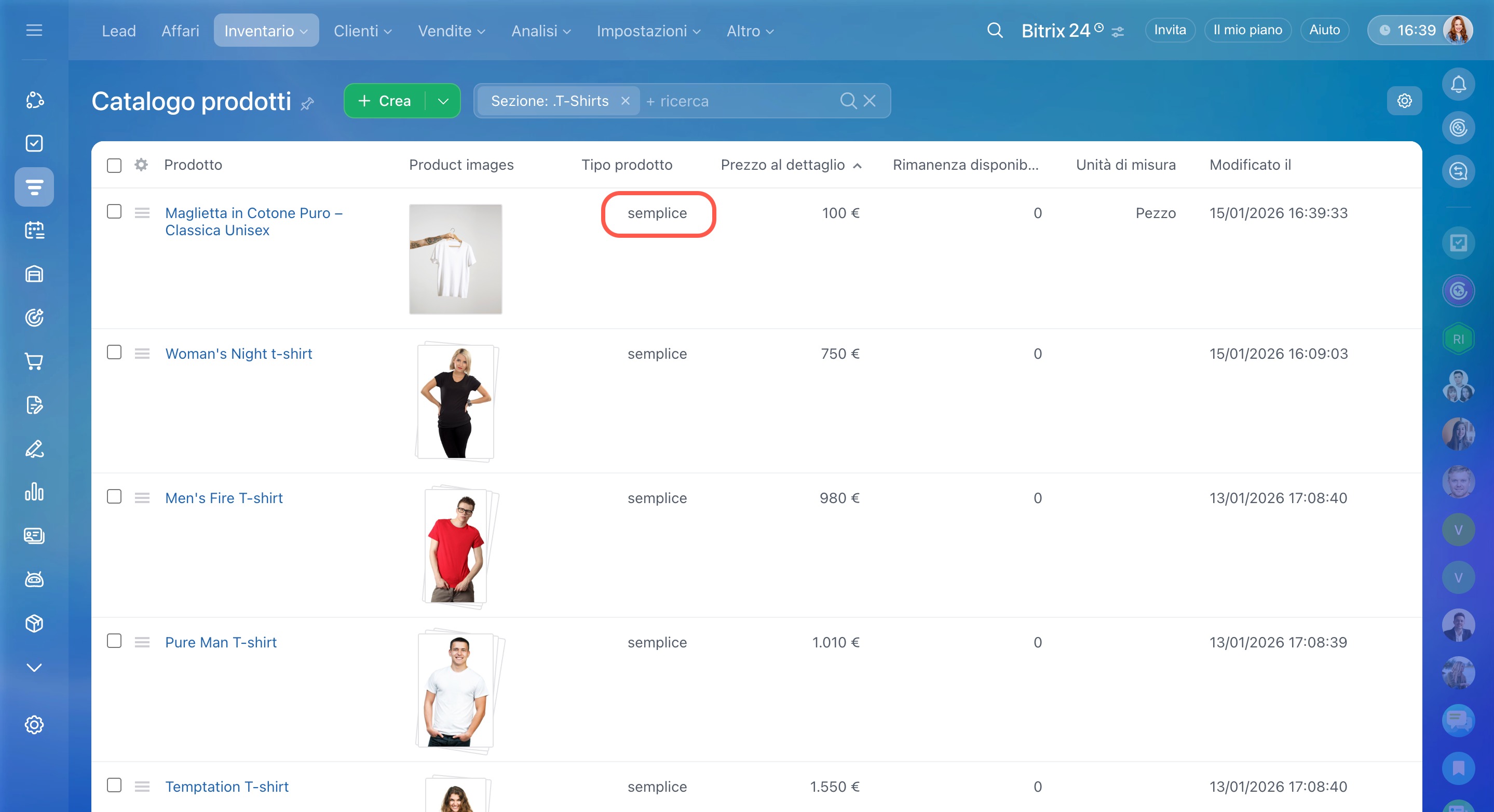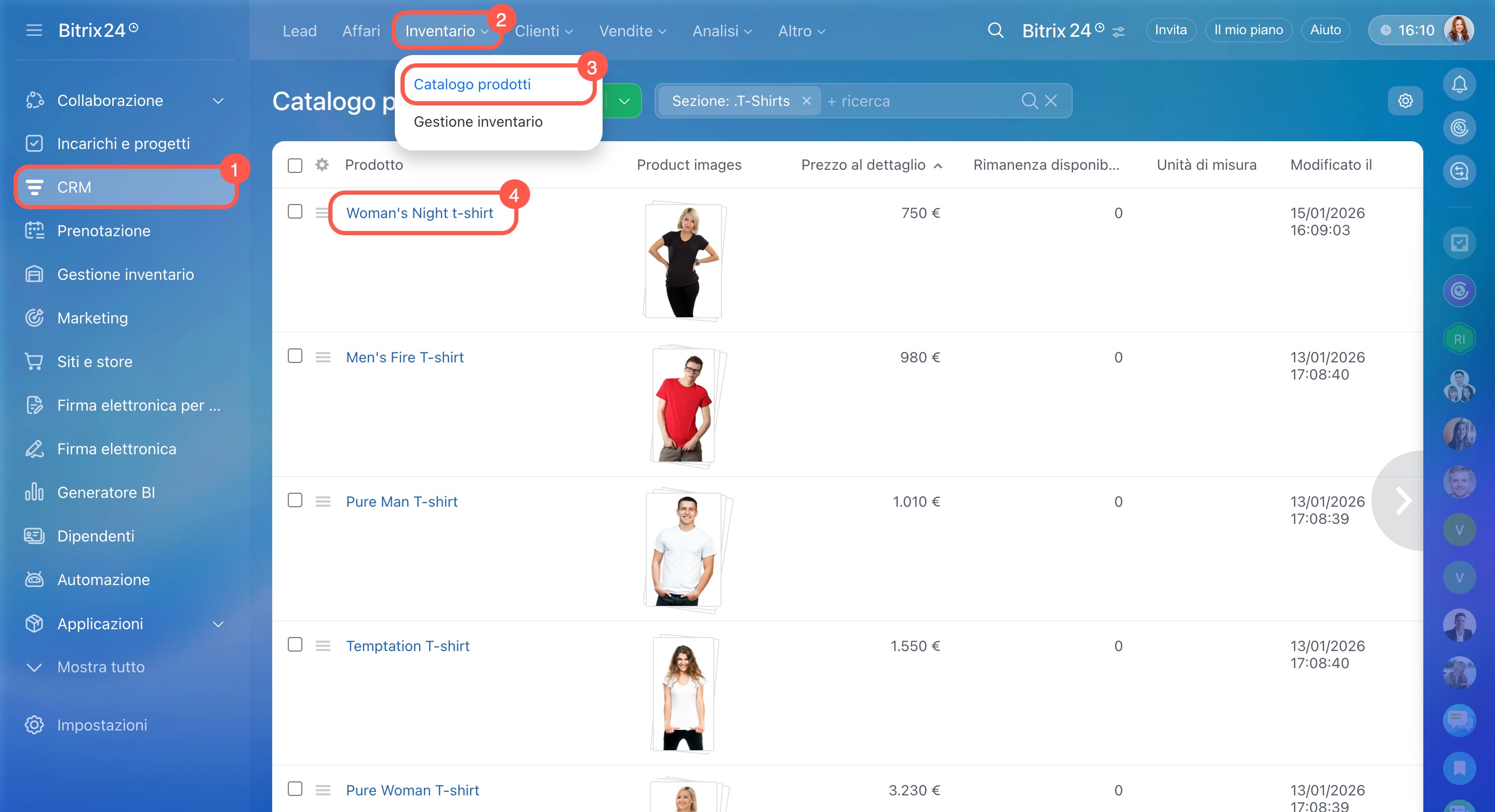 - Vai su CRM > Inventario > Catalogo prodotti e seleziona il prodotto desiderato.