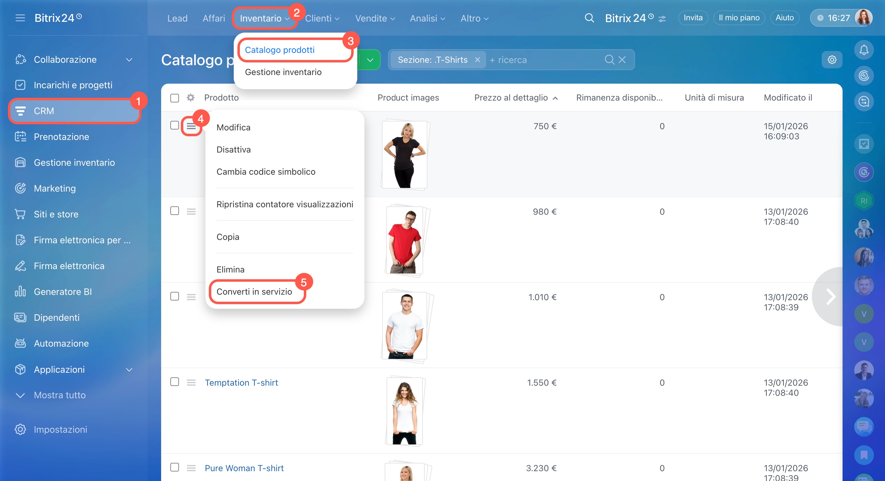 Per effettuare la conversione, vai su CRM > Inventario > Catalogo prodotti. Seleziona l’articolo nel catalogo, apri Menu (≡) e fai clic su Converti in servizio o Converti in prodotto, in base alle tue esigenze.