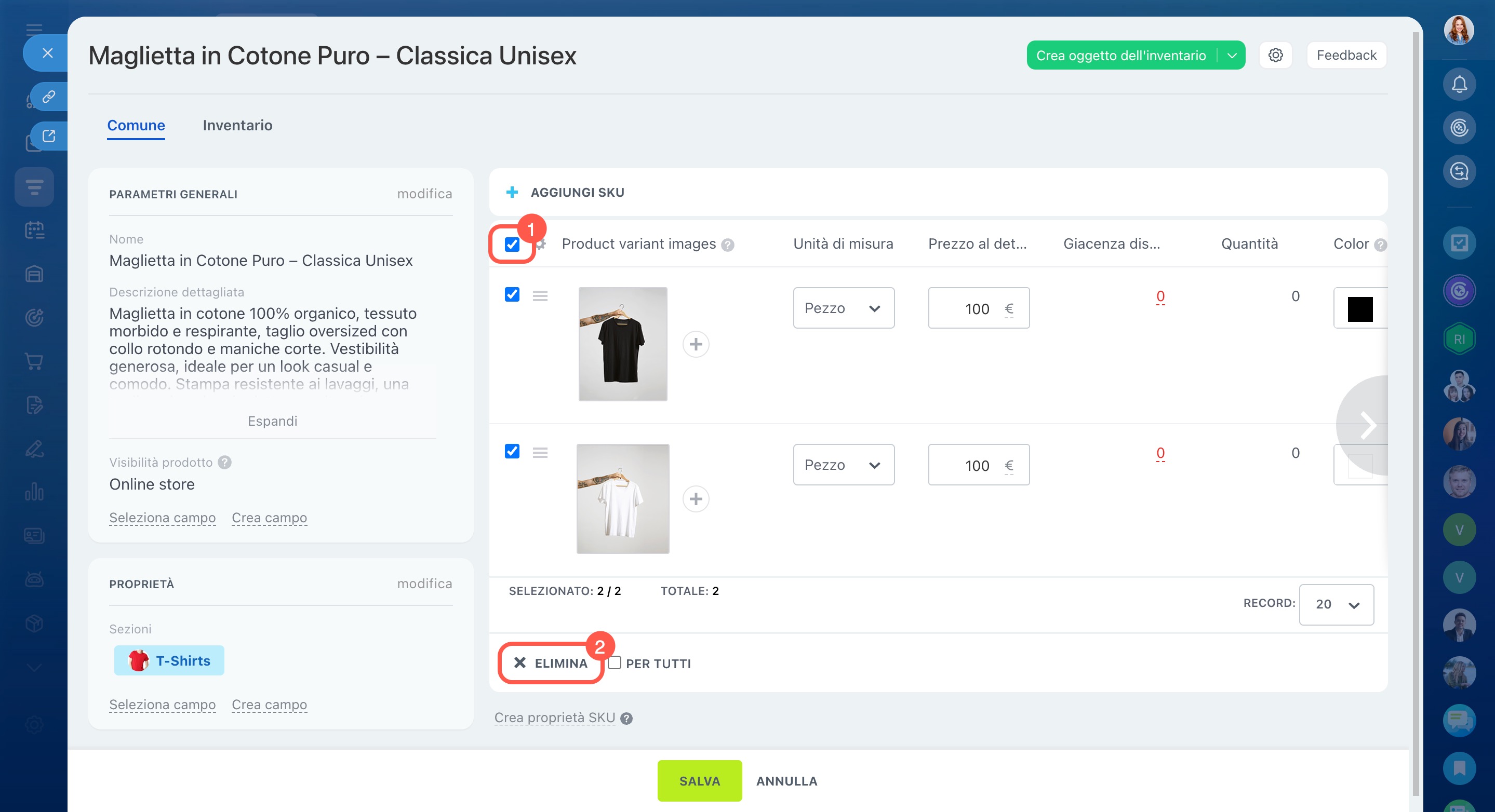 Per impostazione predefinita, in Bitrix24 tutti i prodotti vengono creati con varianti. Ogni variante è gestita come uno SKU ed è visibile nella scheda Varianti del prodotto.