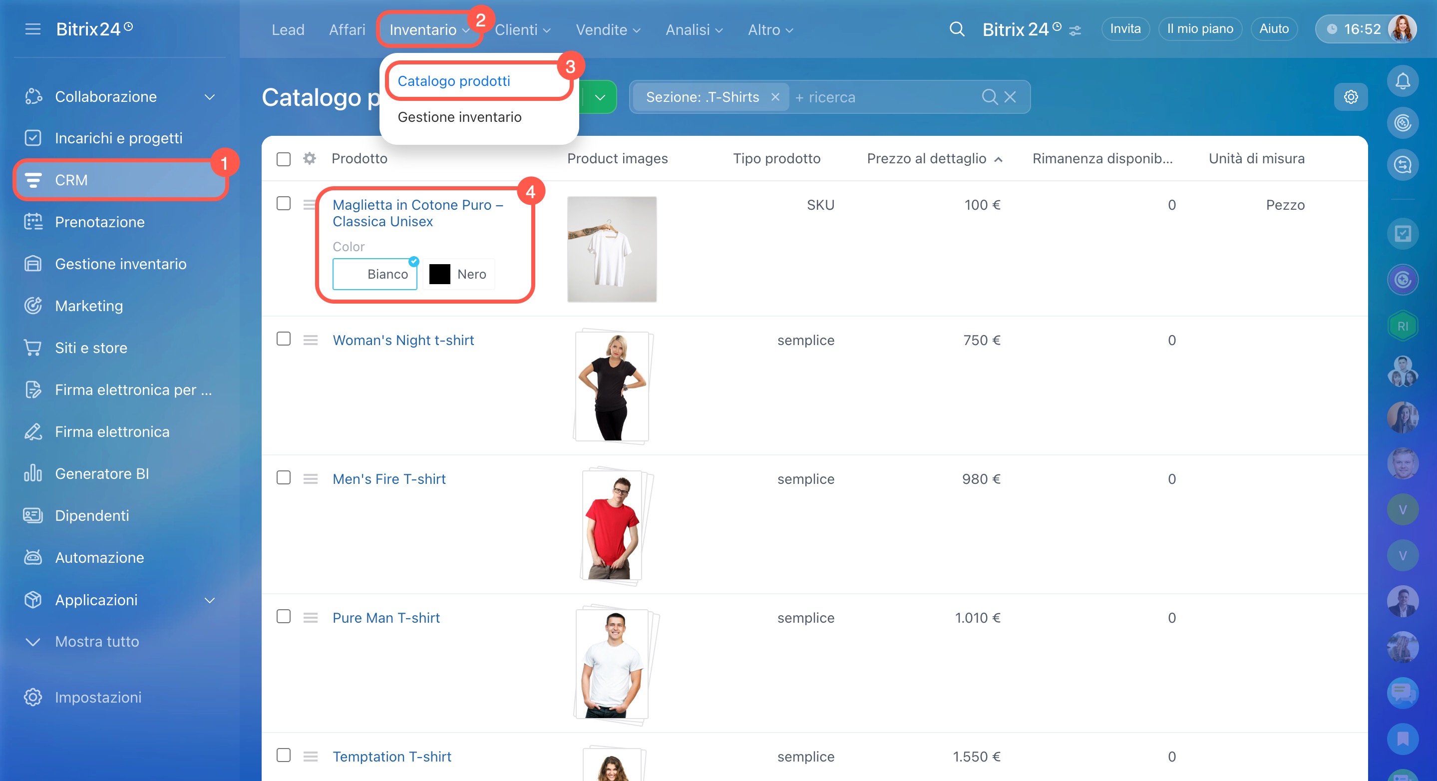 - Vai su CRM > Inventario > Catalogo prodotti e seleziona un prodotto con varianti.